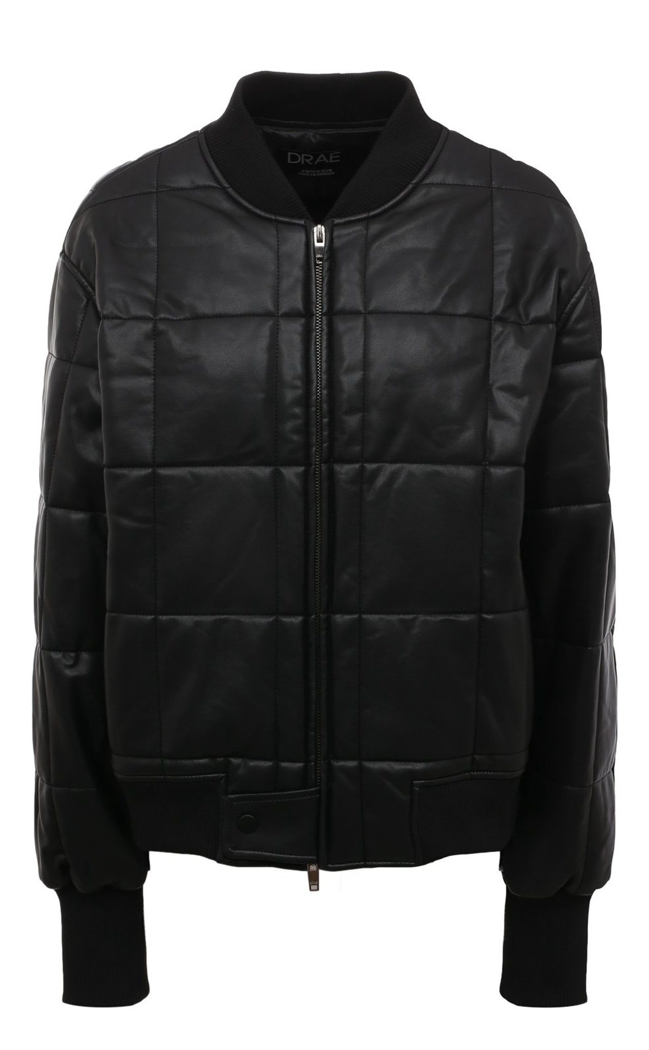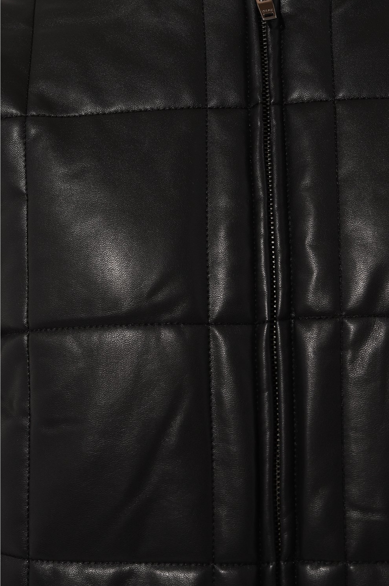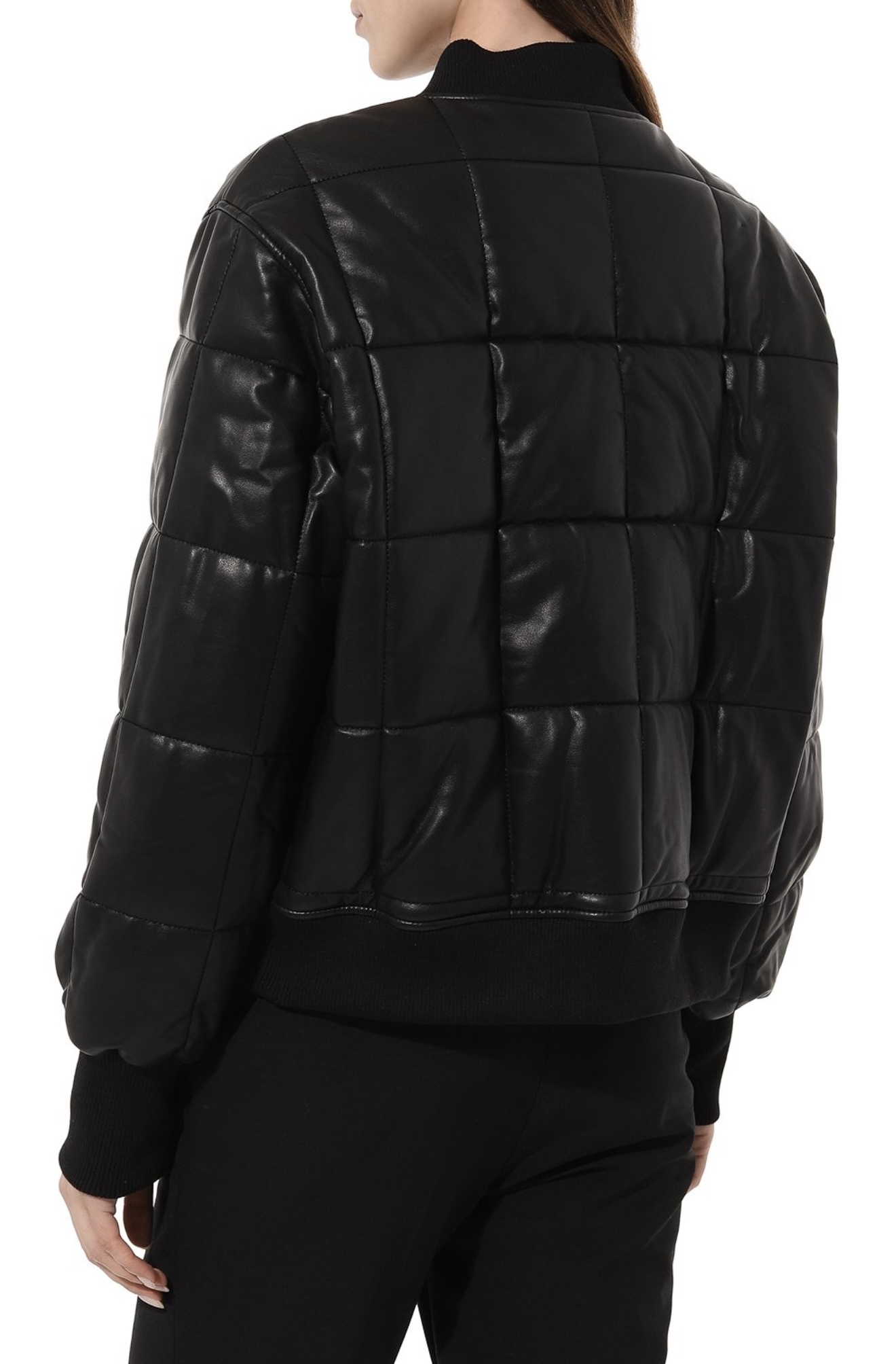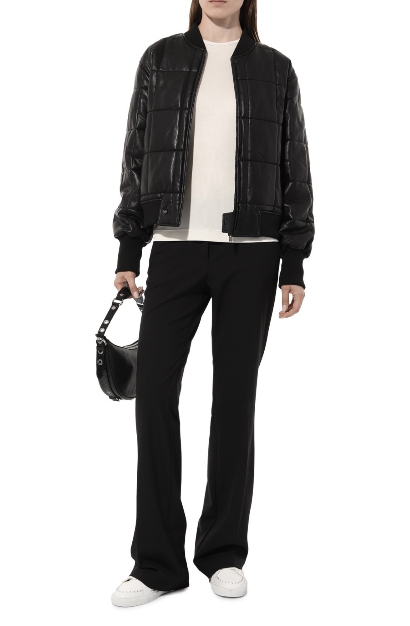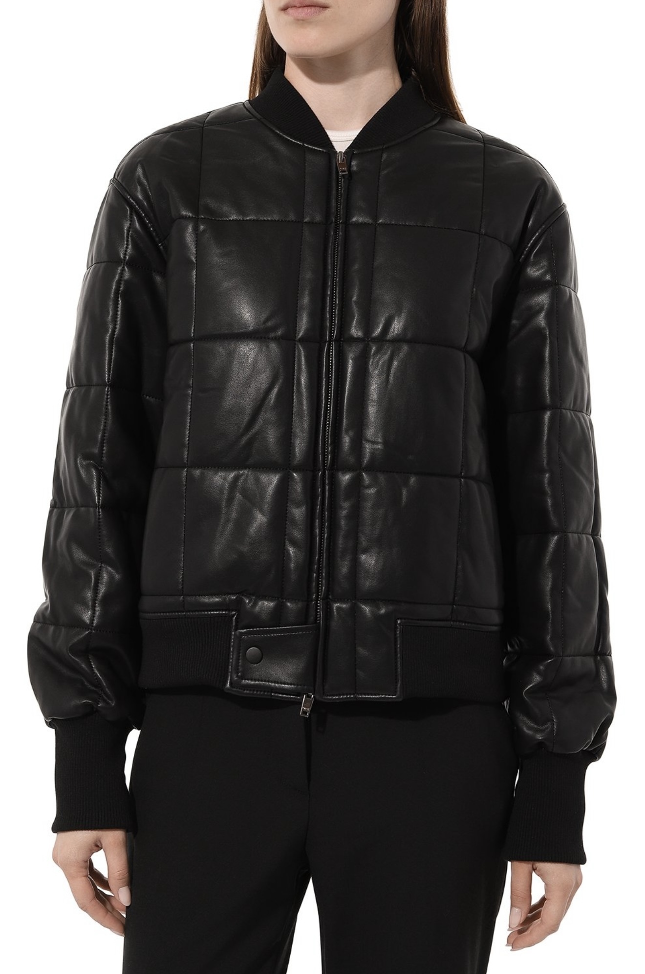 Для пошива черного бомбера мастера марки использовали плотный материал, стилизованный под мелкозернистую кожу с легким блеском. Небольшой воротник-стойку, широкие пояс и манжеты выполнили из мягкого эластичного трикотажа. Стеганую куртку дополнили тонким слоем утеплителя, поэтому в ней будет комфортно в прохладную погоду.