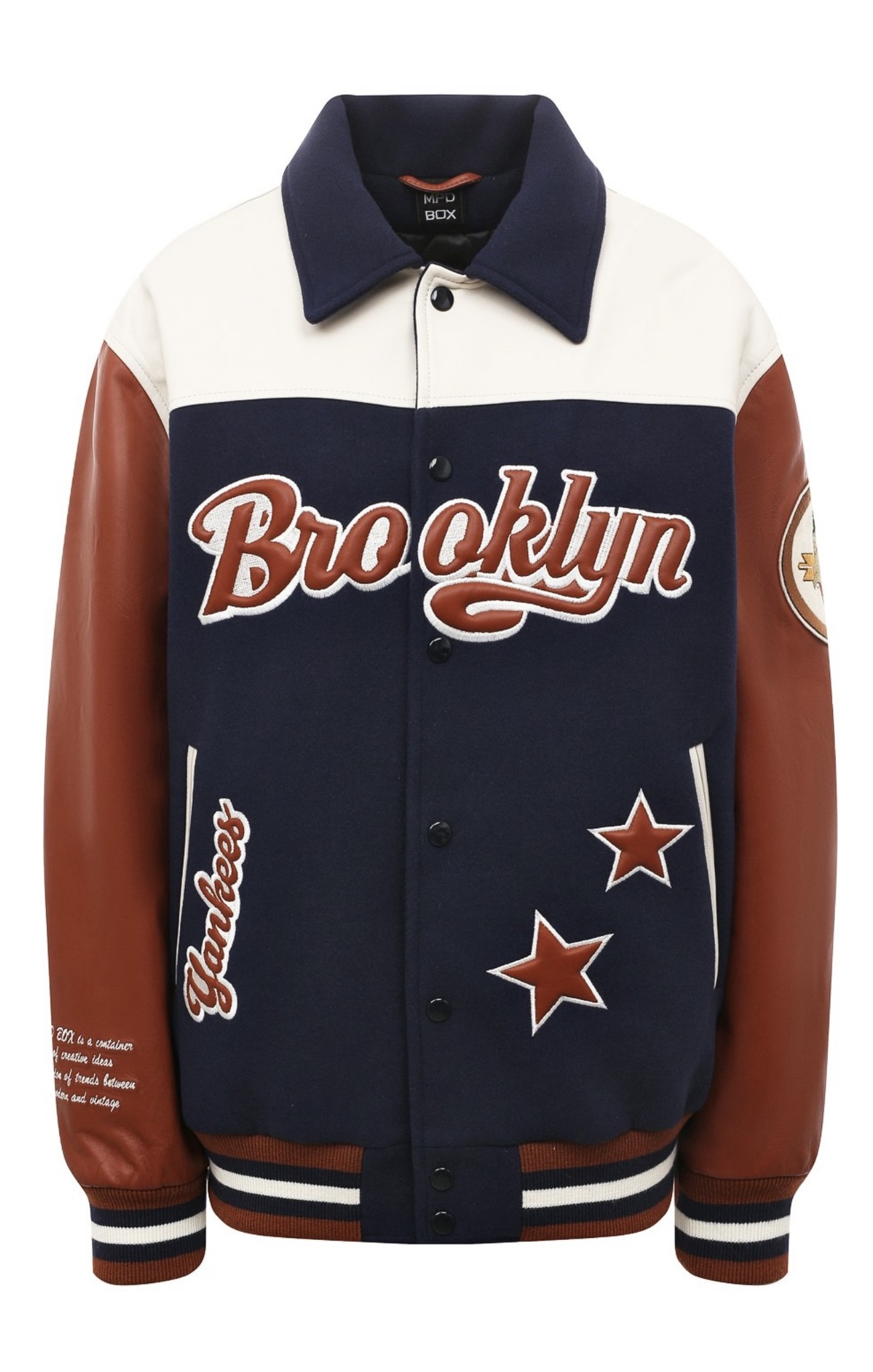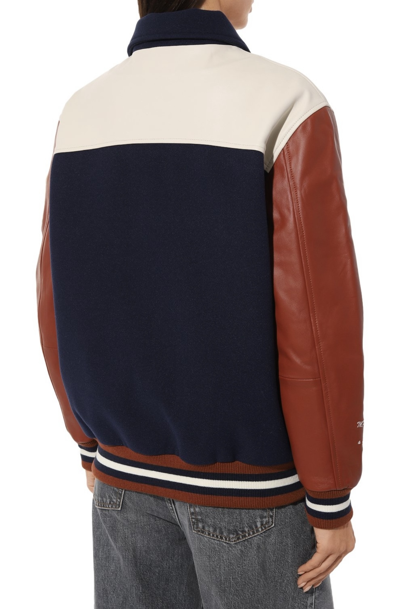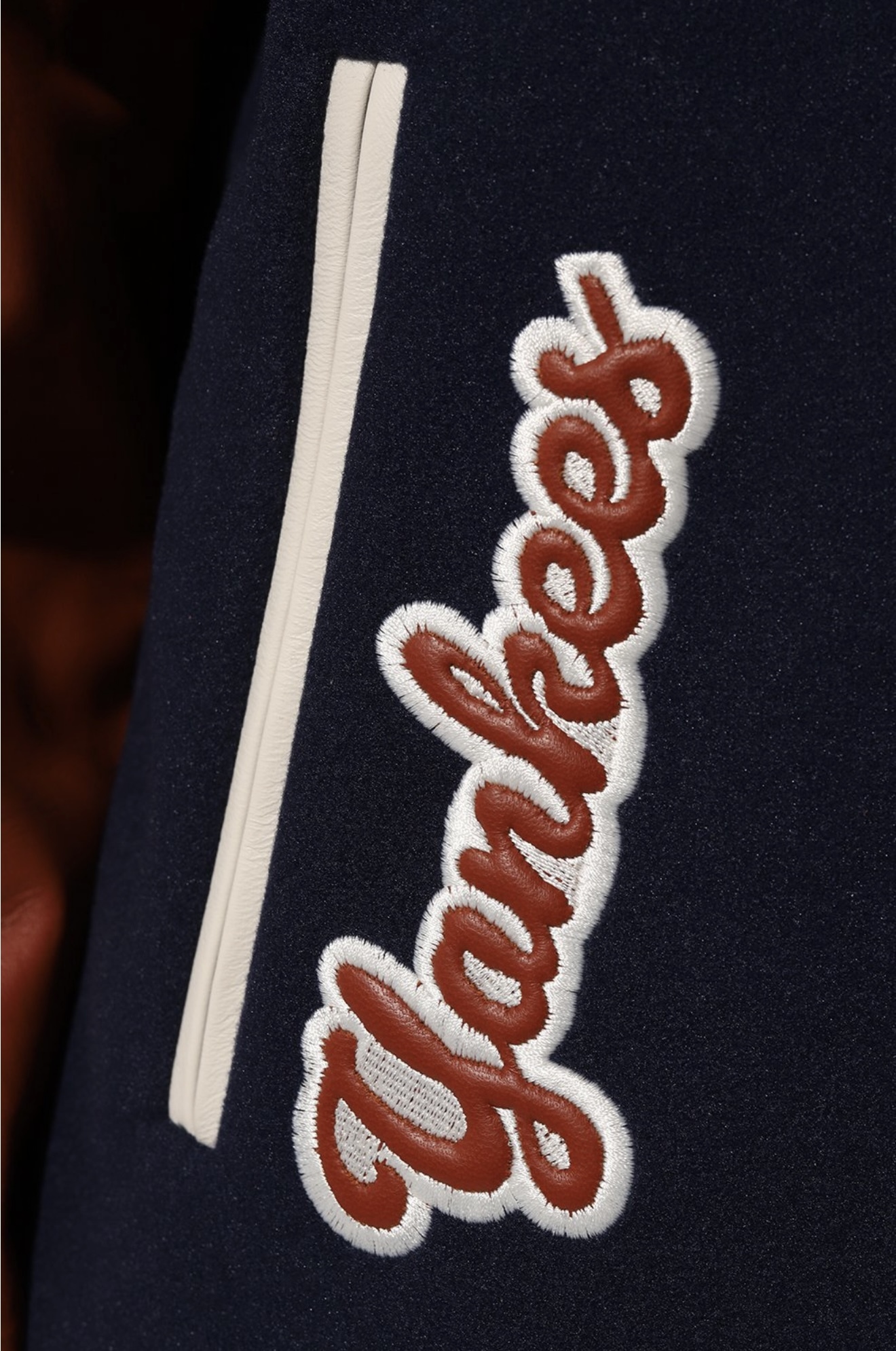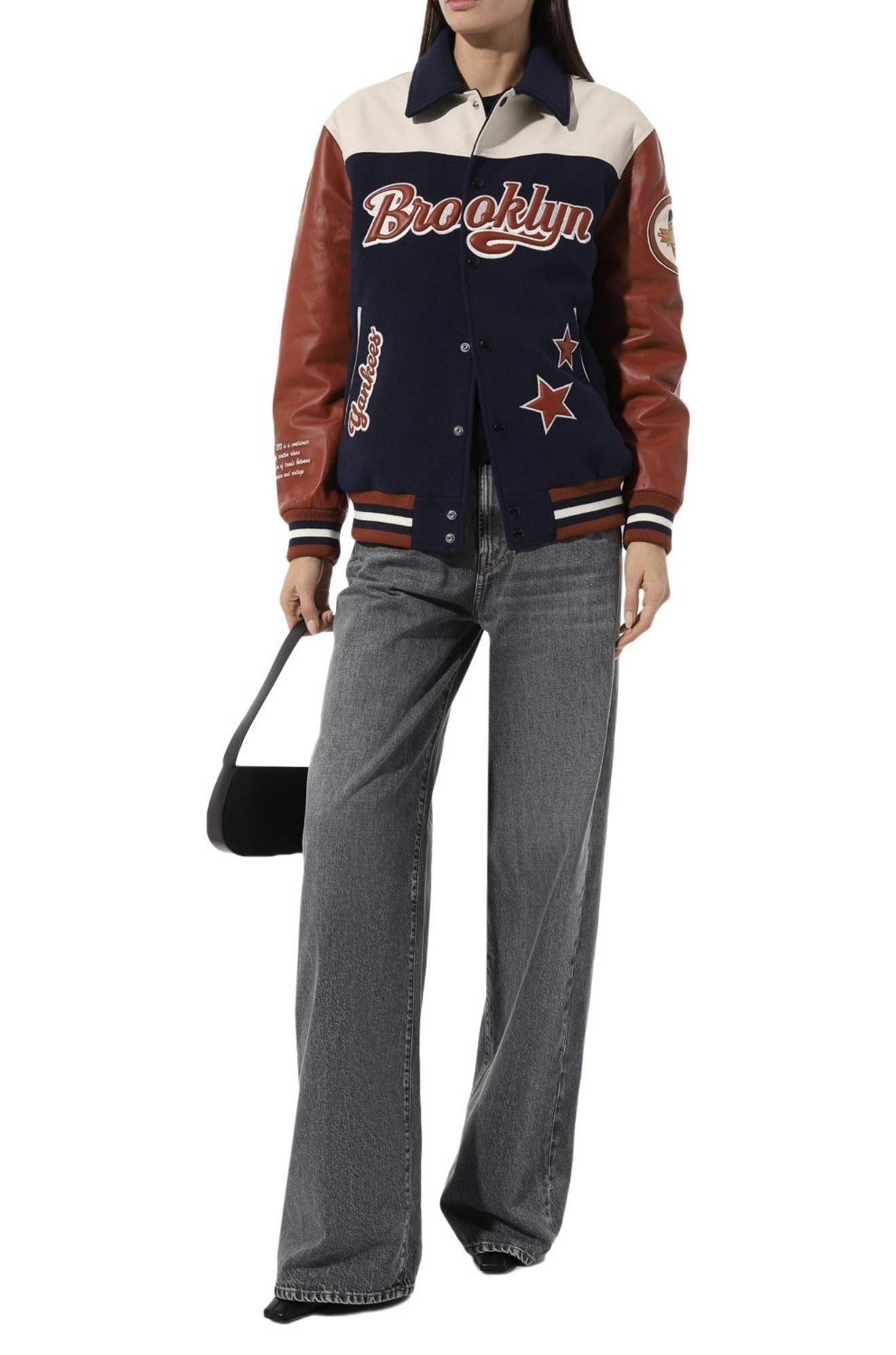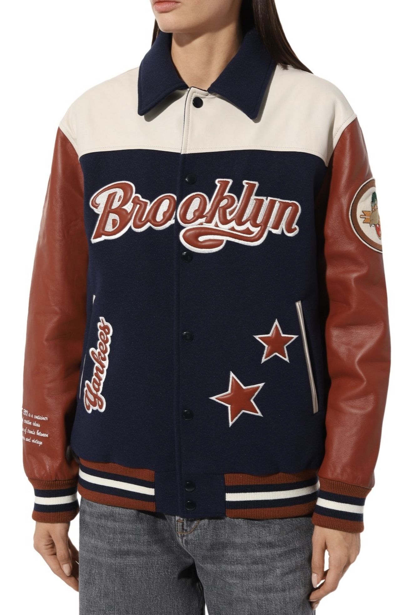 Разноцветный бомбер с отложным воротником, двумя врезными карманами и длинными рукавами сшит из комбинации фактурного текстиля и мягкой матовой кожи. Куртка, утепленная невесомым синтетическим наполнителем, украшена крупными аппликациями и символикой бейсбольного клуба New York Yankees.