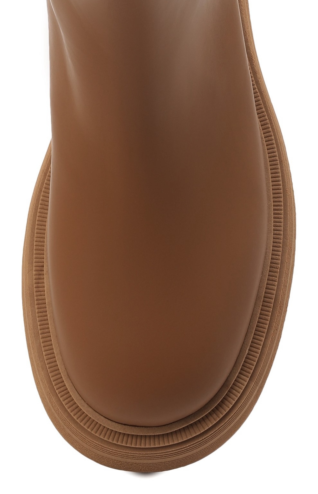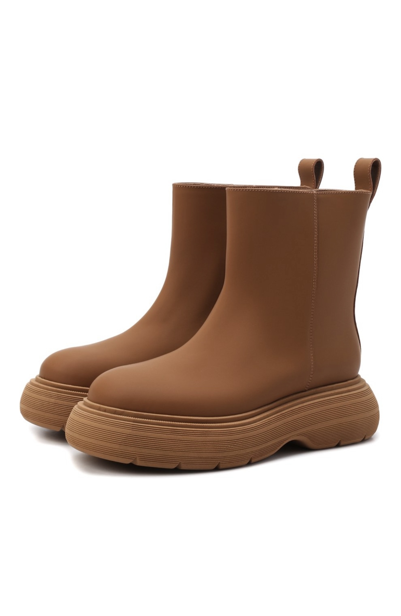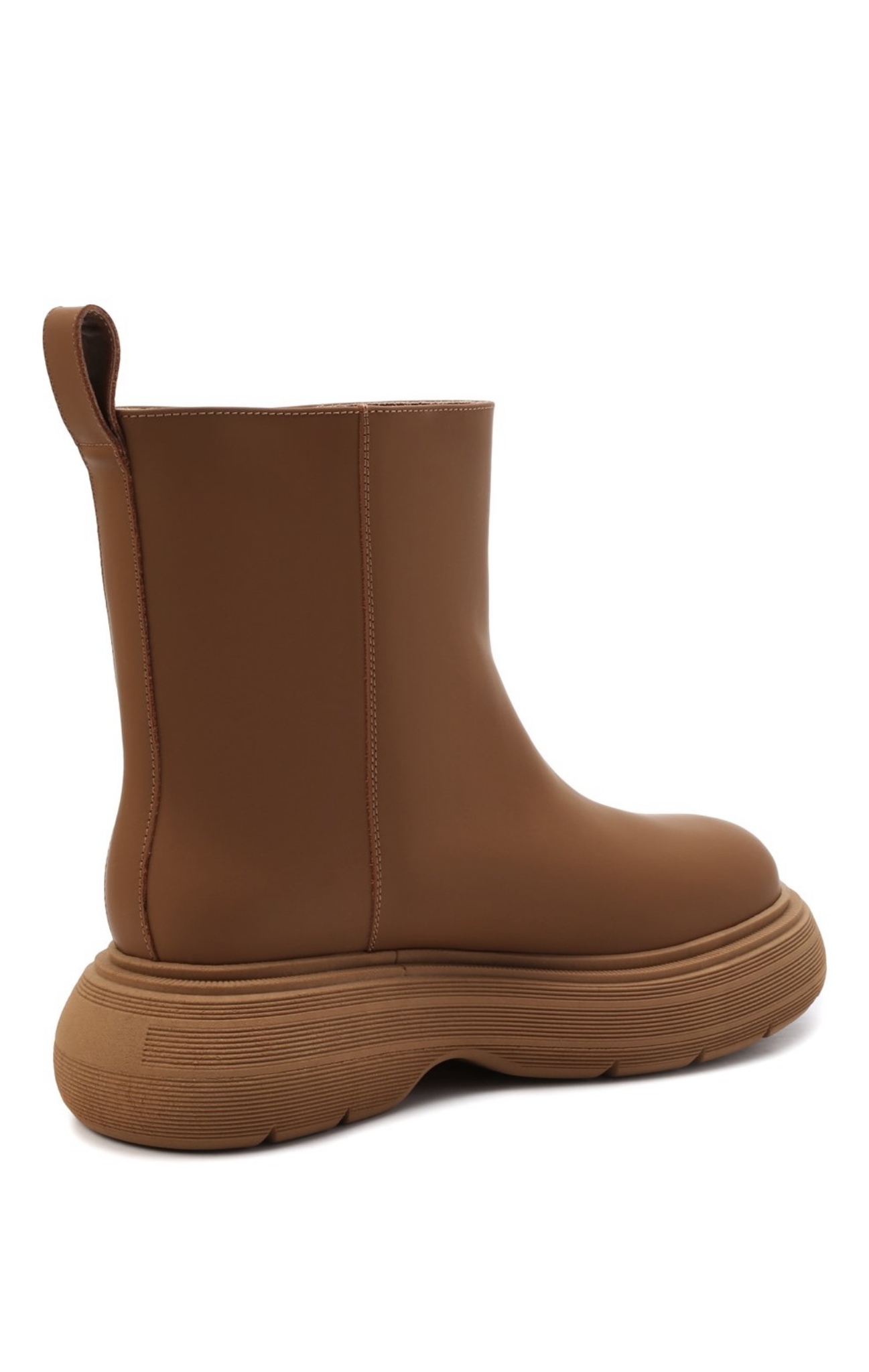 Полусапоги Marte коньячного оттенка - яркий пример комфортной повседневной обуви. Для изготовления модели из осенне-зимней коллекции использовали матовую гладкую кожу. Пару очистили от всевозможного декора, отдав его роль скульптурной протекторной подошве, выступающей за пределы верха. Благодаря широкому голенищу и петле на заднике обувь без молнии удобно надевать и снимать.