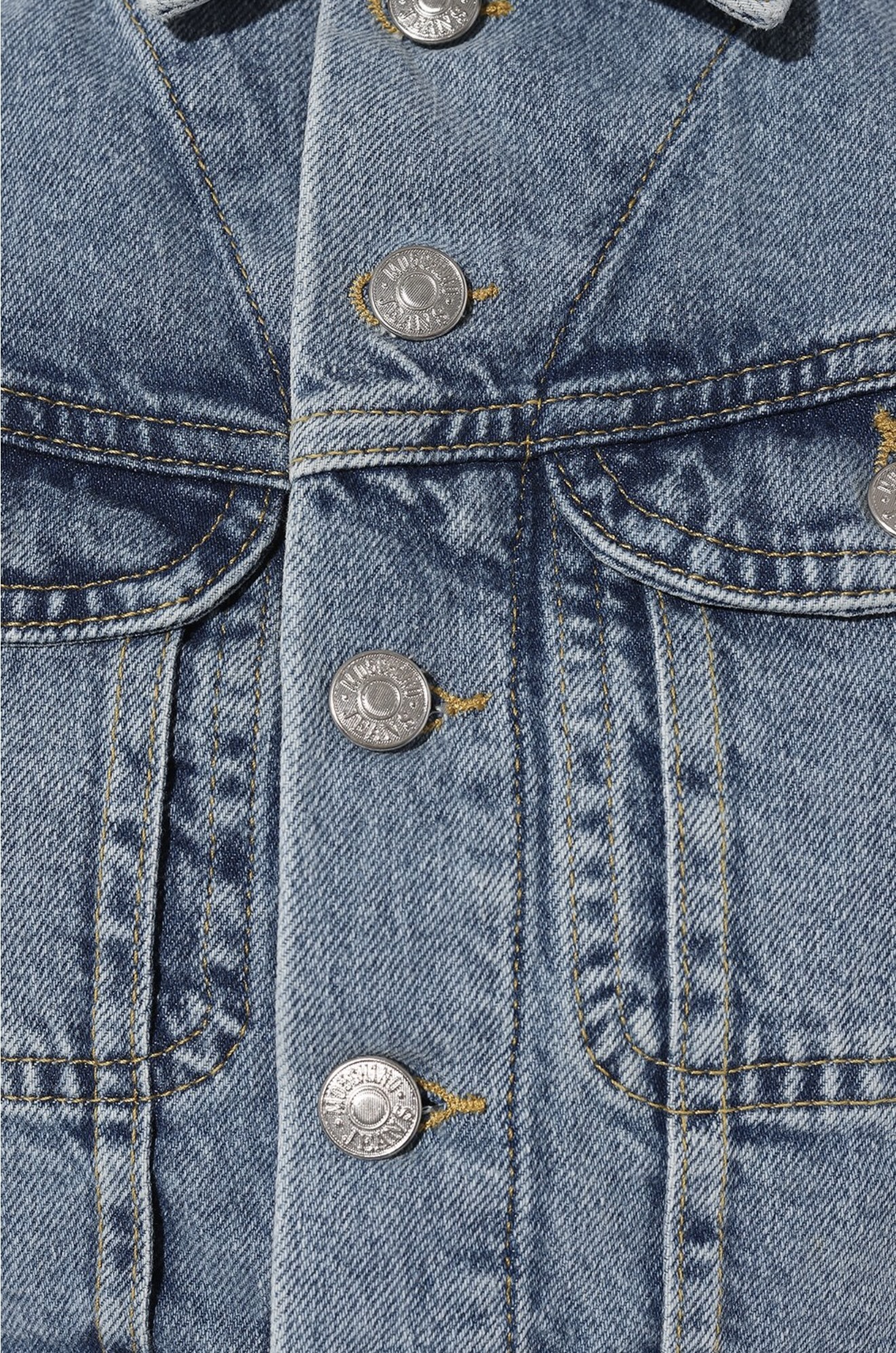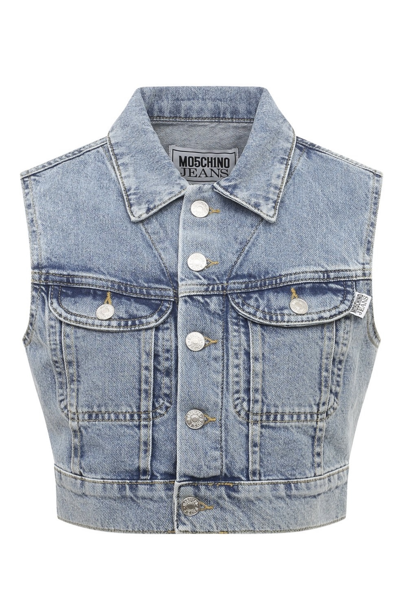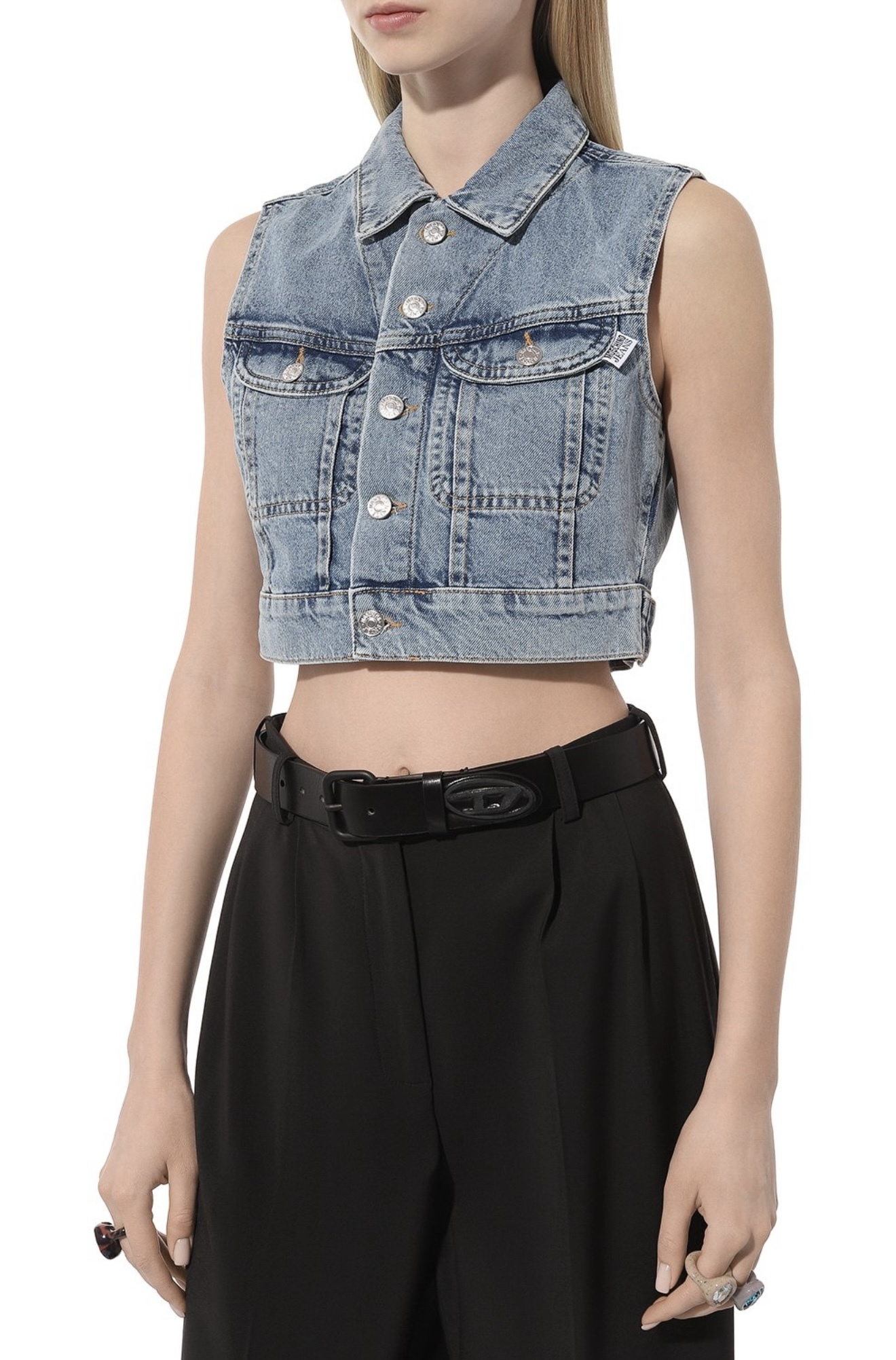 Укороченный джинсовый жилет голубого цвета сможет стать достойной заменой топу. Например, наши стилисты предлагают сочетать модель с черными брюками и кремовыми кроссовками. Изделие с регулируемым поясом выполнили из плотного хлопка с декоративными заломами и потертостями.