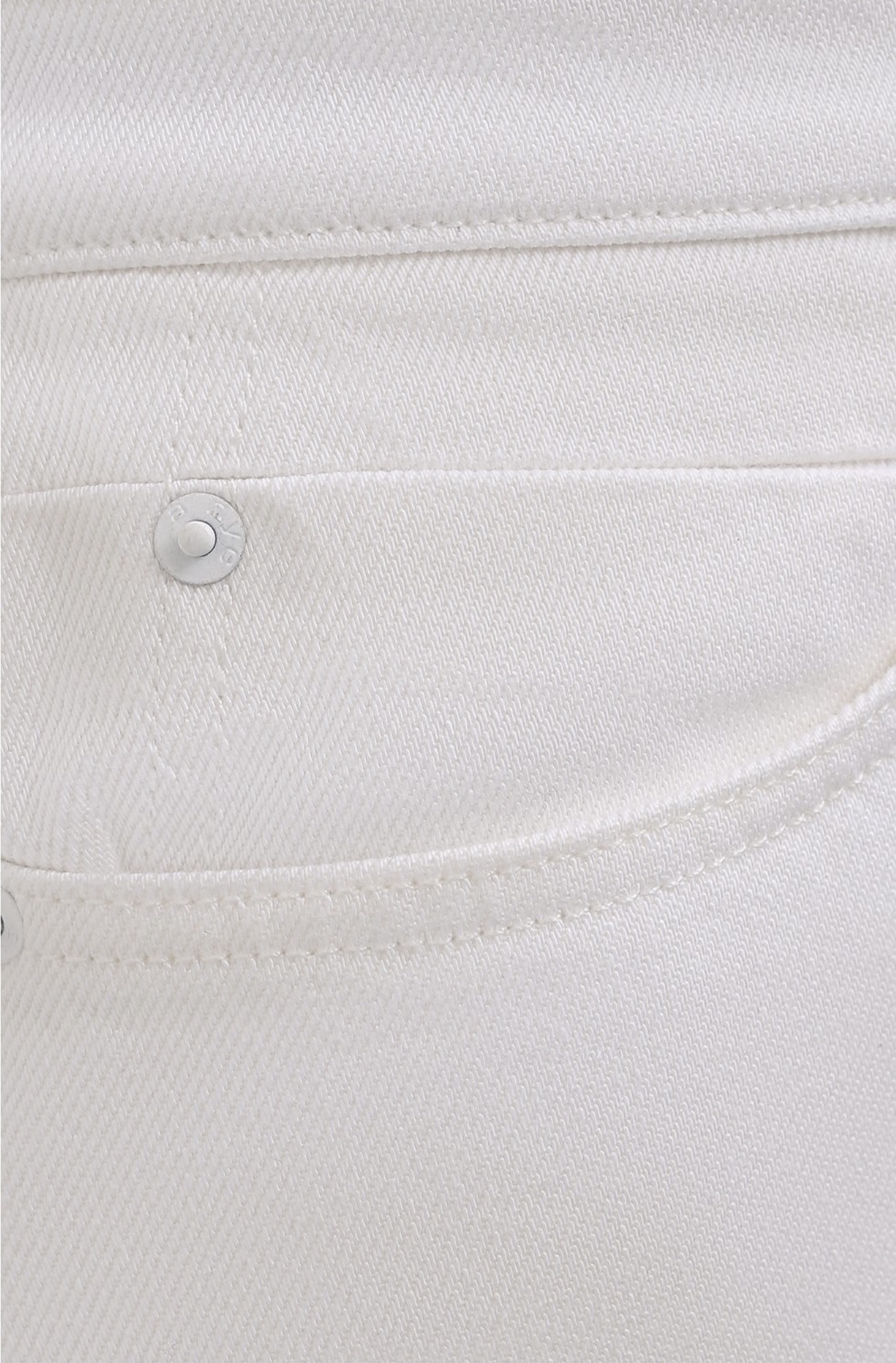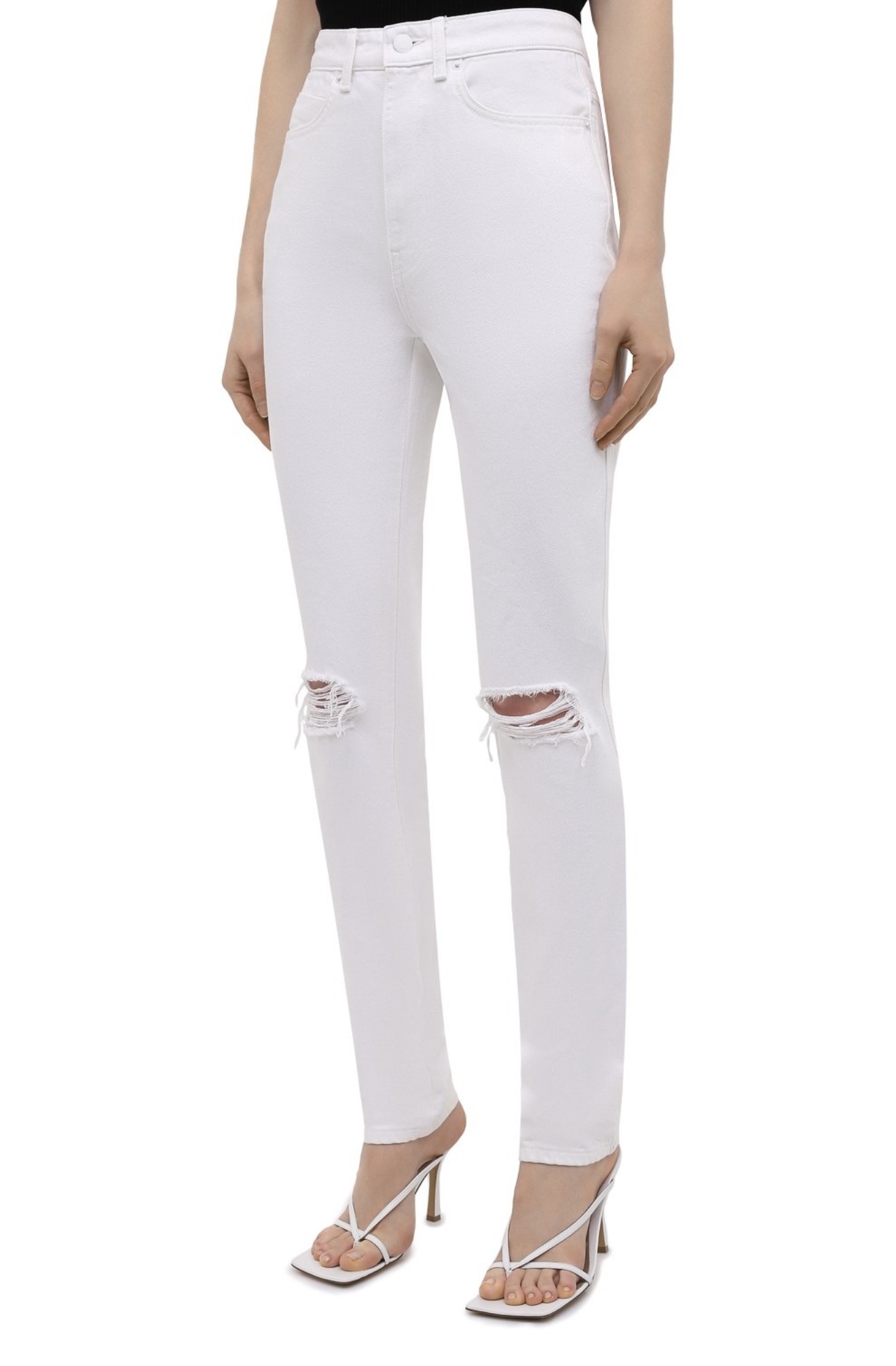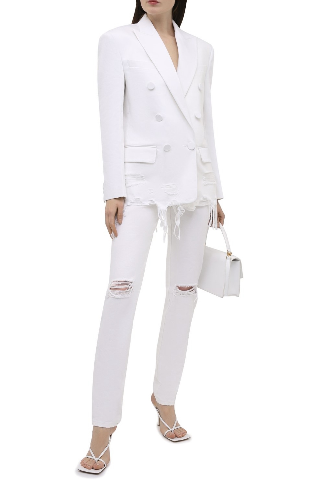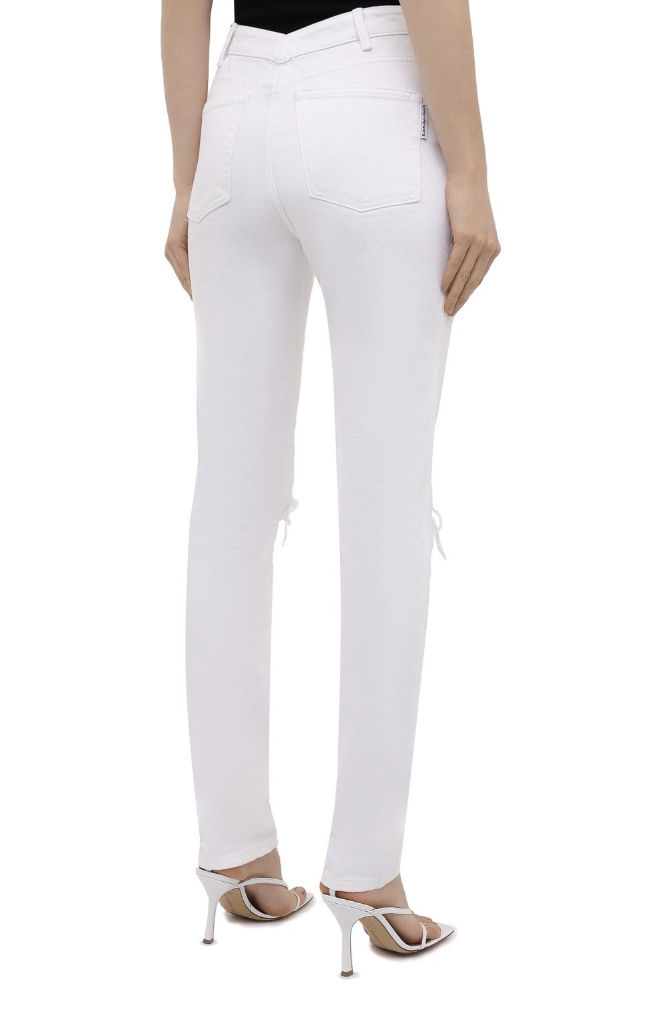 В весенне-летнюю коллекцию Александр Вэнг включил белые облегающие джинсы с активными потертостями в области колен. Для пошива изделия использовали плотный хлопок, а чтобы вещь из него комфортнее садилась по фигуре, пояс и кокетку сзади скроили в форме литеры V.