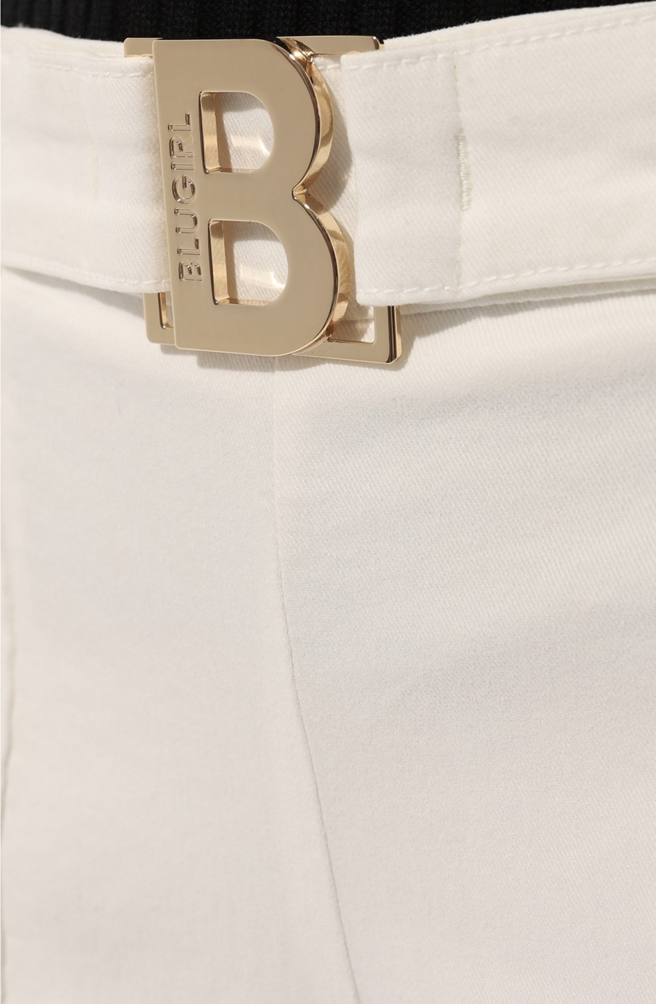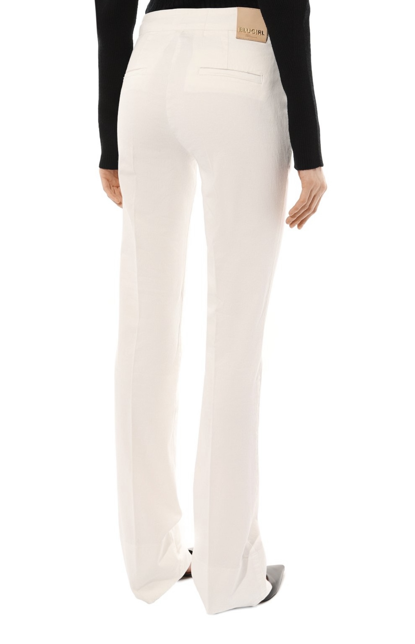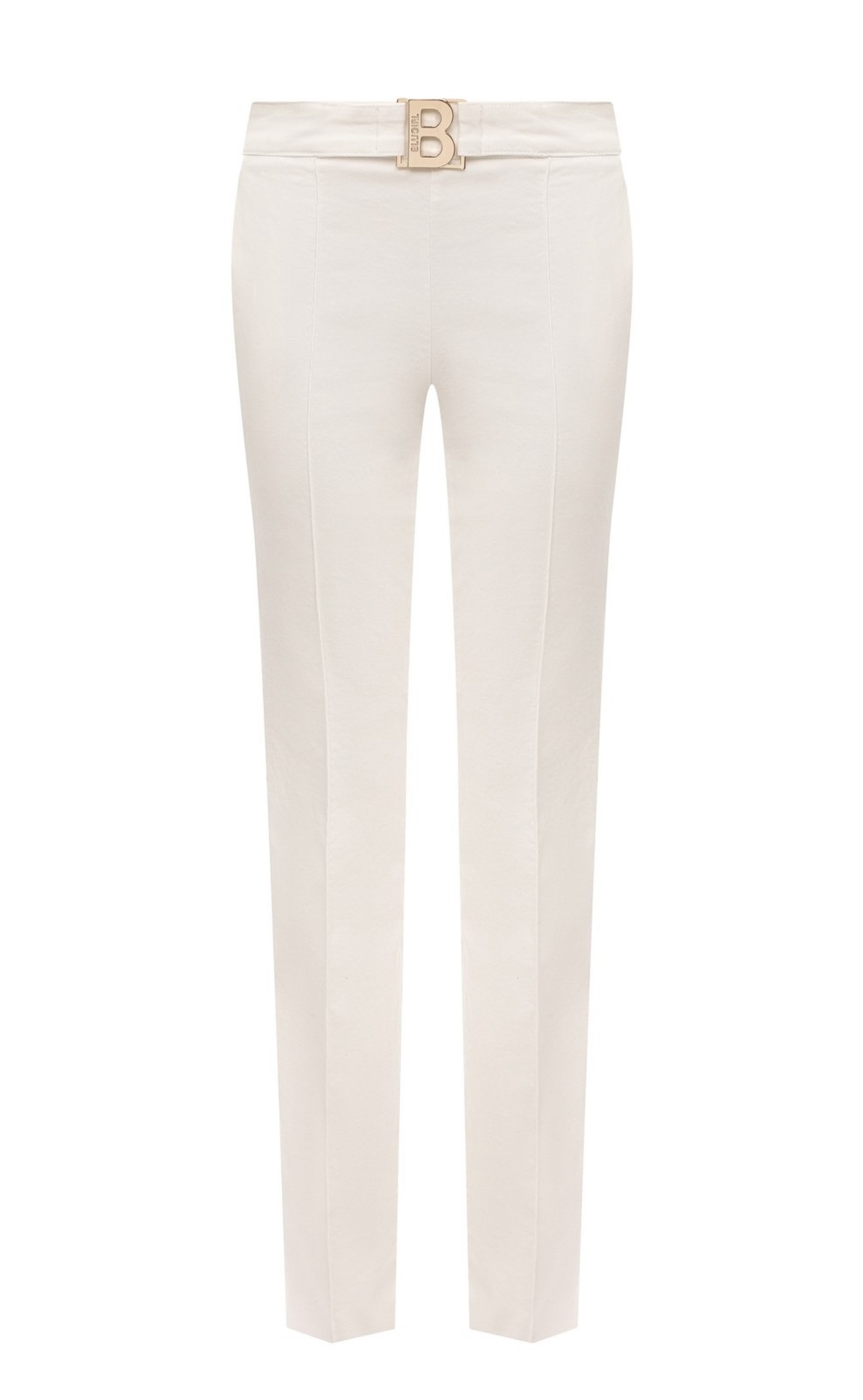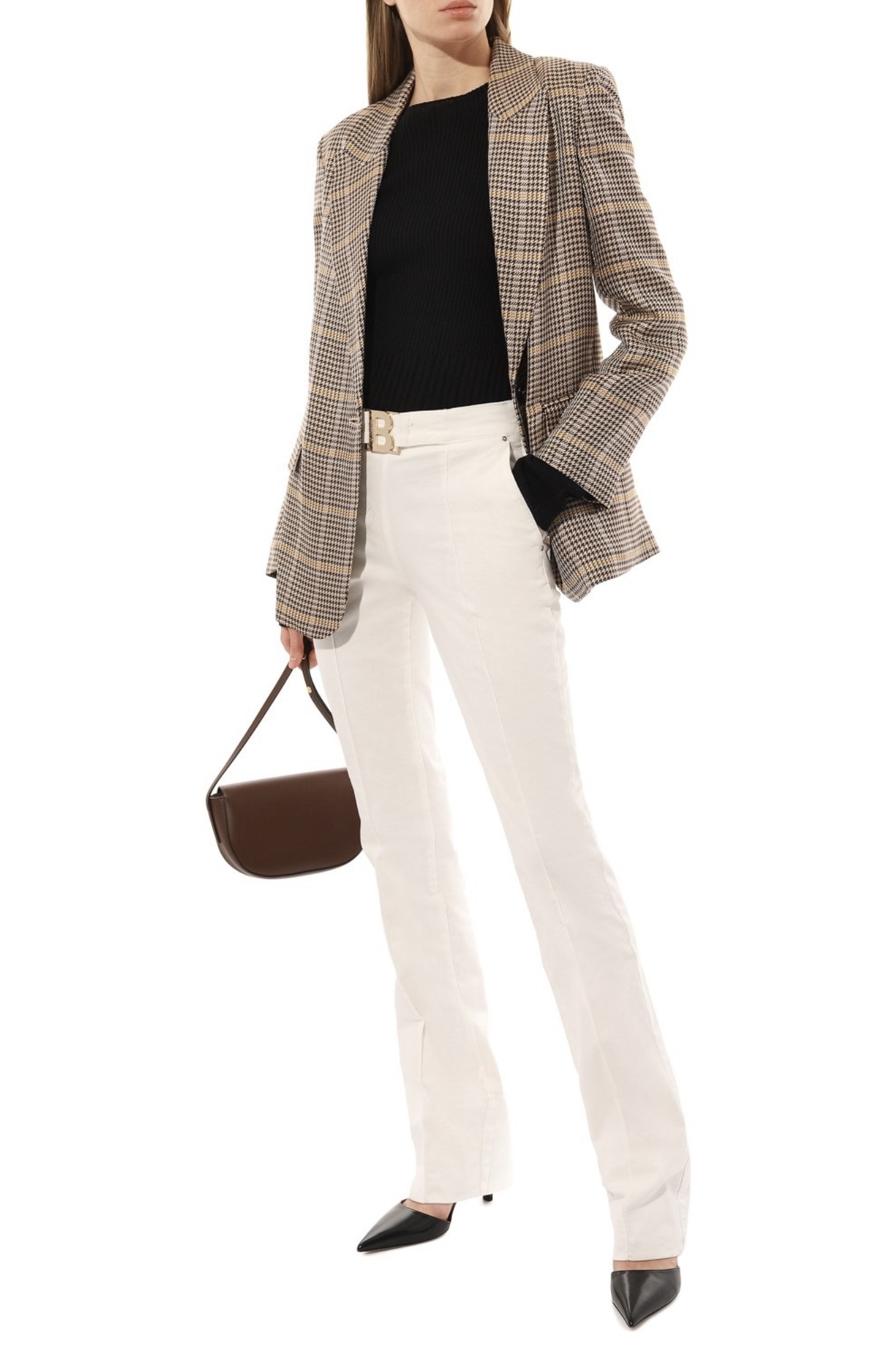 Шов, имитирующий стрелки, визуально вытягивает ноги, а утрированная длина белых джинсов позволяет носить их с высокими каблуками. Модель с карманами, как у формальных брюк, сшили из мягкого эластичного денима, поэтому она комфортно садится по фигуре и не мешает движениям. Пояс с крупной золотистой пряжкой в виде логотипа деликатно акцентирует внимание на талии.