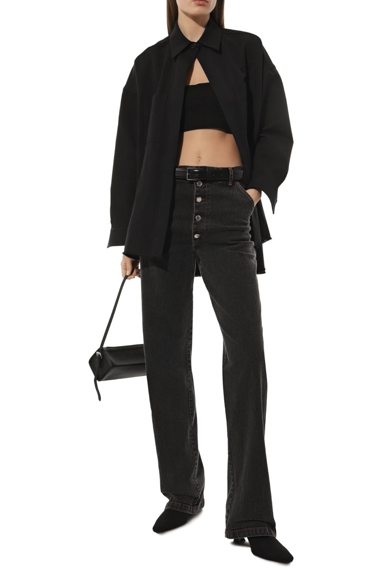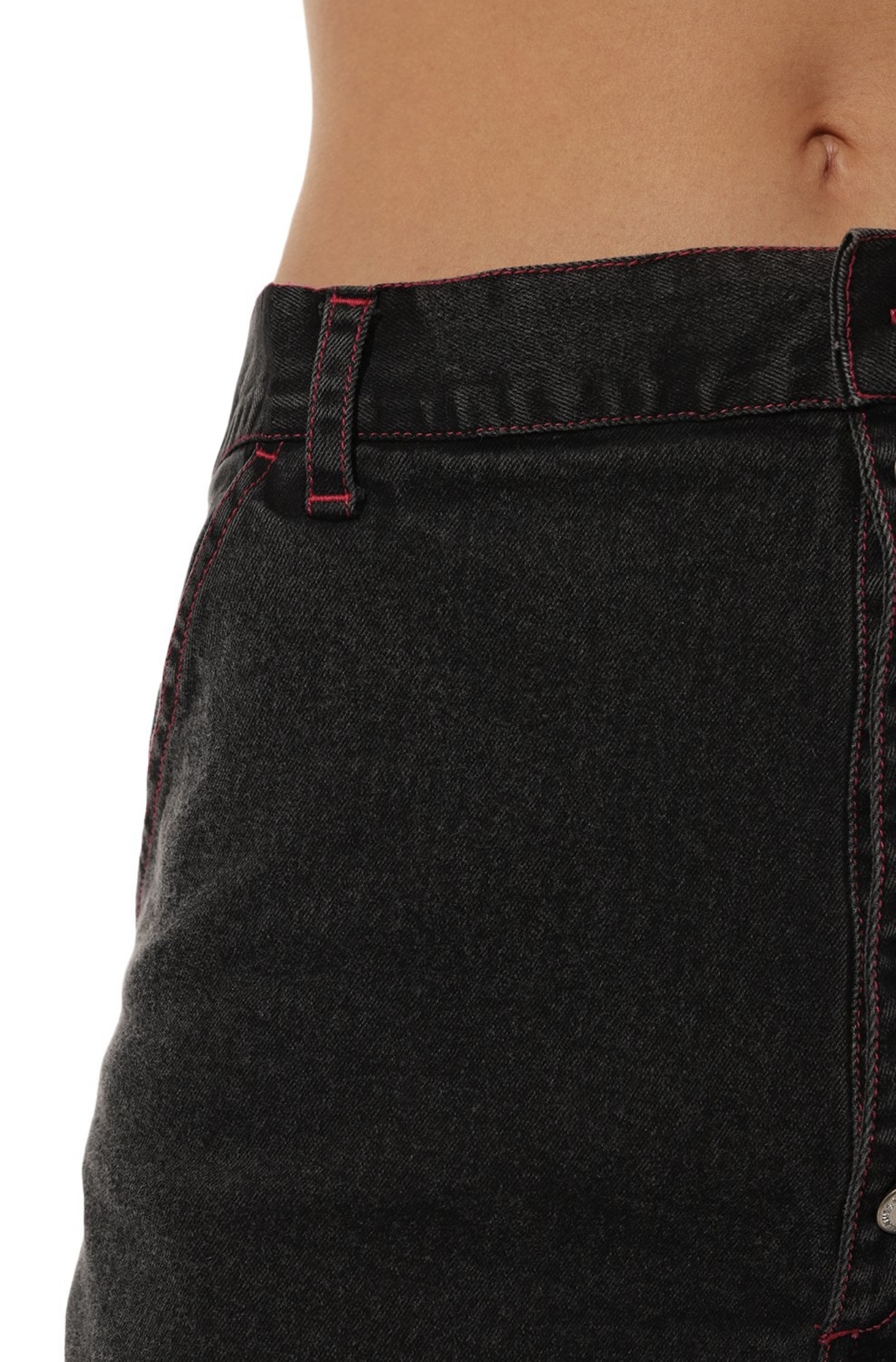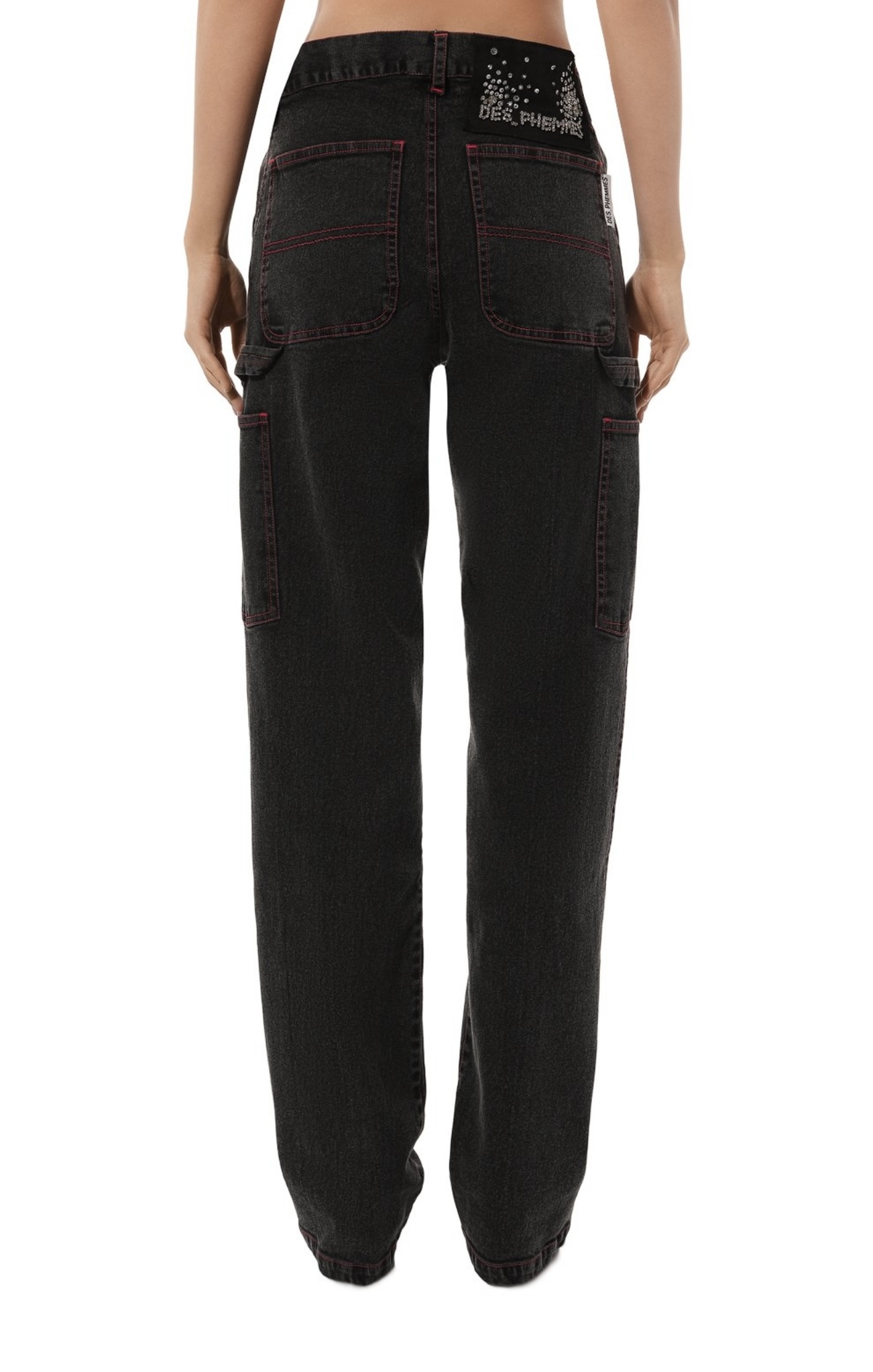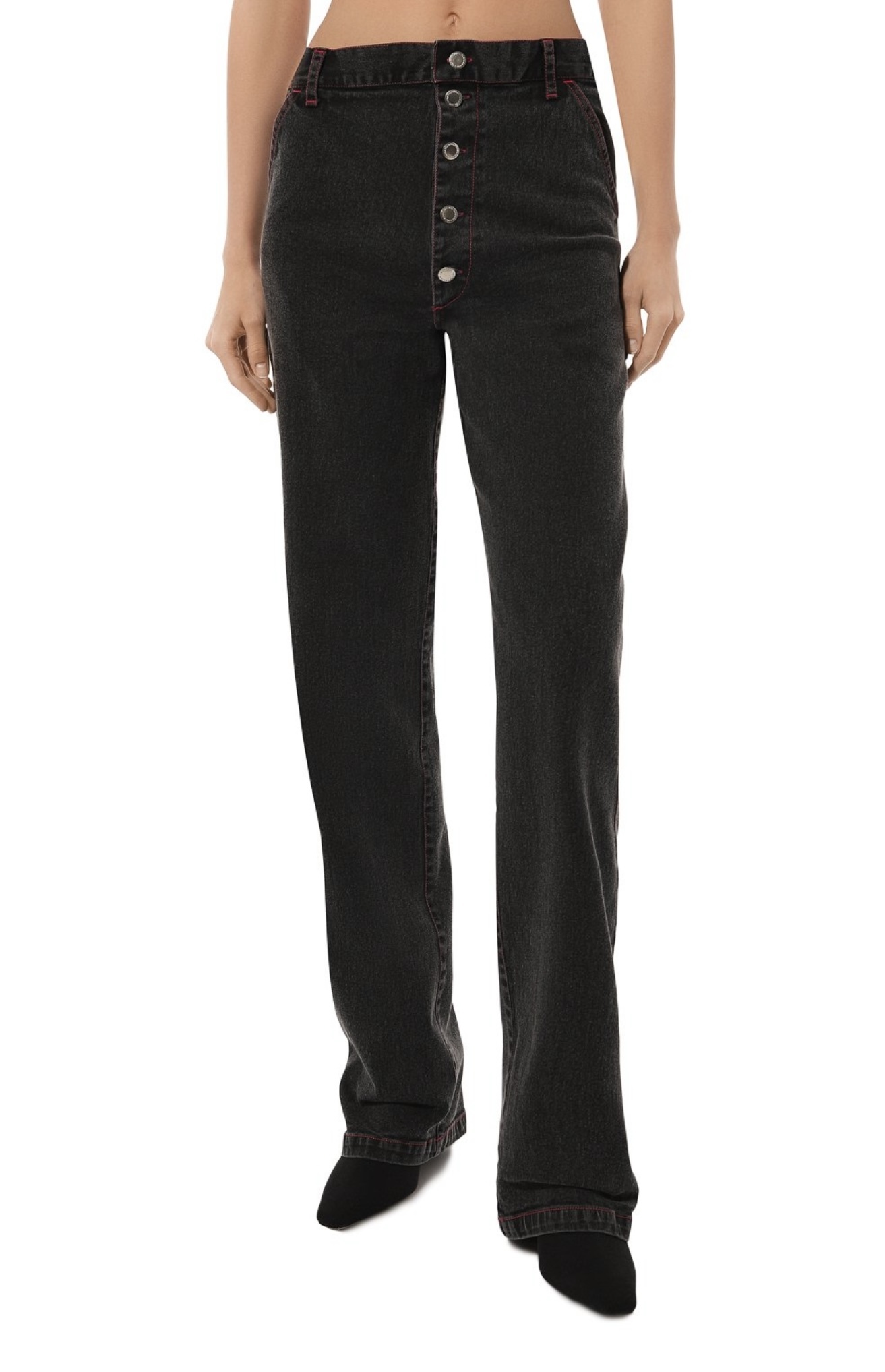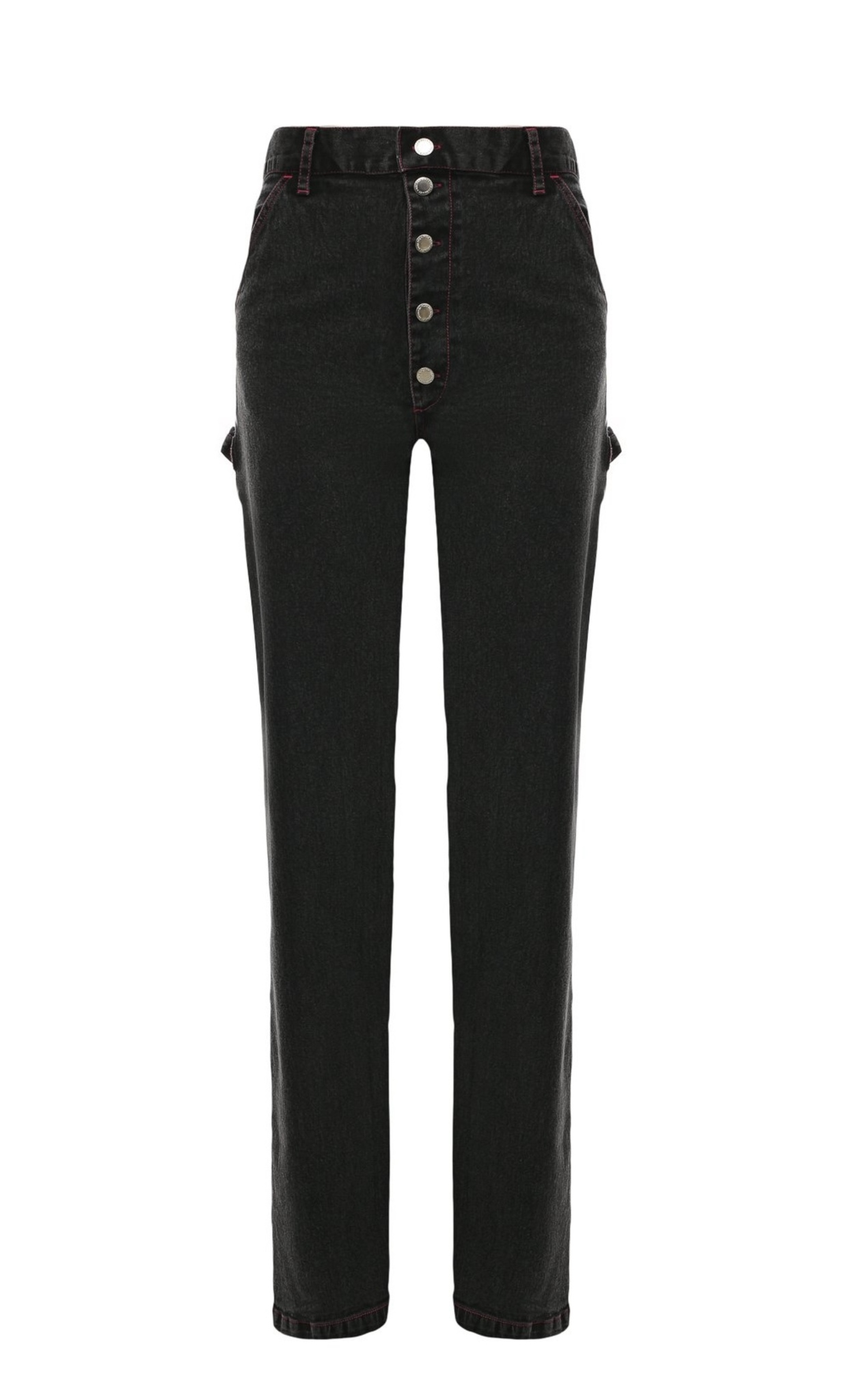 Черные джинсы с завышенной посадкой постирали в готовом виде, чтобы сделать похожими на любимые брюки, которые носили не один сезон. Для пошива модели, застегивающейся на болты, использовали мягкий стрейчевый деним. Изделие с двумя узкими дополнительными карманами по бокам декорировали патчем с логотипом бренда, выложенным прозрачными кристаллами и пайетками.