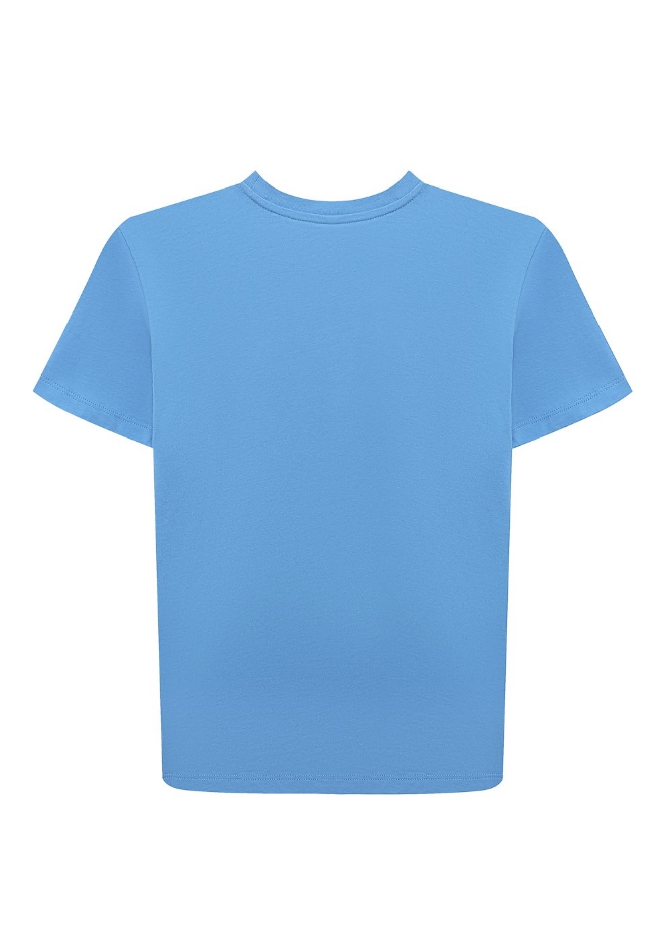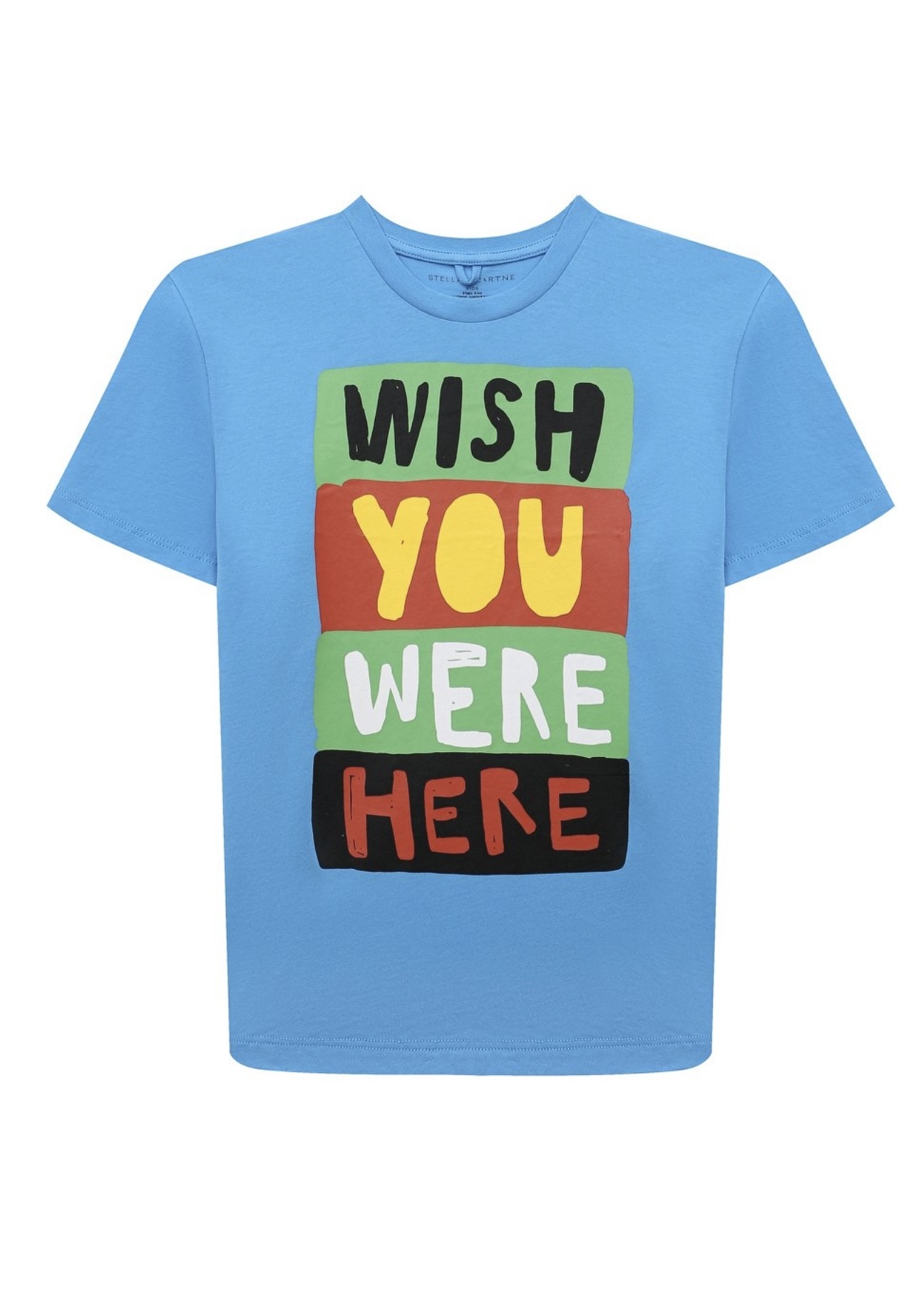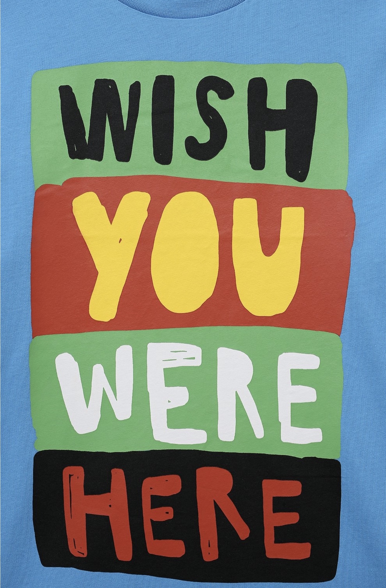 Синюю футболку из тонкого джерси украсили ярким разноцветным принтом с надписью Wish You Were Here. Эластичный трикотаж, хорошо пропускающий воздух, изготовили из отборного органического хлопка, при выращивании которого не использовали токсичные химикаты. Модель приятно ощущается на коже и легко тянется, не ограничивая движения.
