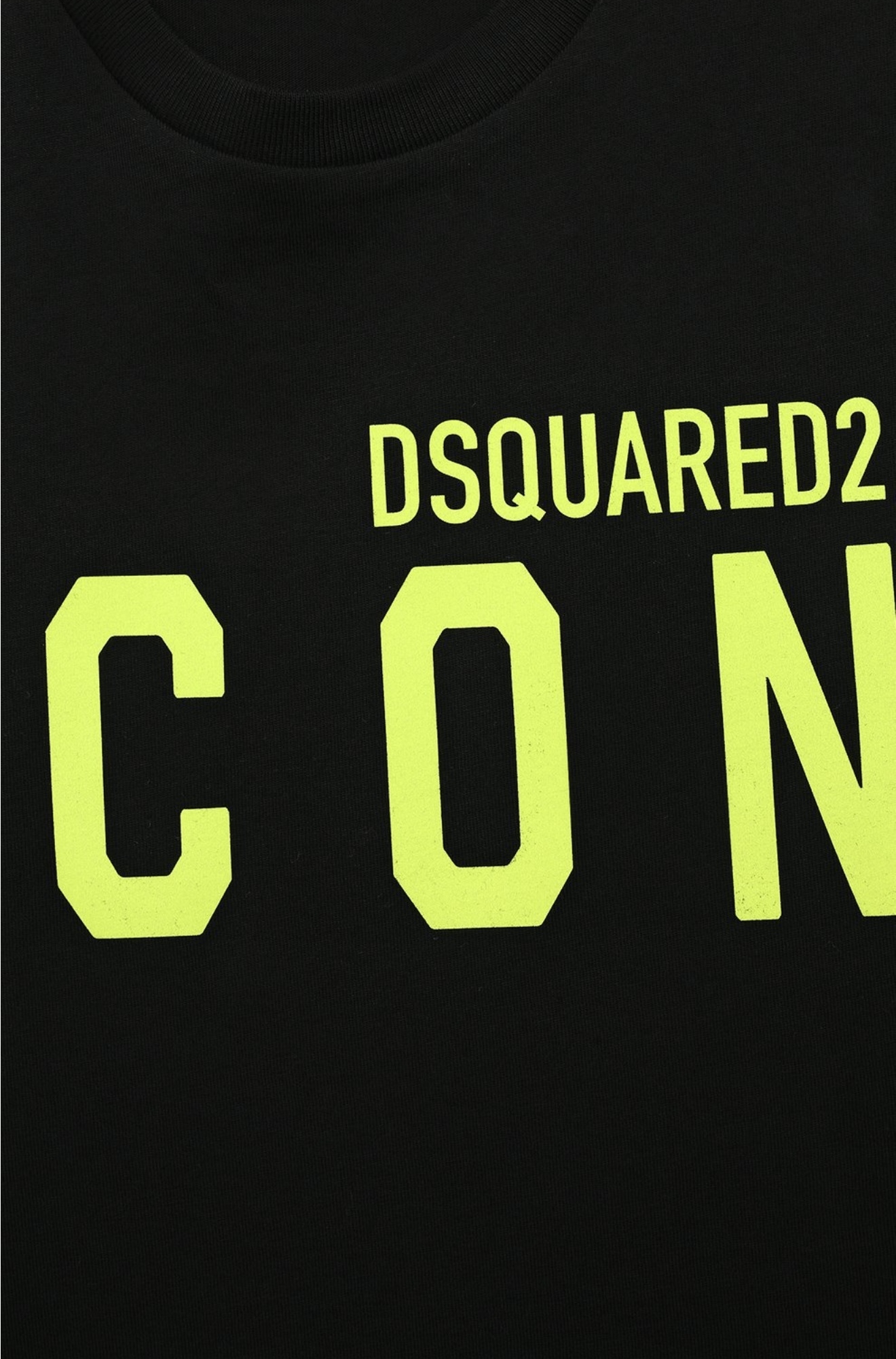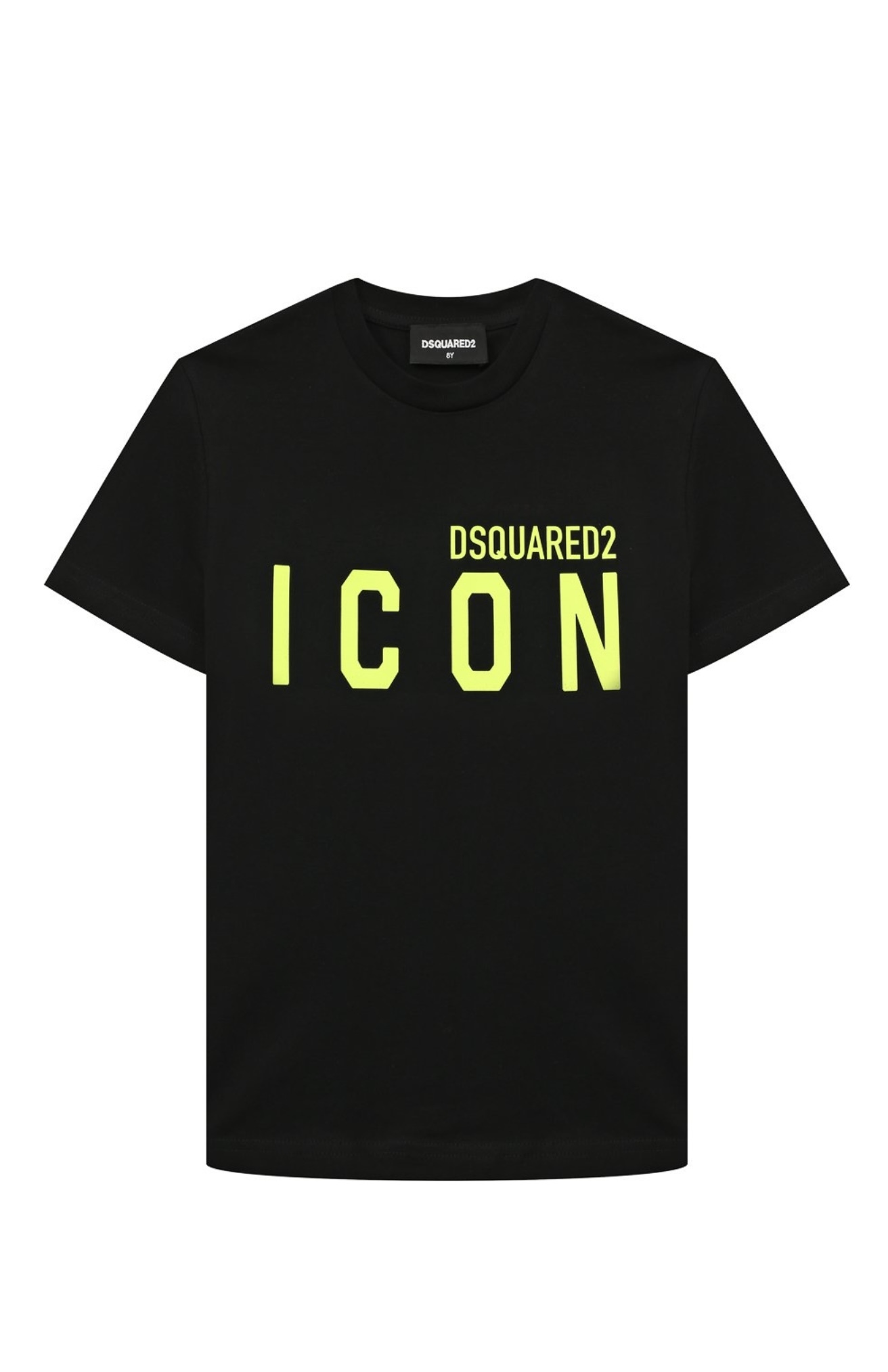 Легкая черная футболка с короткими рукавами и круглой горловиной украшена спереди крупной неоновой надписью Icon и логотипом бренда.