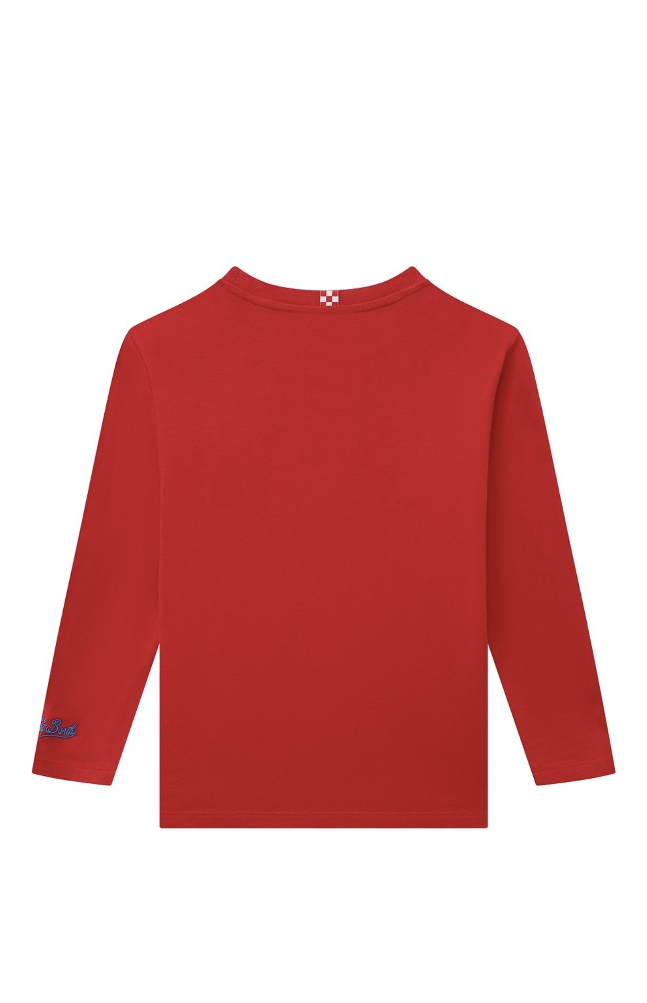 Для пошива красного лонгслива использовали приятный на ощупь хлопковый трикотаж. Изделие из такого эластичного материала не сковывает движения, хорошо пропускает воздух и быстро отводит влагу, обеспечивая комфорт даже во время активных игр.