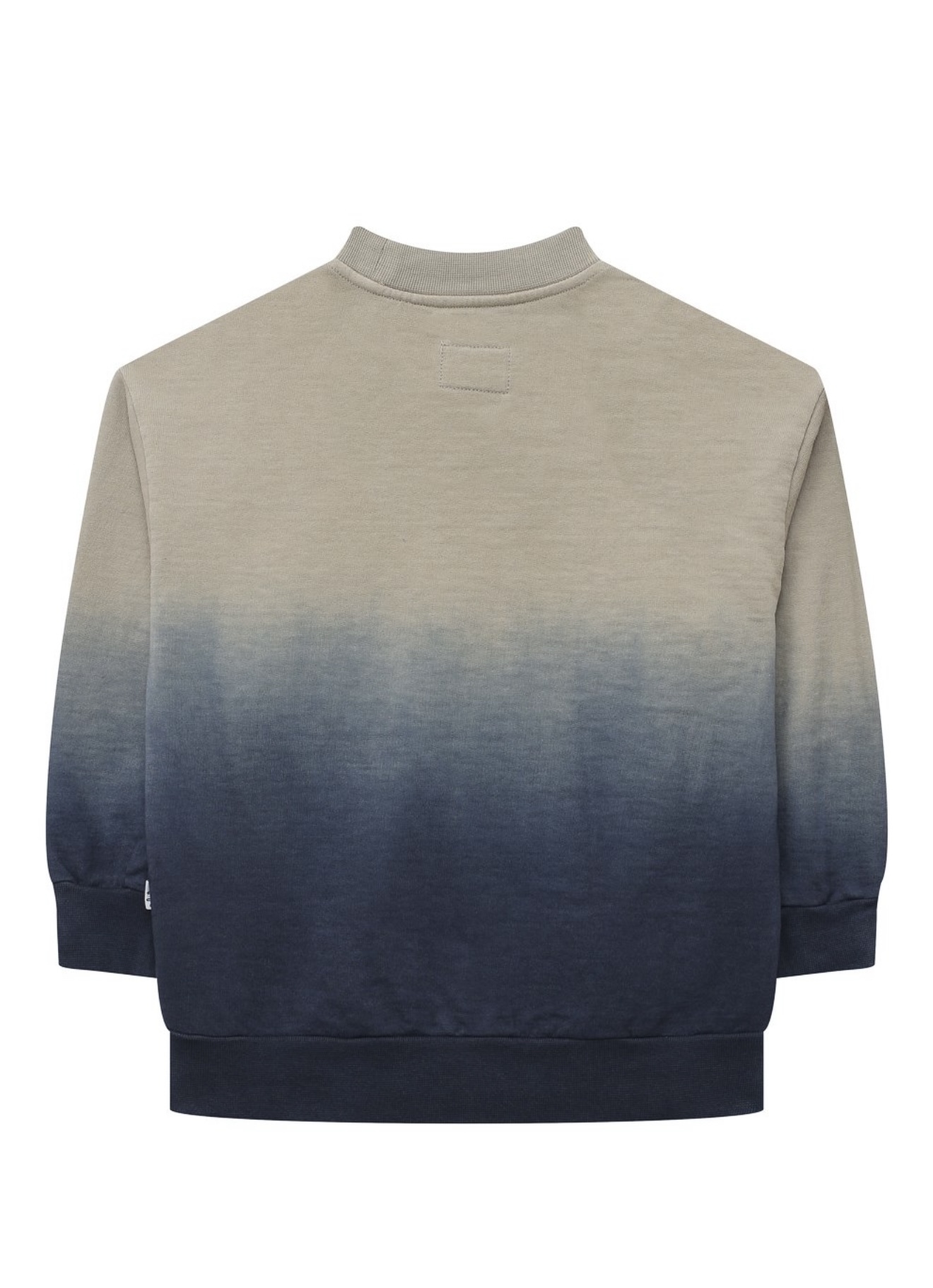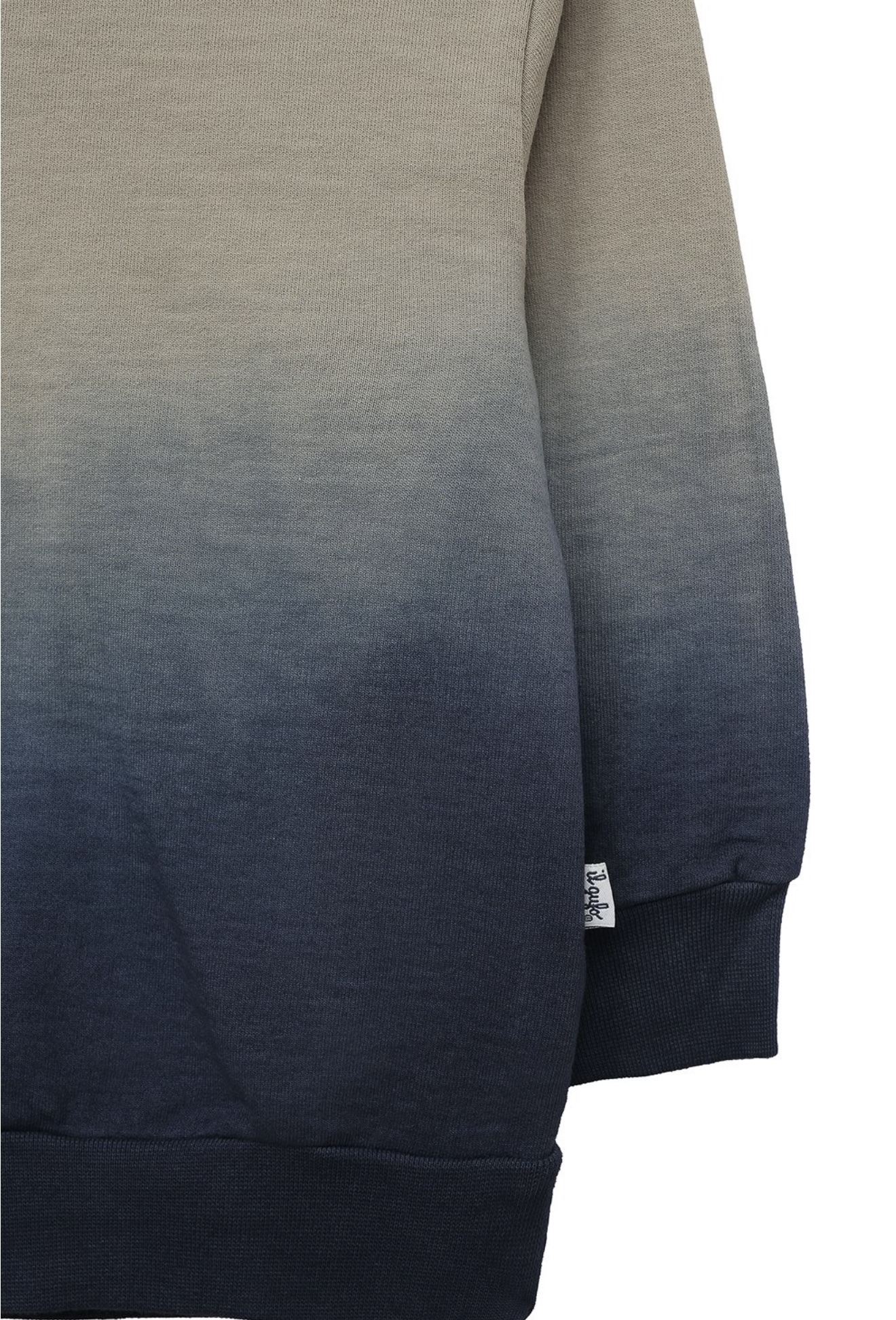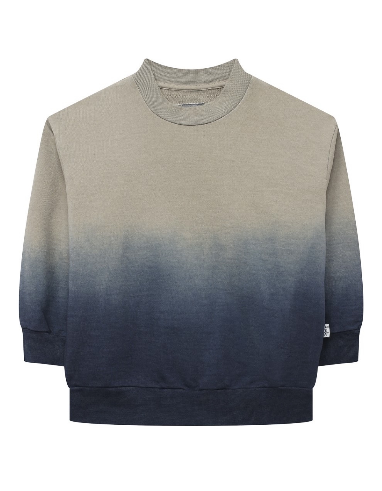 Материал с бархатистой изнаночной стороной выполнили из самых длинных и тонких волокон премиального хлопка, поэтому он получился особенно приятным на ощупь. Бежевое изделие окрасили в синий оттенок, сформировав плавный градиент.