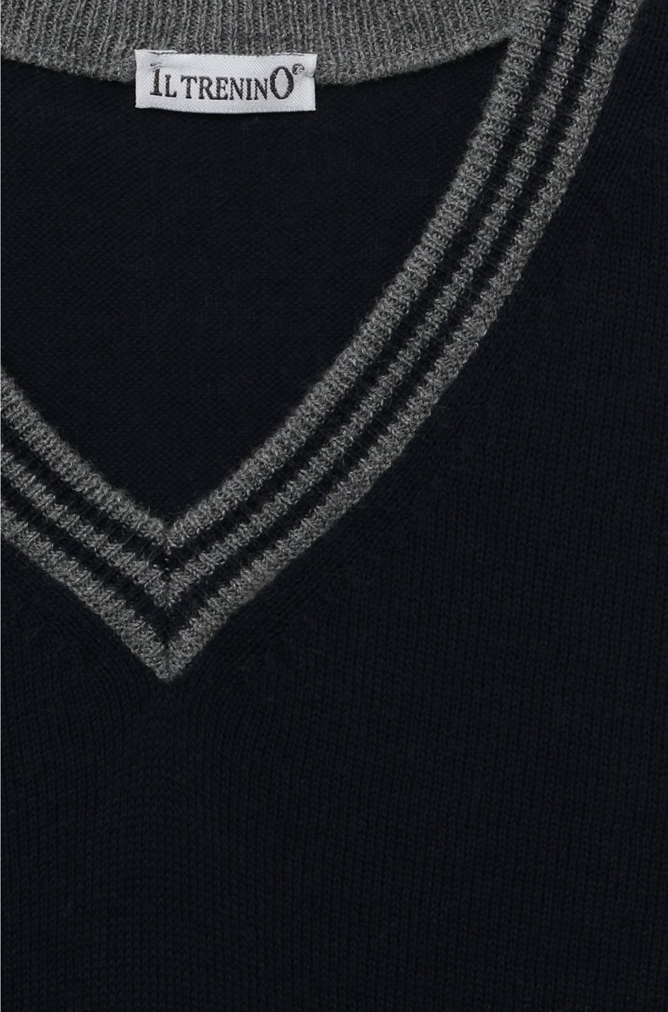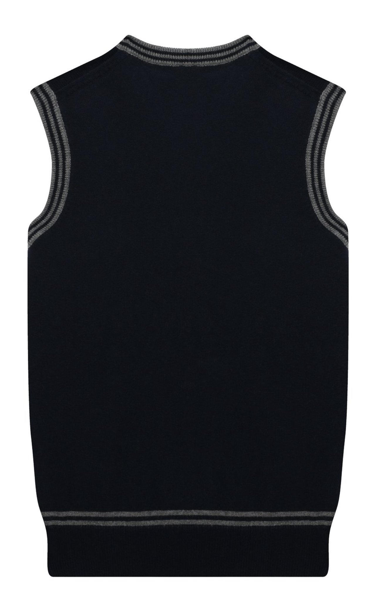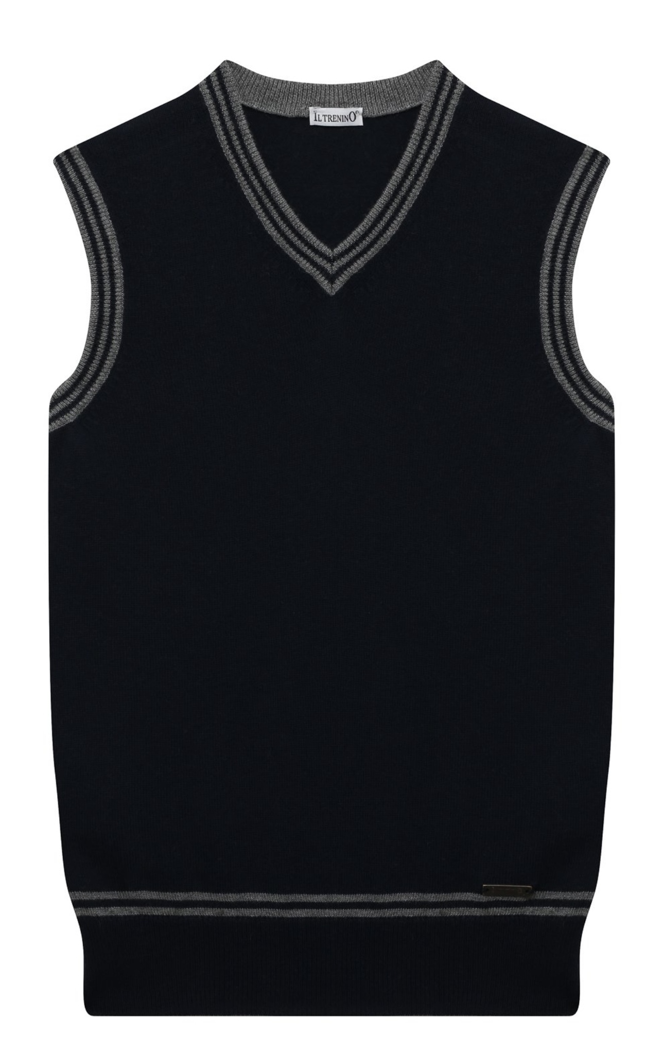 Полуночно-синий жилет с акцентированными проймами, V-образным вырезом и широким поясом выполнили из мягкой смесовой пряжи. Волокна хлопка в ее составе хорошо пропускают воздух и удерживают тепло, а кашемир придает изделию особенную нежность. Модель комфортно облегает тело и не ограничивает движения ребенка.