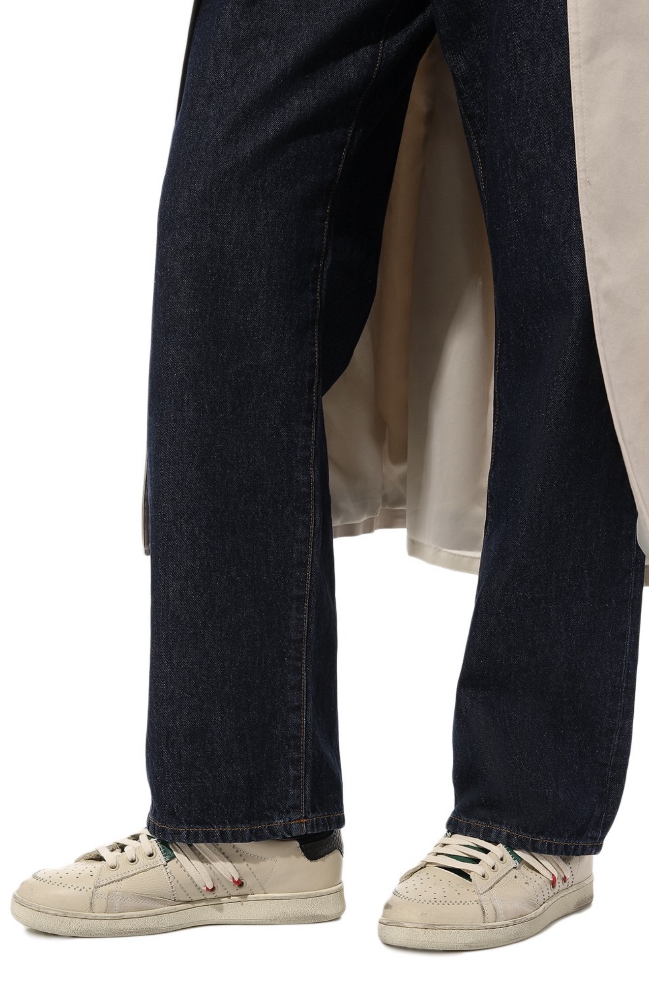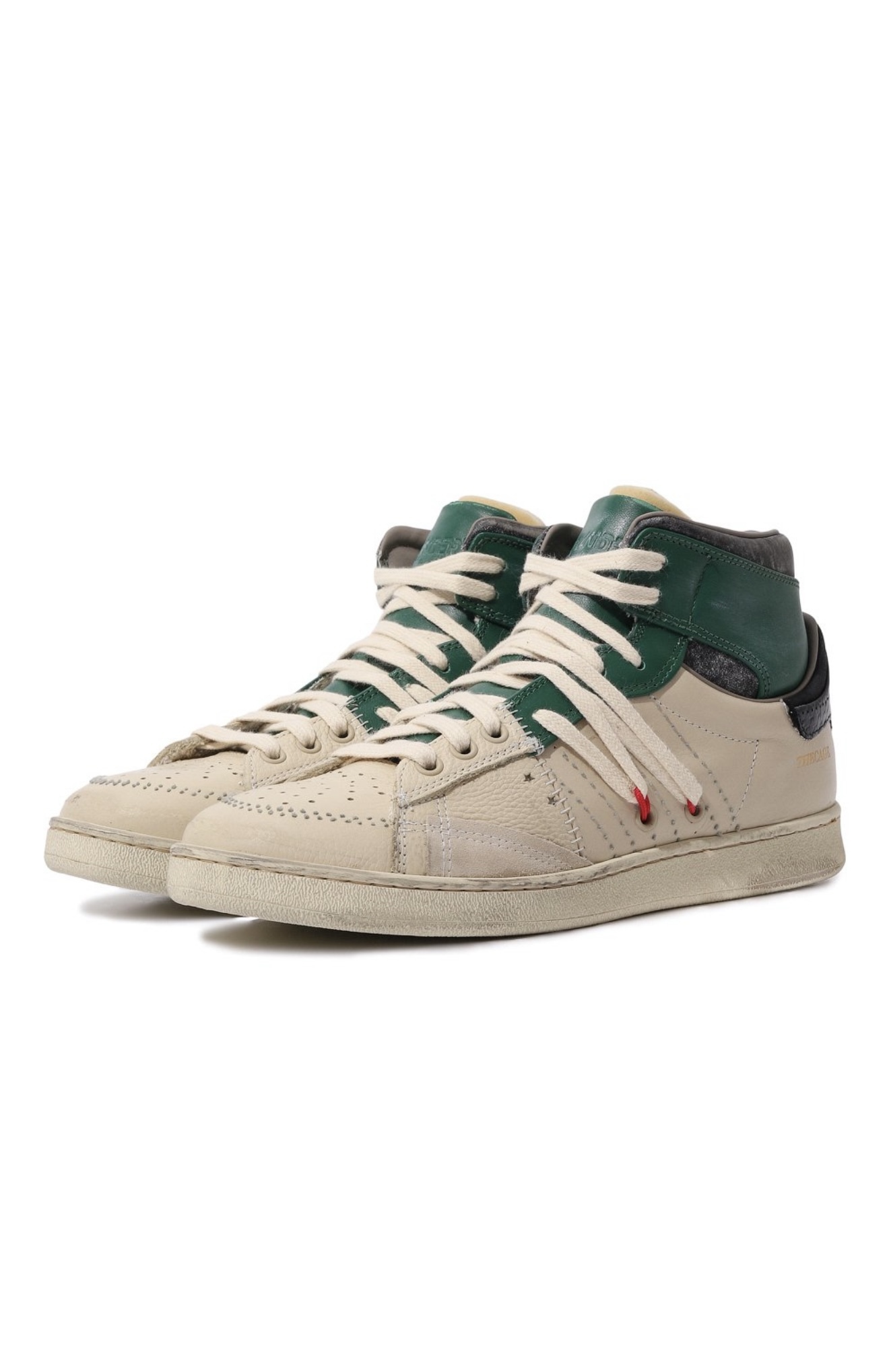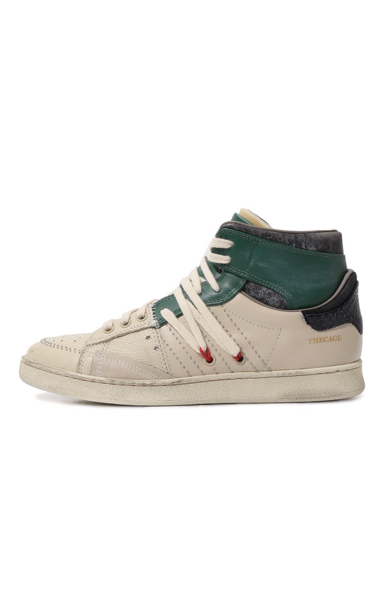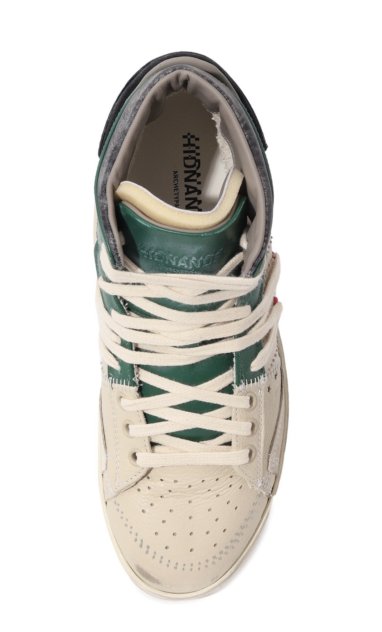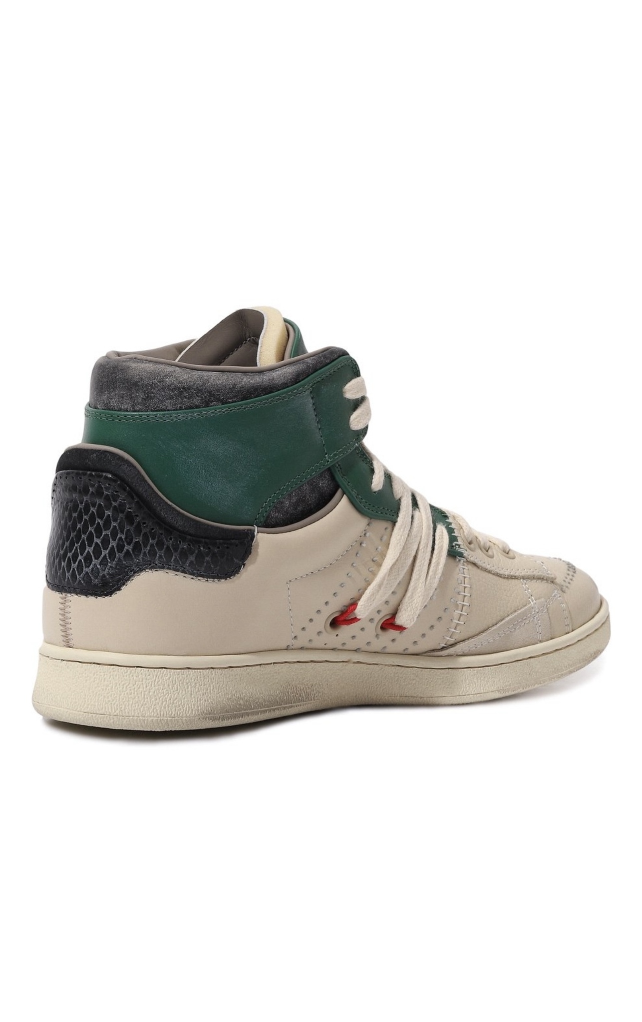 Белые кеды с зеленой отделкой на высоком голенище выглядят как любимая обувь, которую носили не один сезон. Иллюзию сформировали потертостями и вставками из разных по фактуре материалов, имитирующих заплаты. Для пошива изделия с черной фигурной накладкой с тиснением под питона на заднике использовали мягкую матовую кожу.