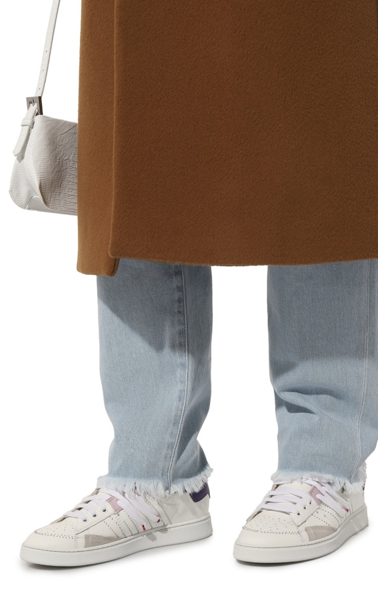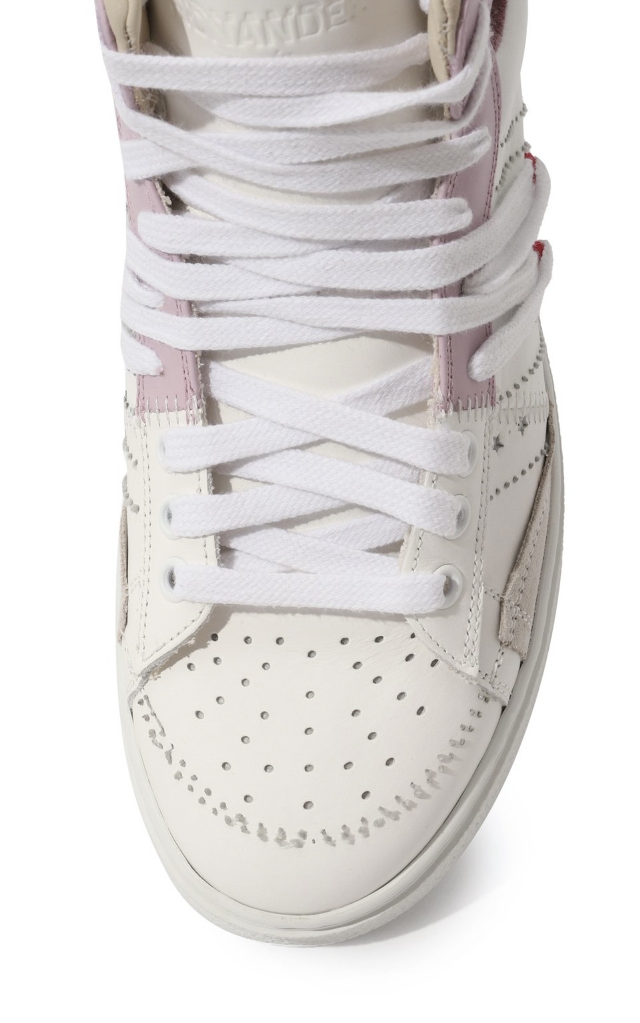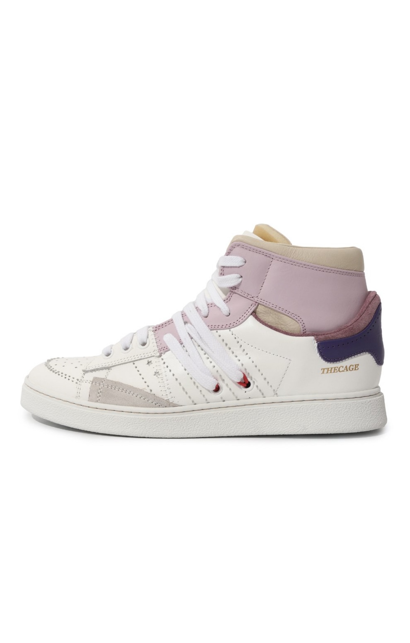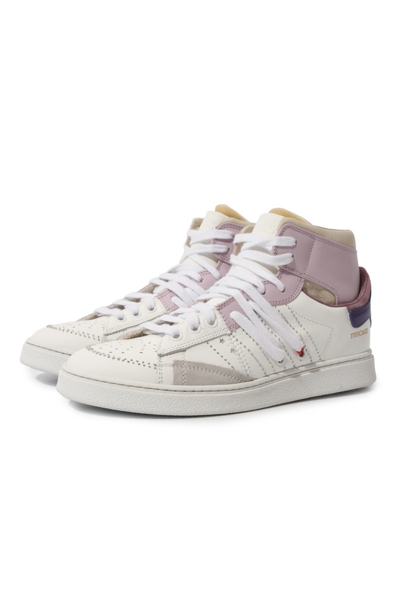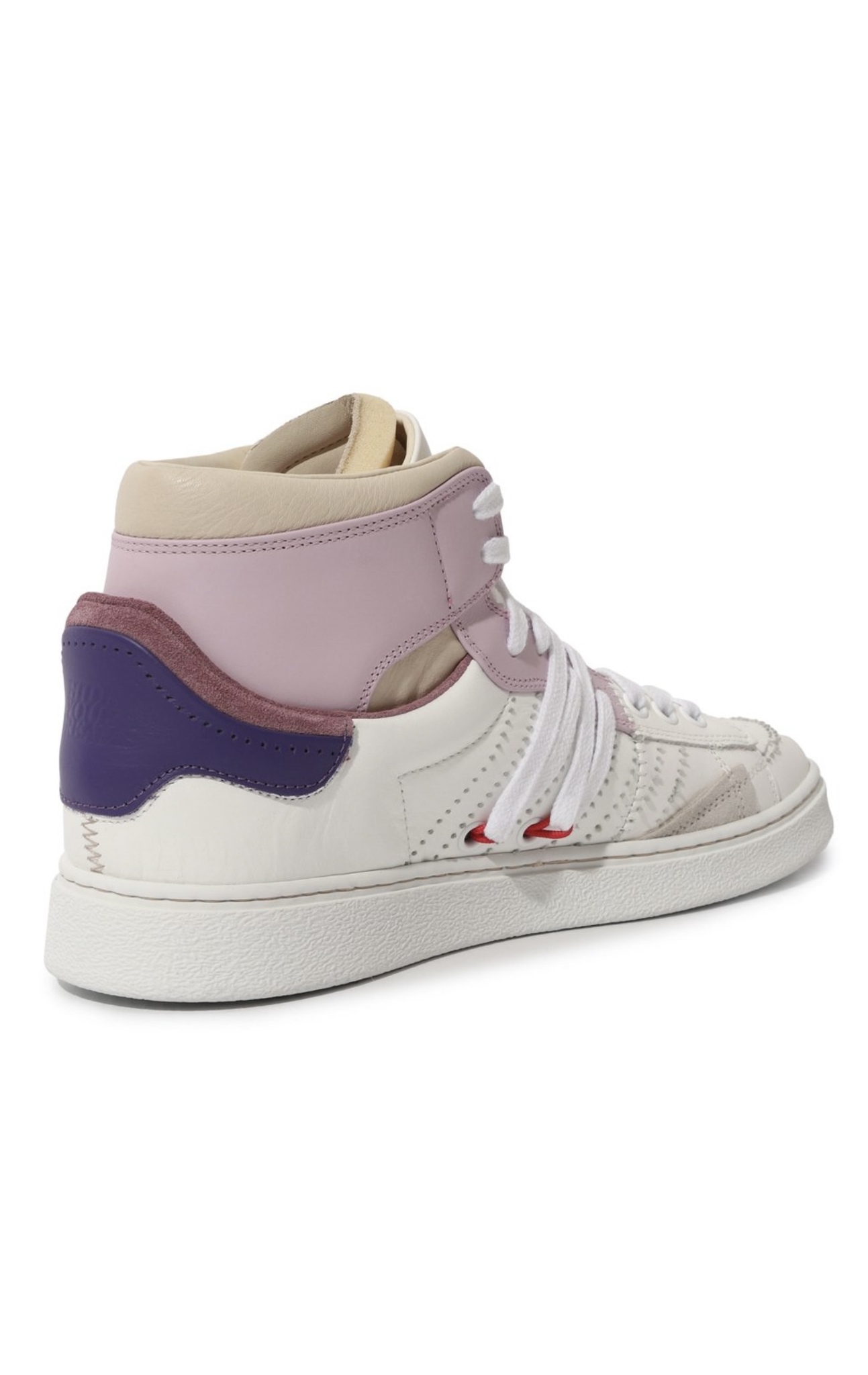 Высокие кеды, стилизованные под обувь баскетболистов, команда марки выполнила в технике color block, дополнив из фигурными накладками сиреневого, фиолетового и серого цветов. Для изготовления модели с перфорированным узором на мысе и стежками на боковых панелях использовали мягкую эластичную кожу. Двойная система шнуровки обеспечивает плотную и комфортную посадку обуви на ноге.