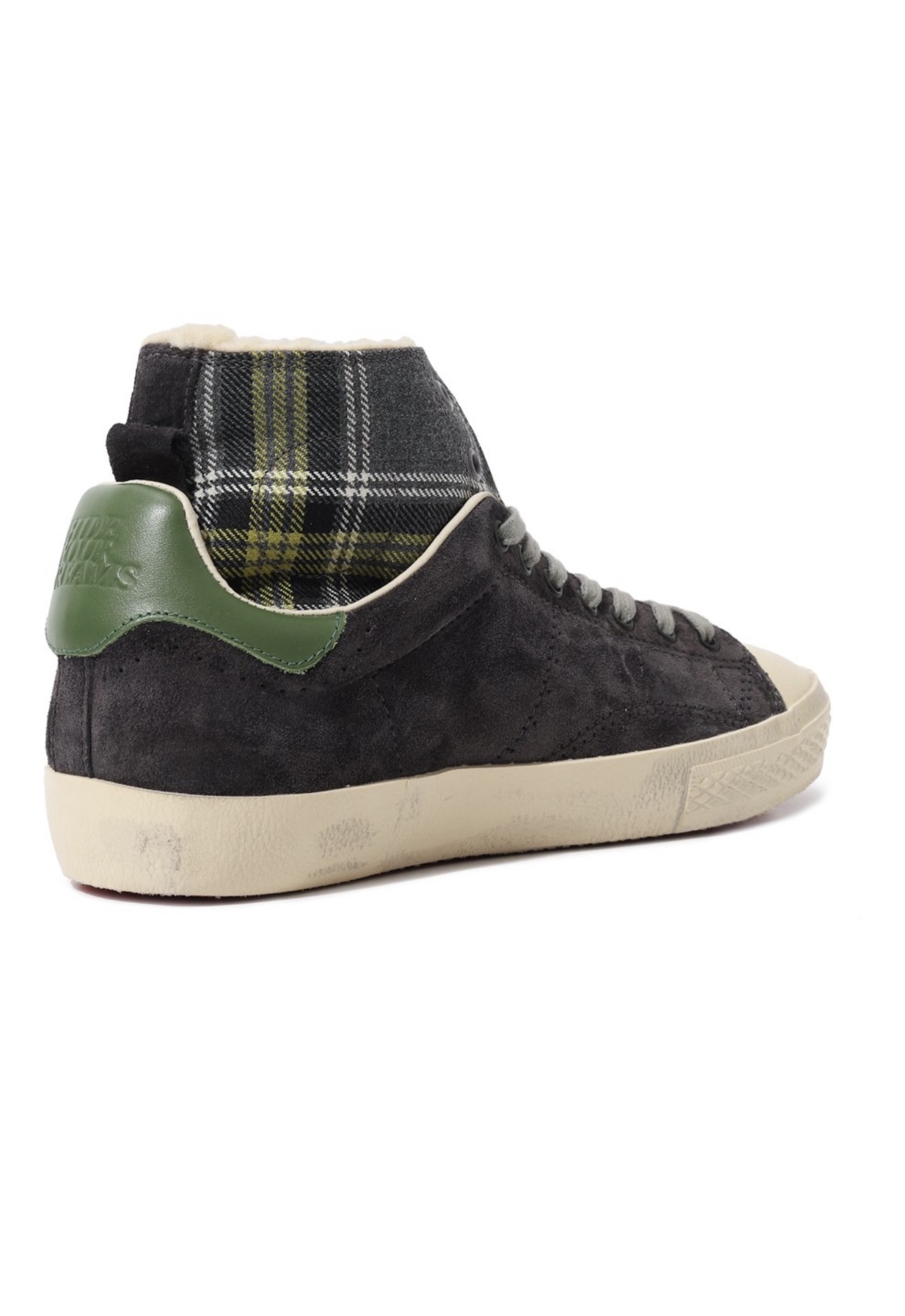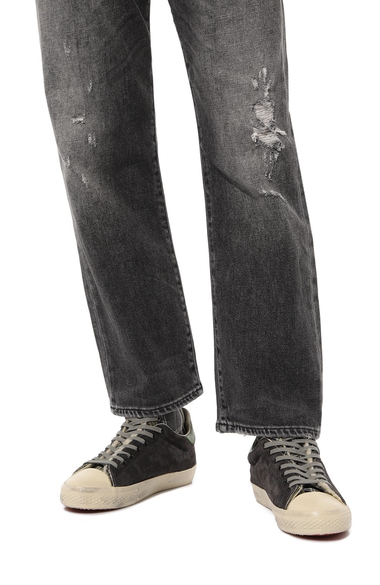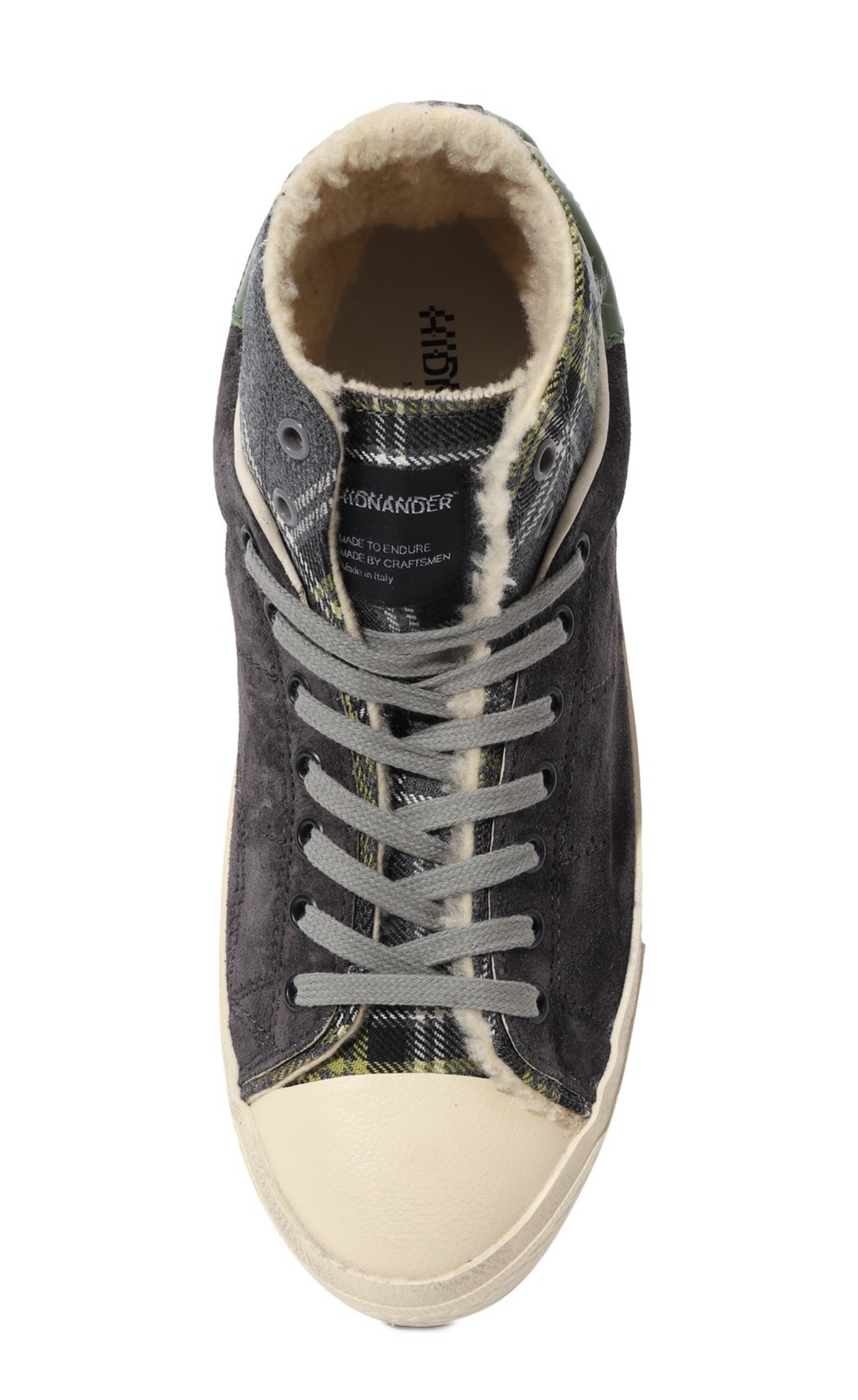 Темно-серые кеды Starless, представленные эксклюзивно в ЦУМе, словно скомбинированы из двух моделей. Такой эффект создает клетчатая отделка из мягкого текстиля, контрастирующая с бархатистой замшей, из которой выполнили основную часть. Пару с зеленой вставкой из плотной кожи, которой украсили задник, обработали так, чтобы сформировать небольшие потертости.