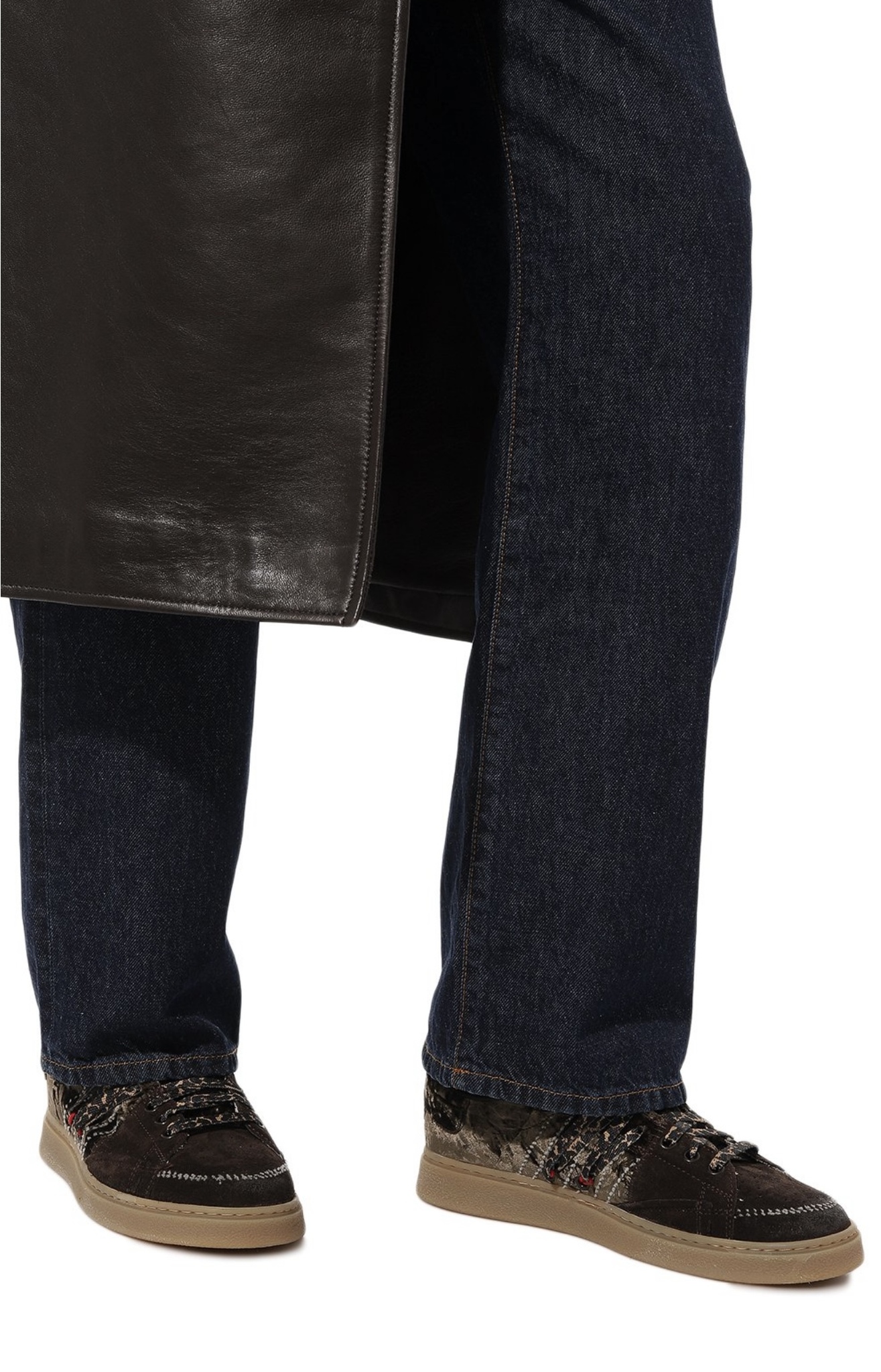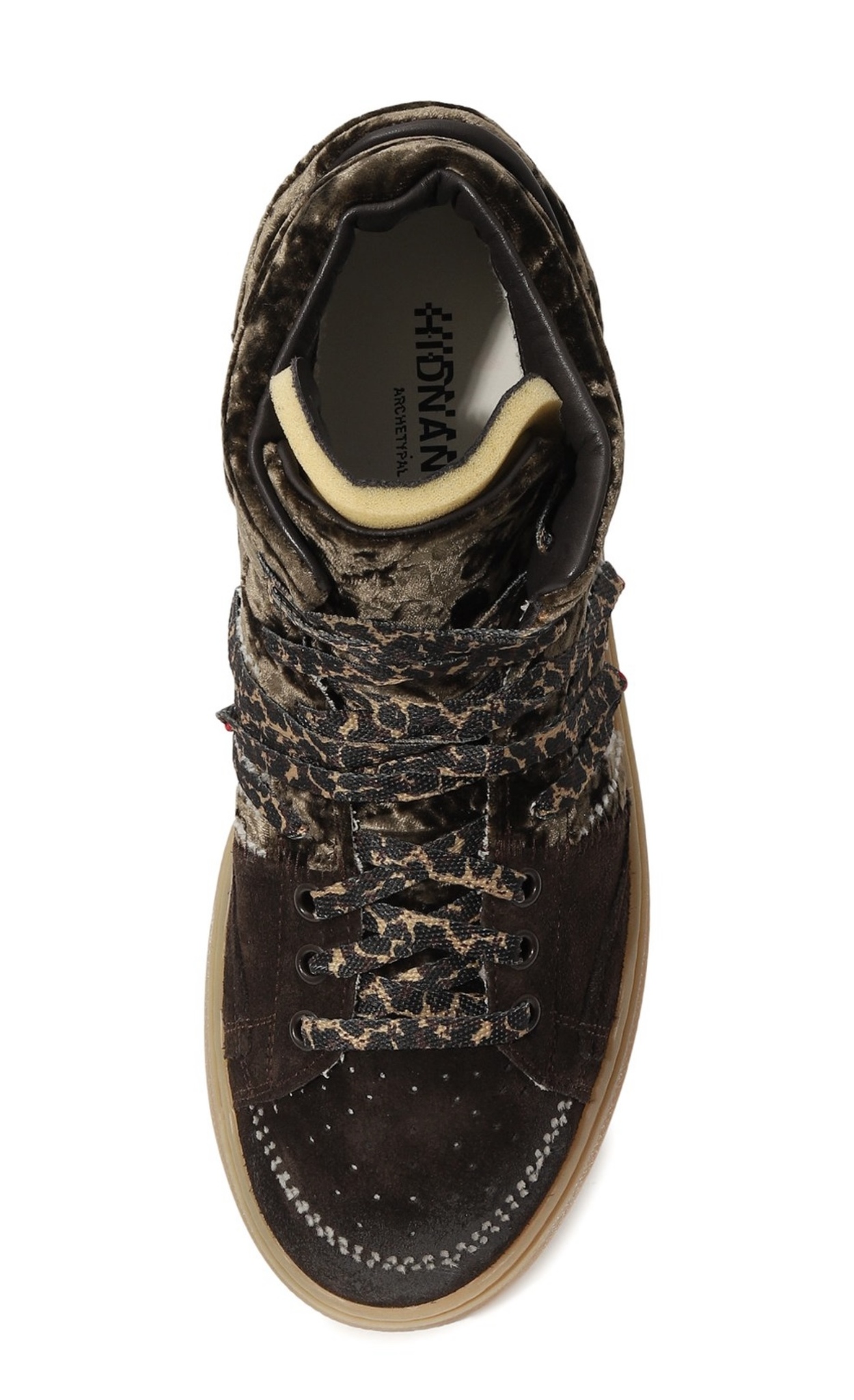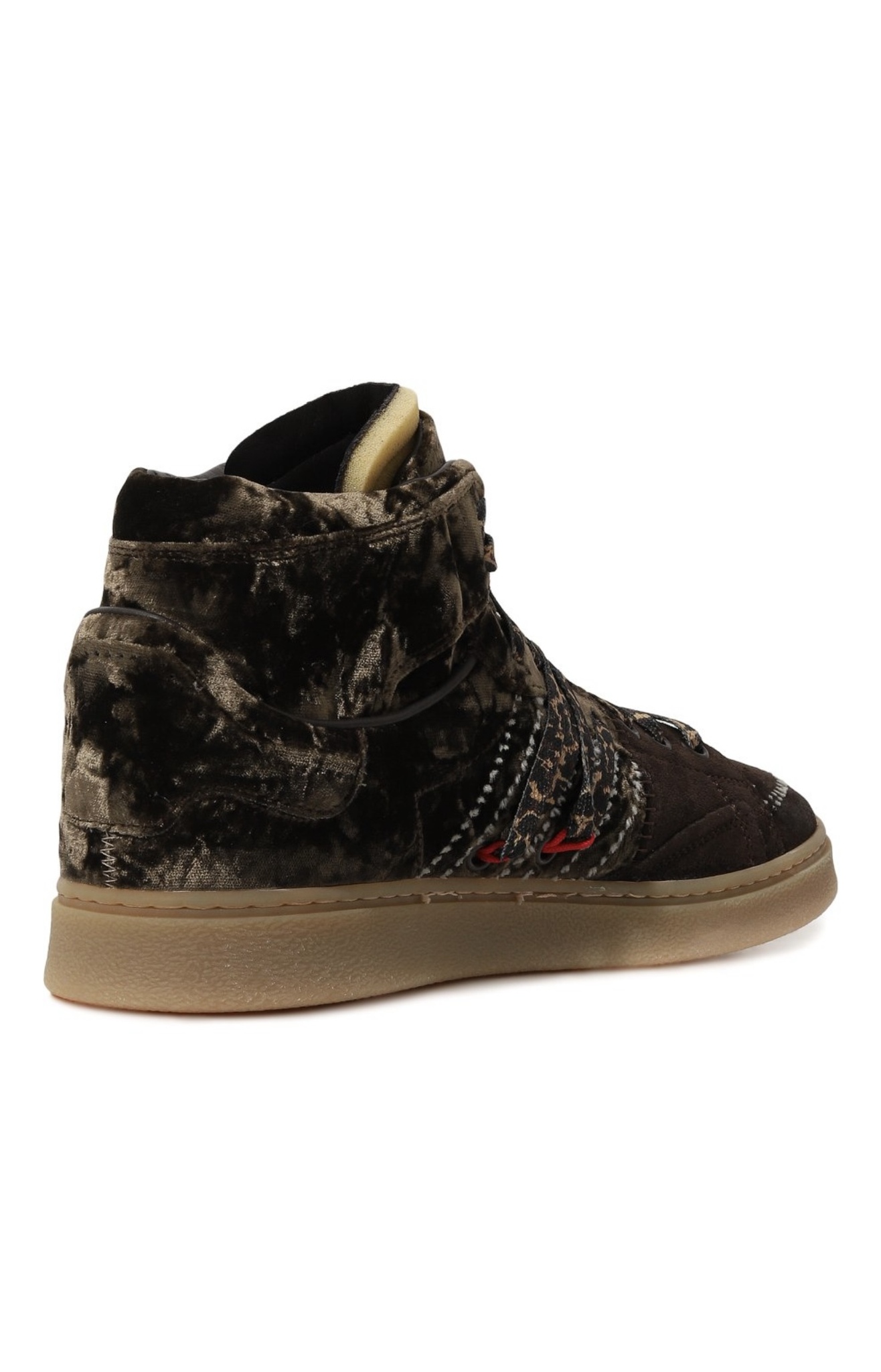Для изготовления темно-коричневых высоких кедов, представленных эксклюзивно в ЦУМе, мастера марки использовали эластичную замшу и прочный бархат с камуфляжным принтом. Система двойной шнуровки позволяет подобрать оптимальную посадку, а гибкая подошва хорошо амортизирует.