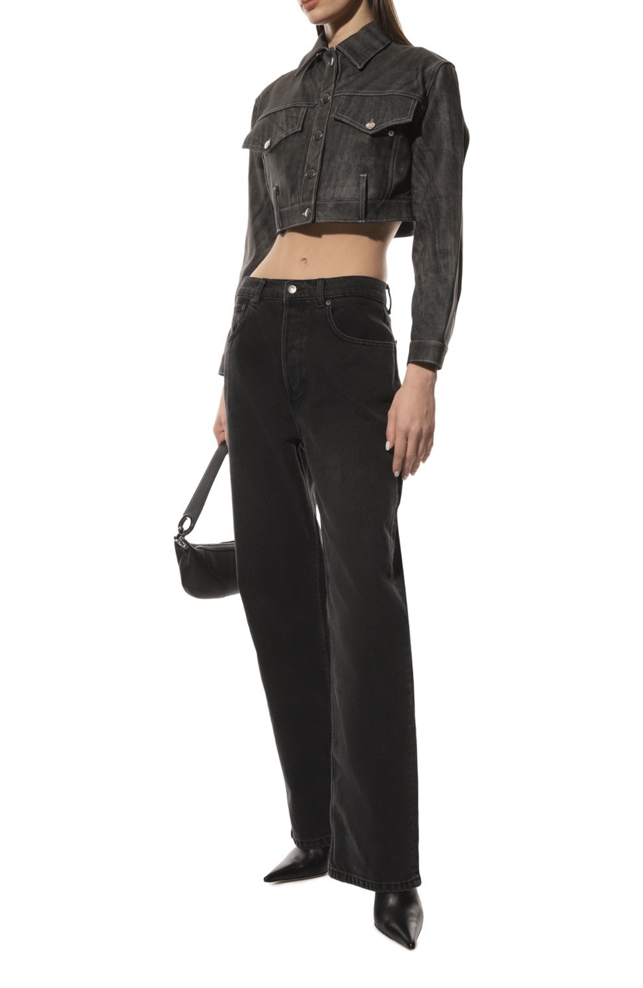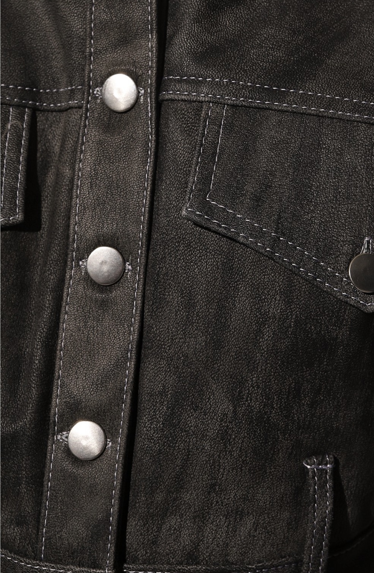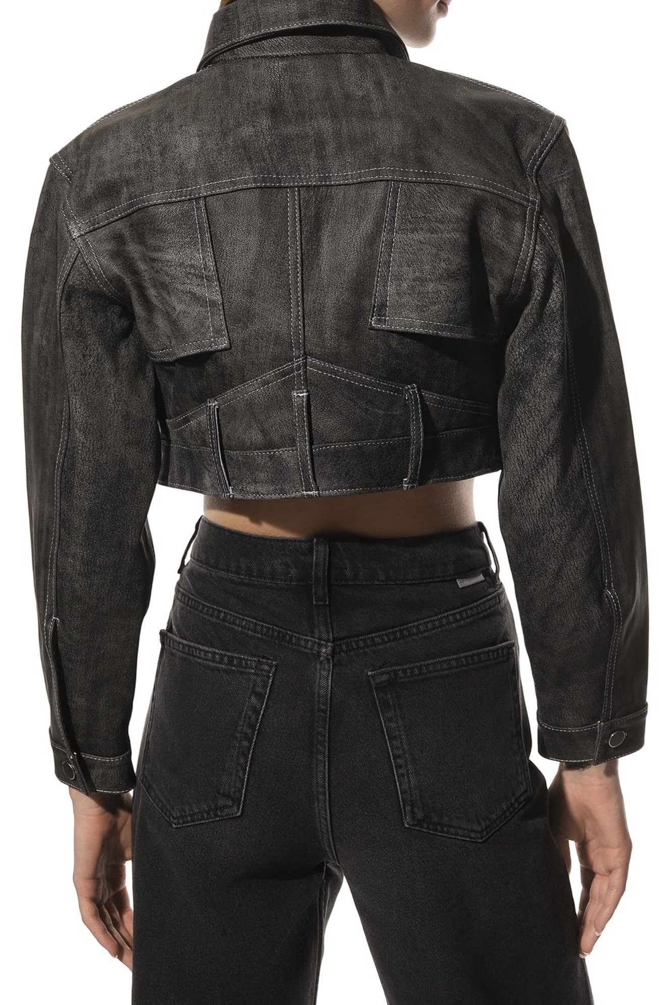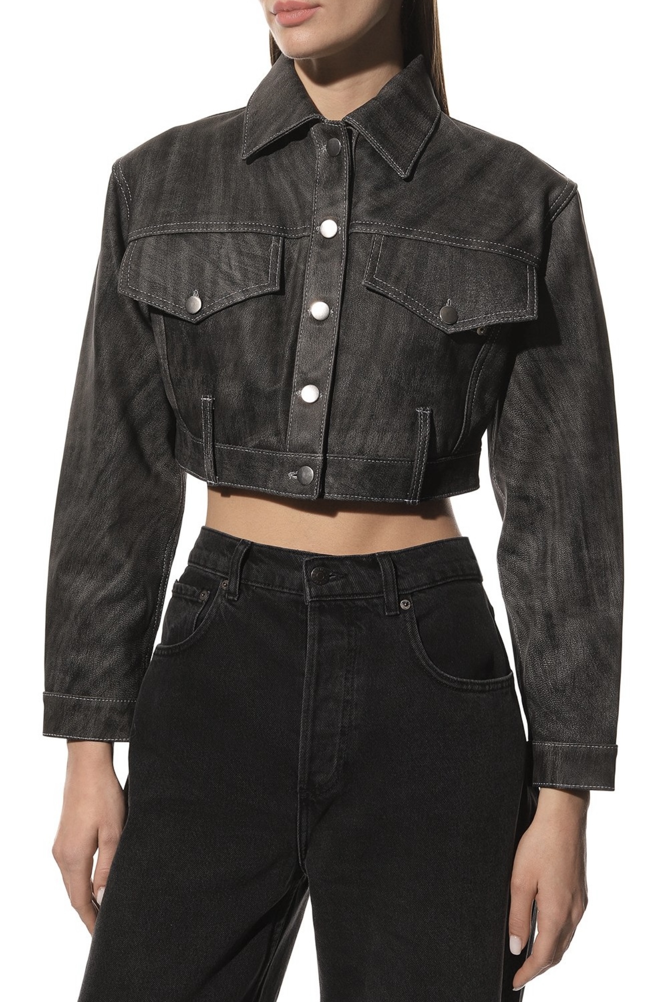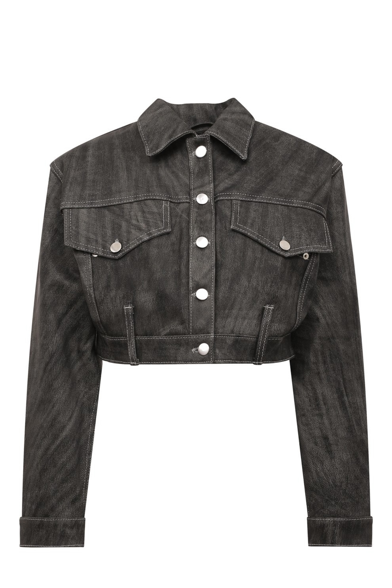 Укороченная серая куртка свободного кроя напоминает джинсовую модель с отложным воротником и накладными нагрудными карманами.Сходство добавляет и материал, обработанный под деним, словно выцветший со временем. Для пошива изделия с акцентированной линией плеч мастера марки использовали мягкую гладкую кожу ягненка, которая хорошо драпируется, не мешая двигаться.
