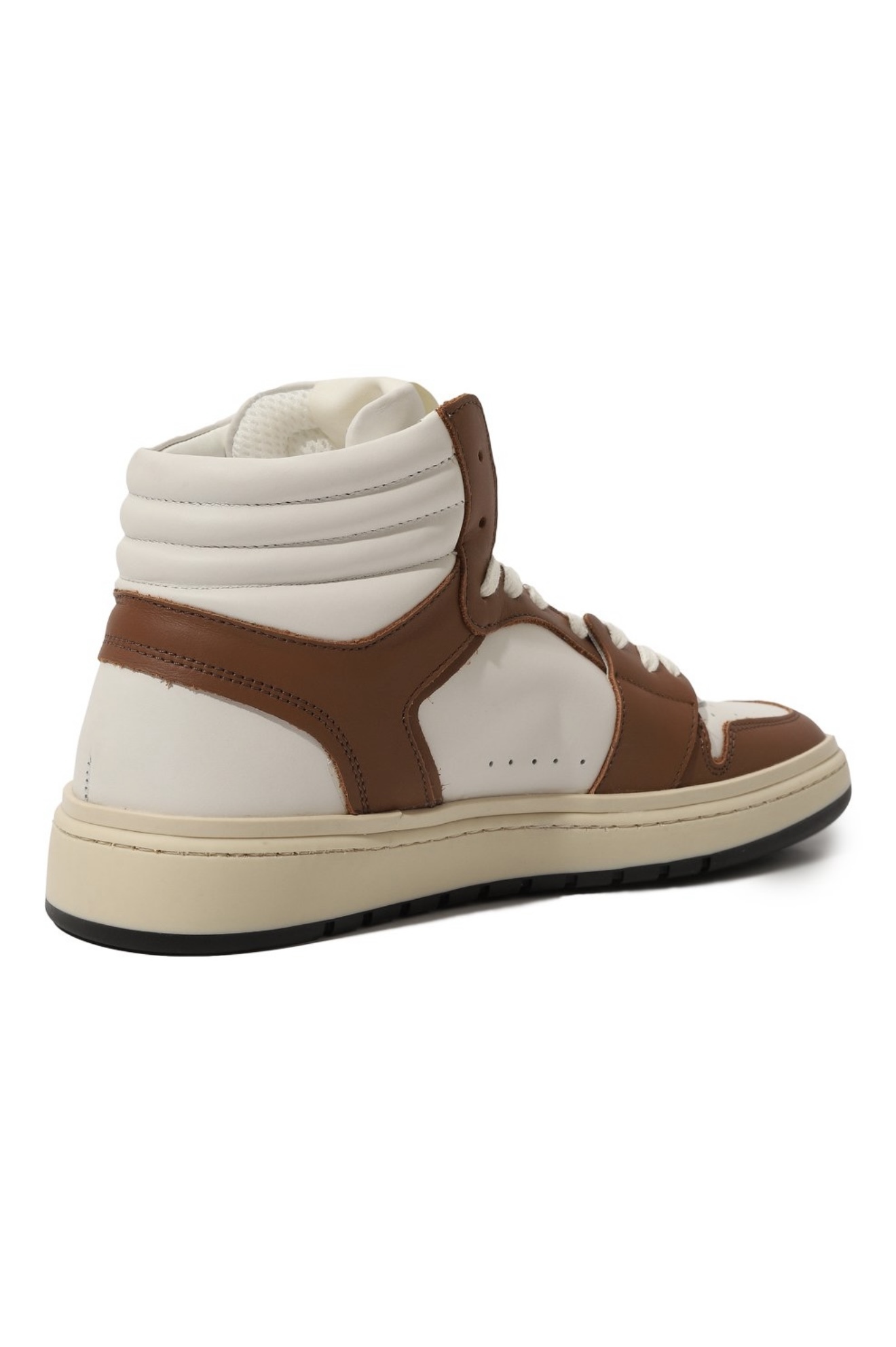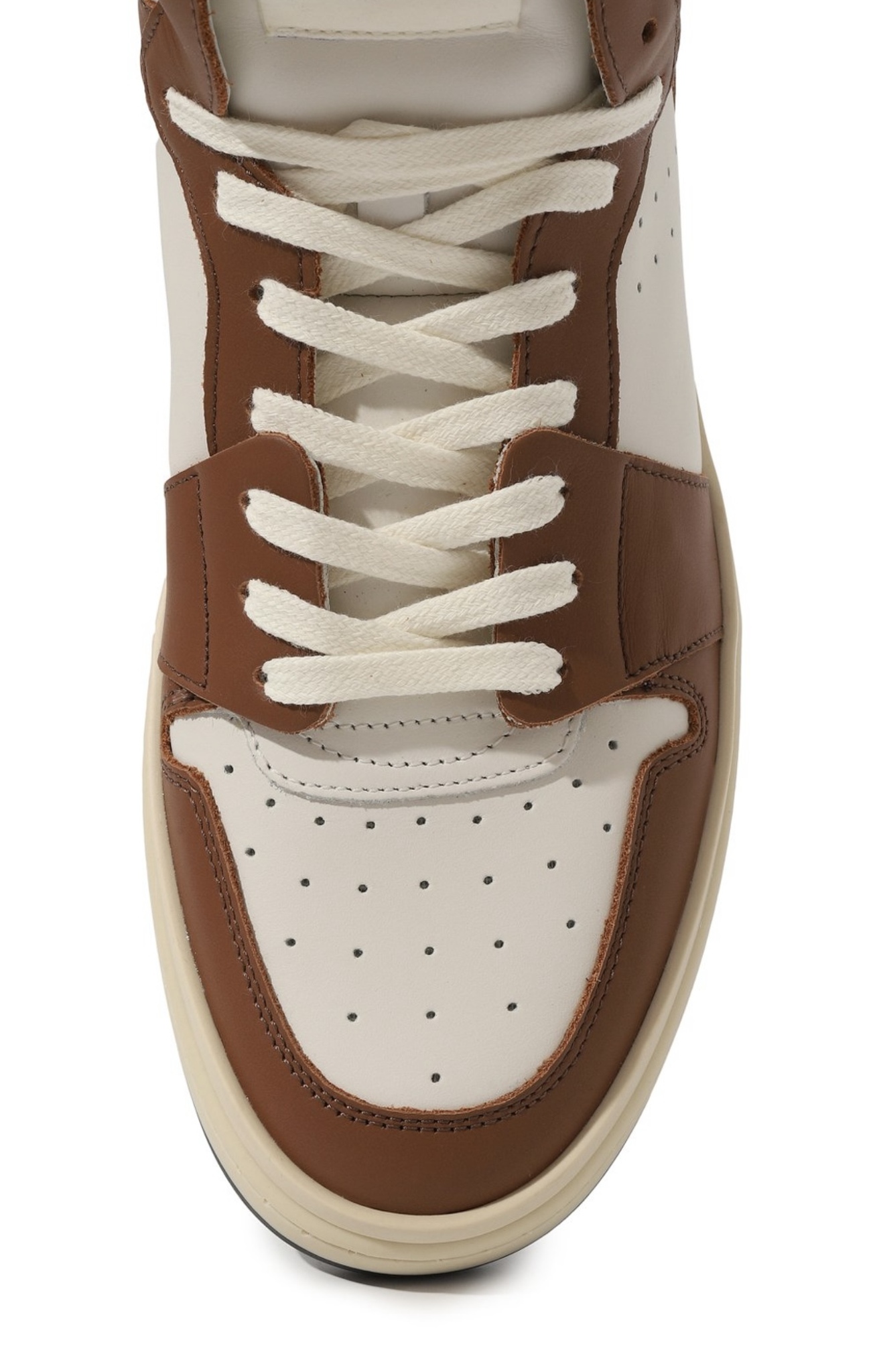 Высокие бело-коричневые кеды мастера марки сшили из гладкой мягкой наппы, которая подстраивается к форме стопы. Модель со стеганым объемным голенищем декорировали на язычке текстильным патчем с логотипом. Для оптимальной циркуляции воздуха на мысе и боковых панелях предусмотрели перфорацию.