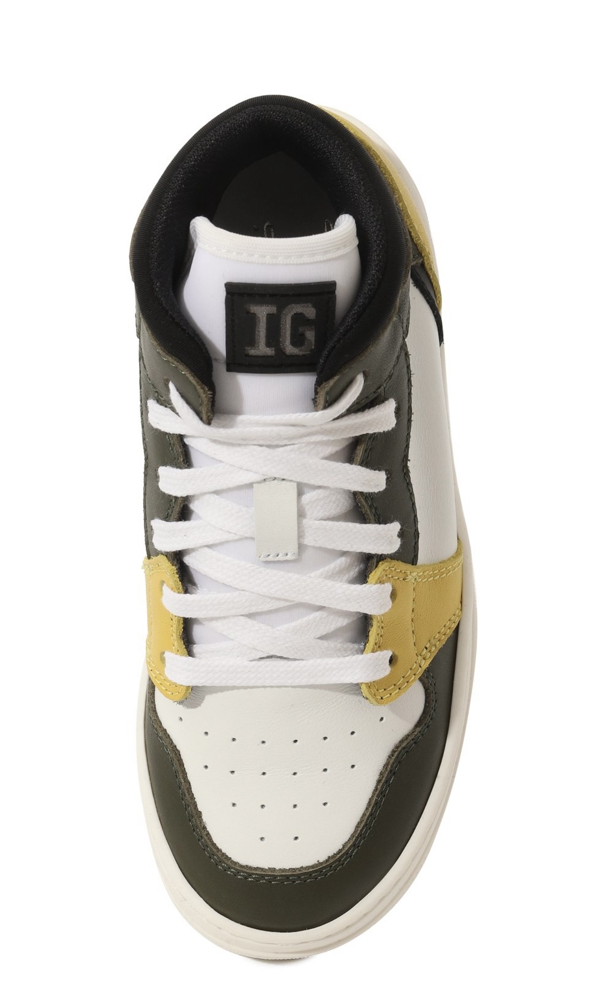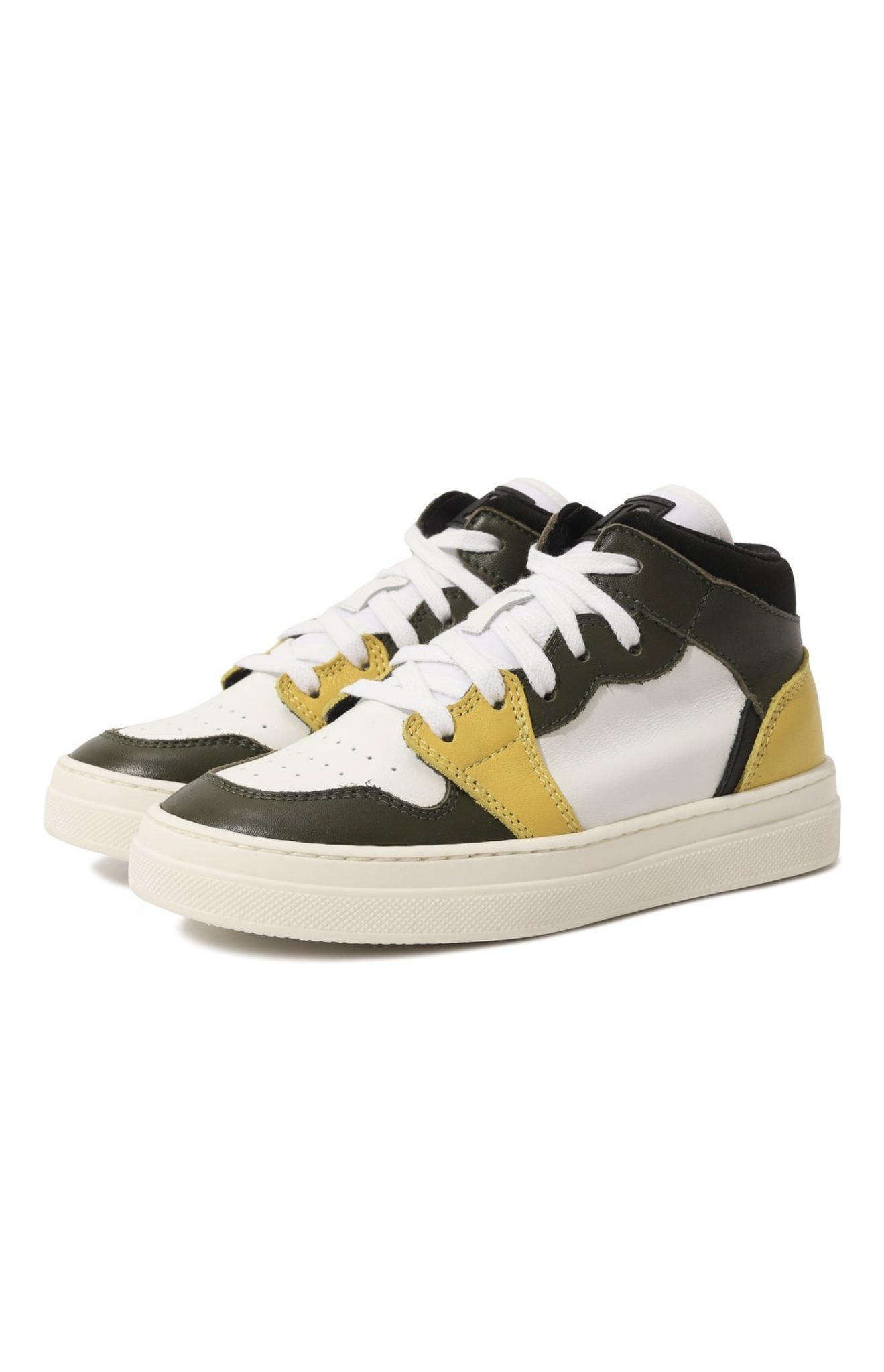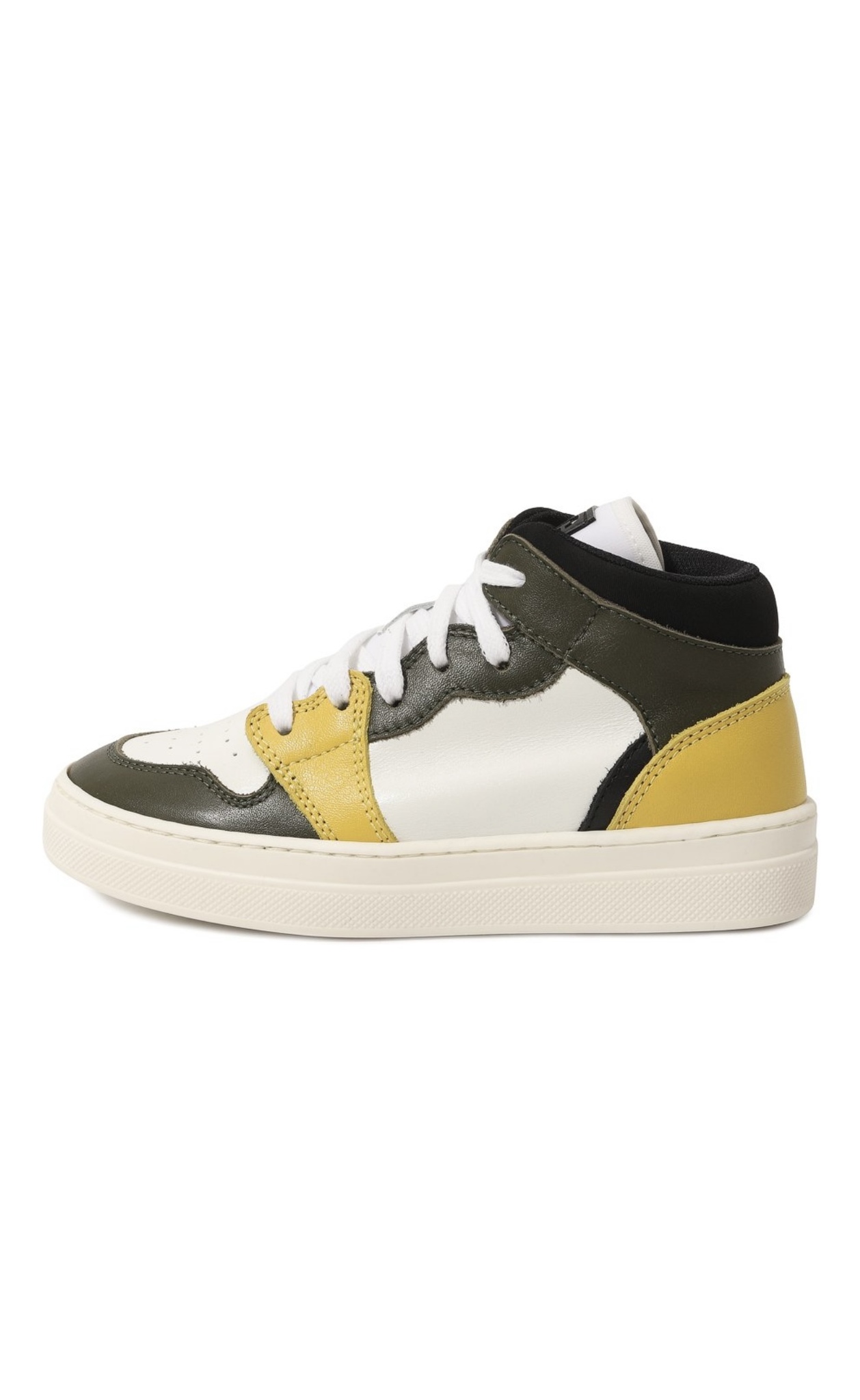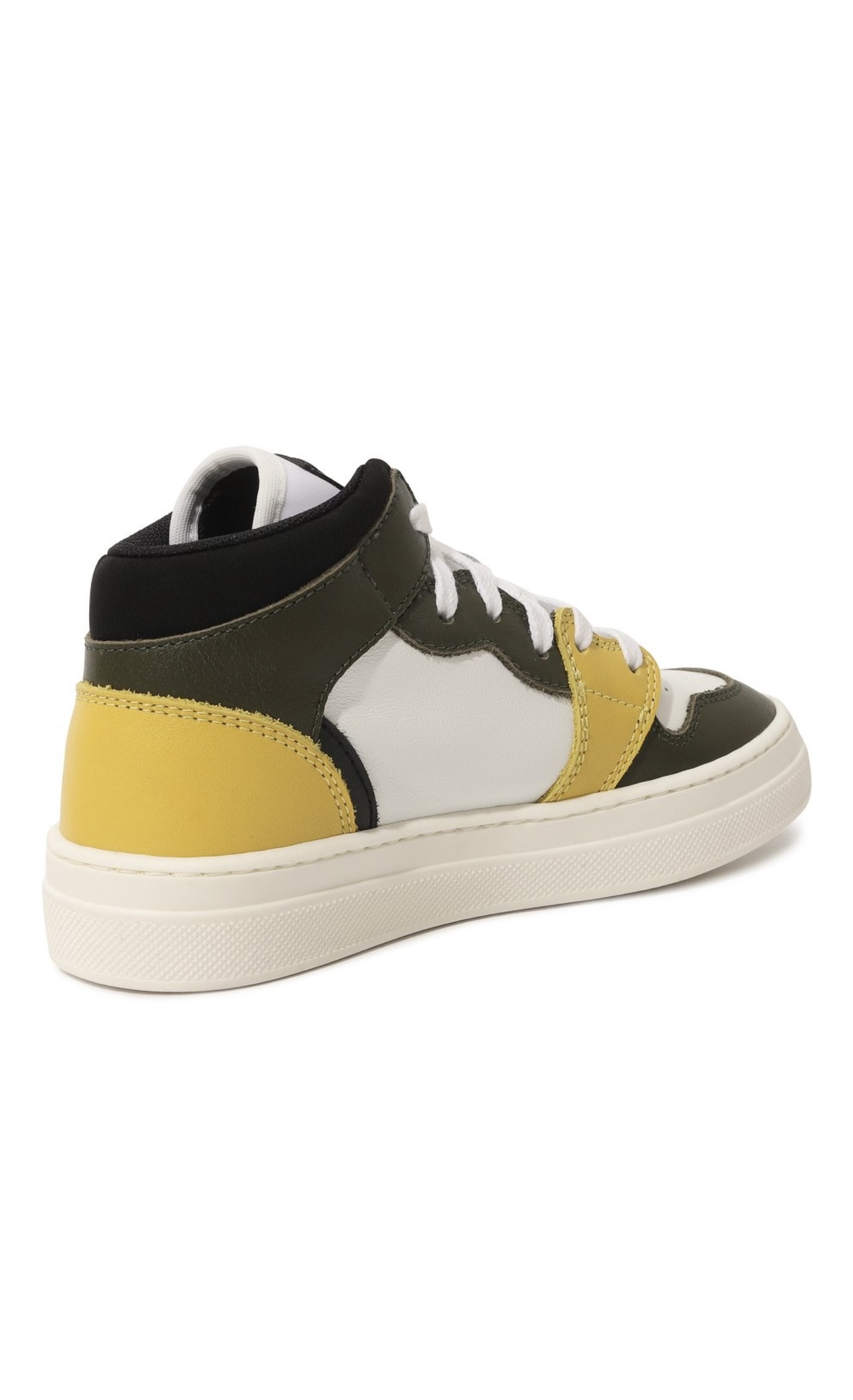 Для изготовления высоких кедов мастера марки использовали гладкую мягкую кожу трех разных оттенков: хаки, белого и желтого. Чтобы модель плотно облегала щиколотку и не натирала, ее дополнили объемной мягкой вставкой из прочного текстиля. О принадлежности пары бренду говорит патч с эмблемой на язычке.