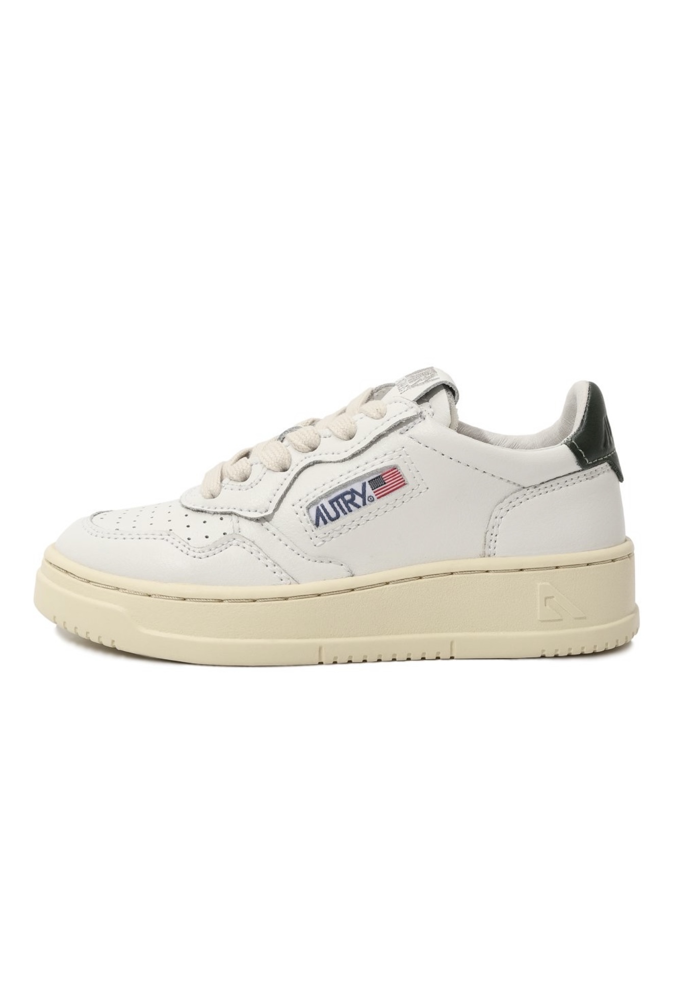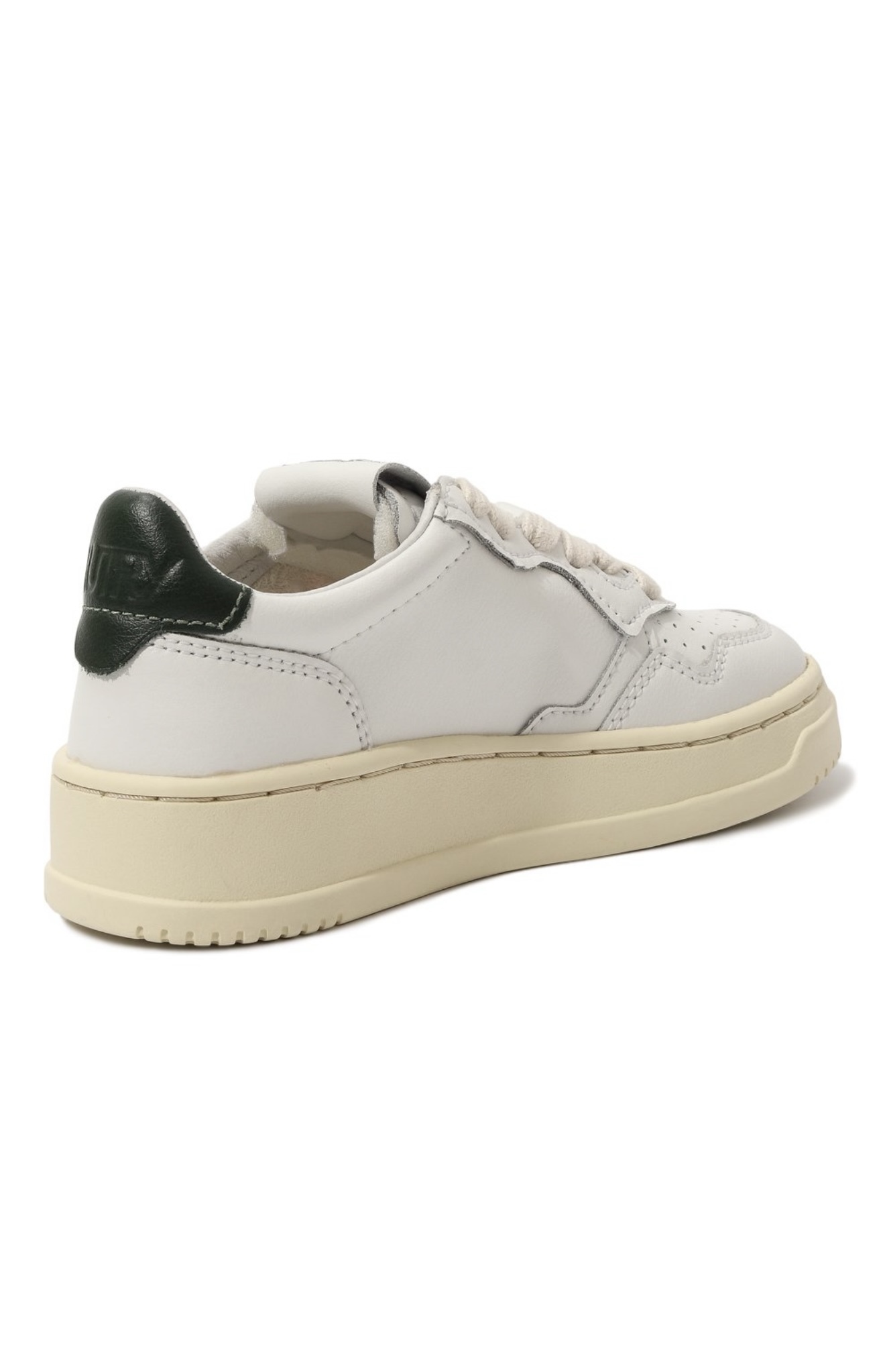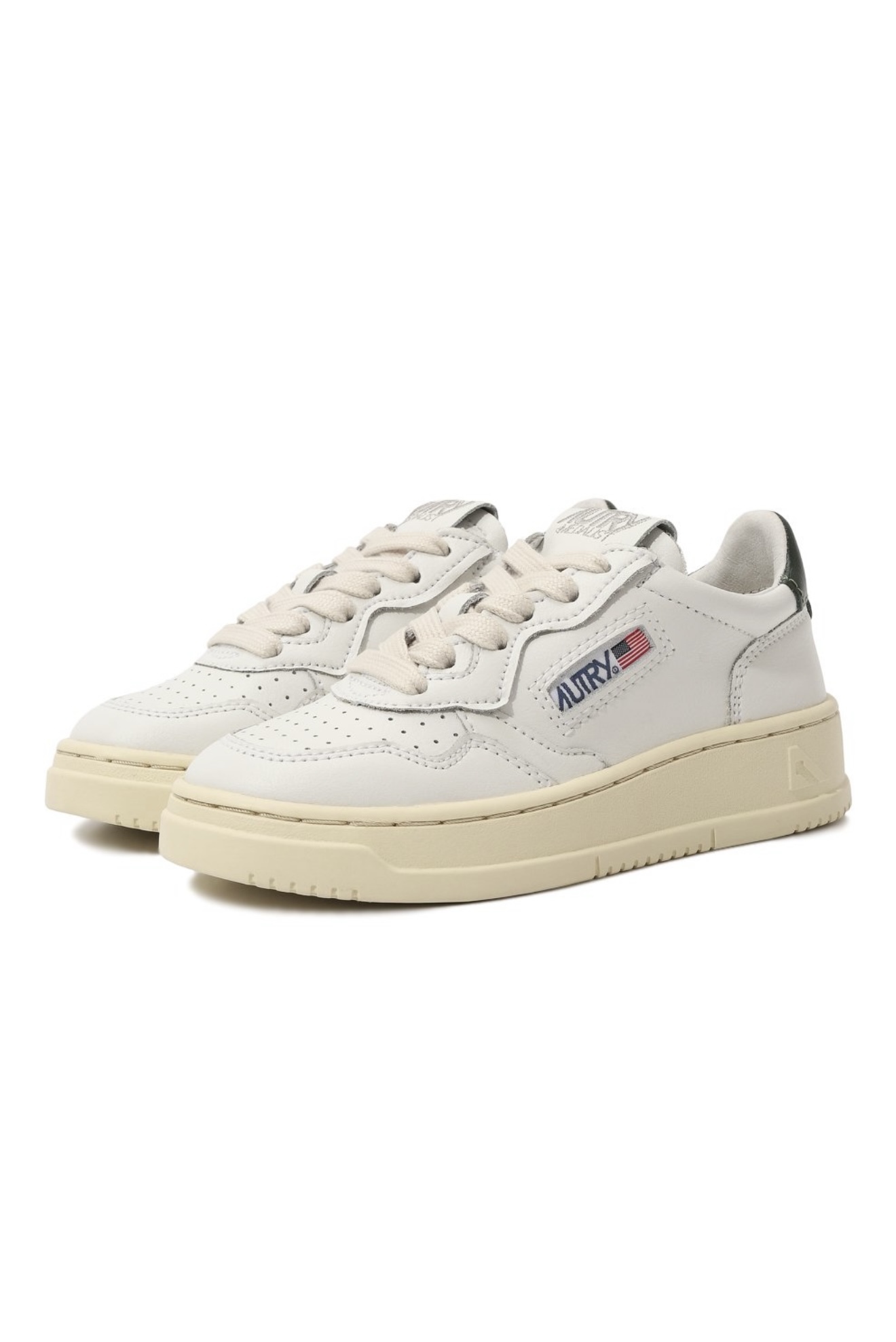 Белые кеды на широкой подошве оттенка слоновой кости мастера марки выполнили из мягкой матовой кожи. Модель украсили перфорацией, которая выполняет не только декоративную, но и функциональную роль, обеспечивая циркуляцию воздуха. Задник выделили черной накладкой с тисненым логотипом, а сбоку разместили знаковую брендированную вставку.