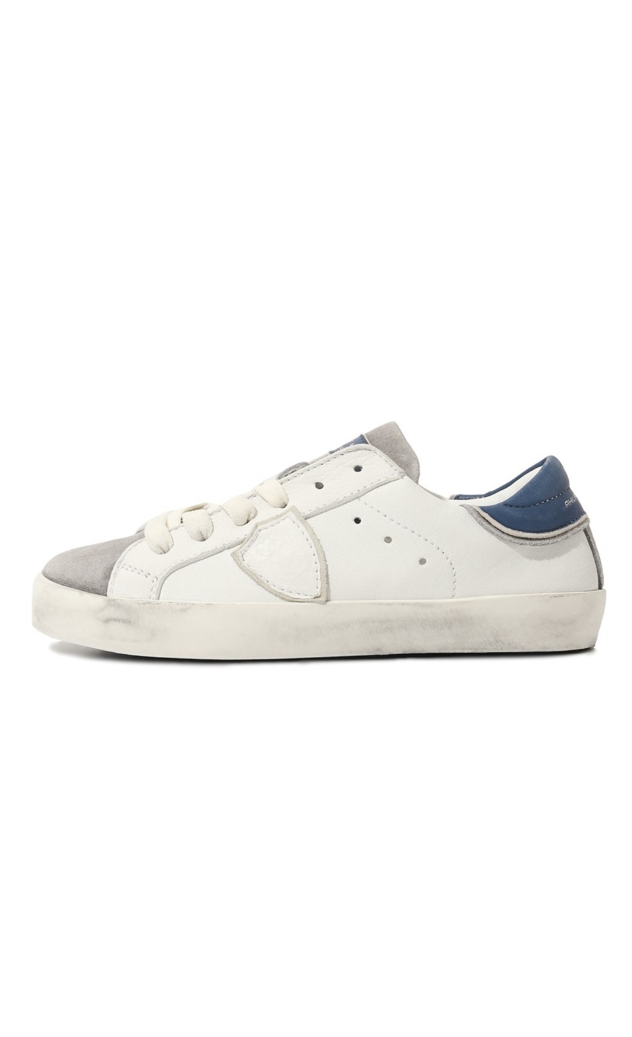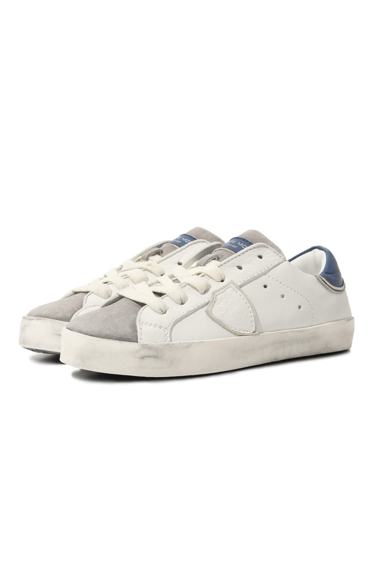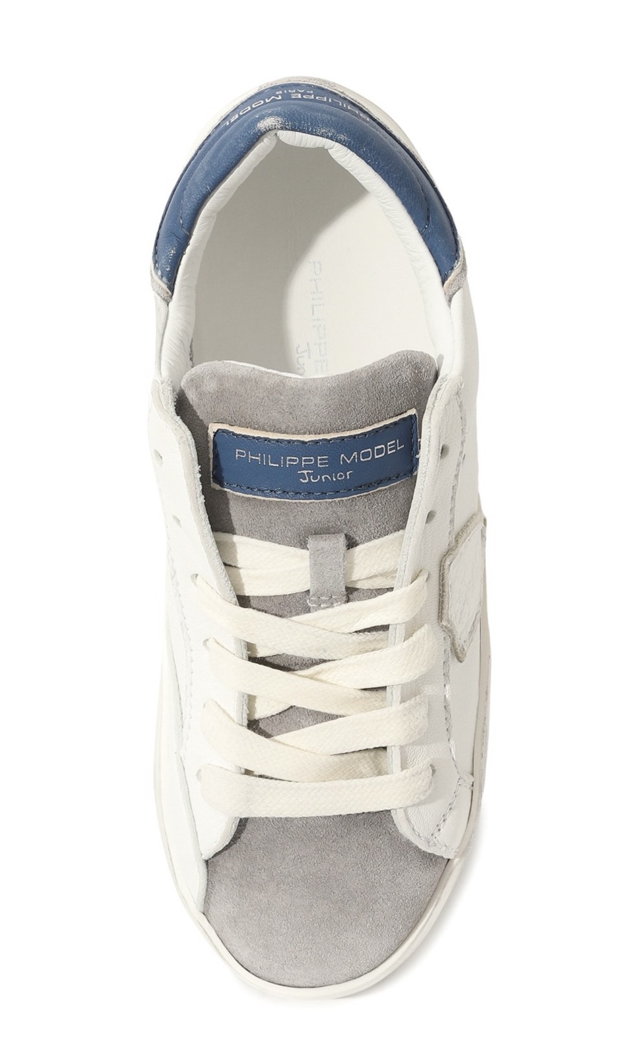 Кеды из линии Paris цитируют обувь из взрослой коллекции бренда. Совпадают и форма, и декор, и материал: пару сшили из мягкой, тщательно выделанной кожи, которая быстро подстраивается под индивидуальные особенности стопы. Круглый мыс и язычок выполнили из фактурной замши серого оттенка, а цветовые акценты создали синими накладками.