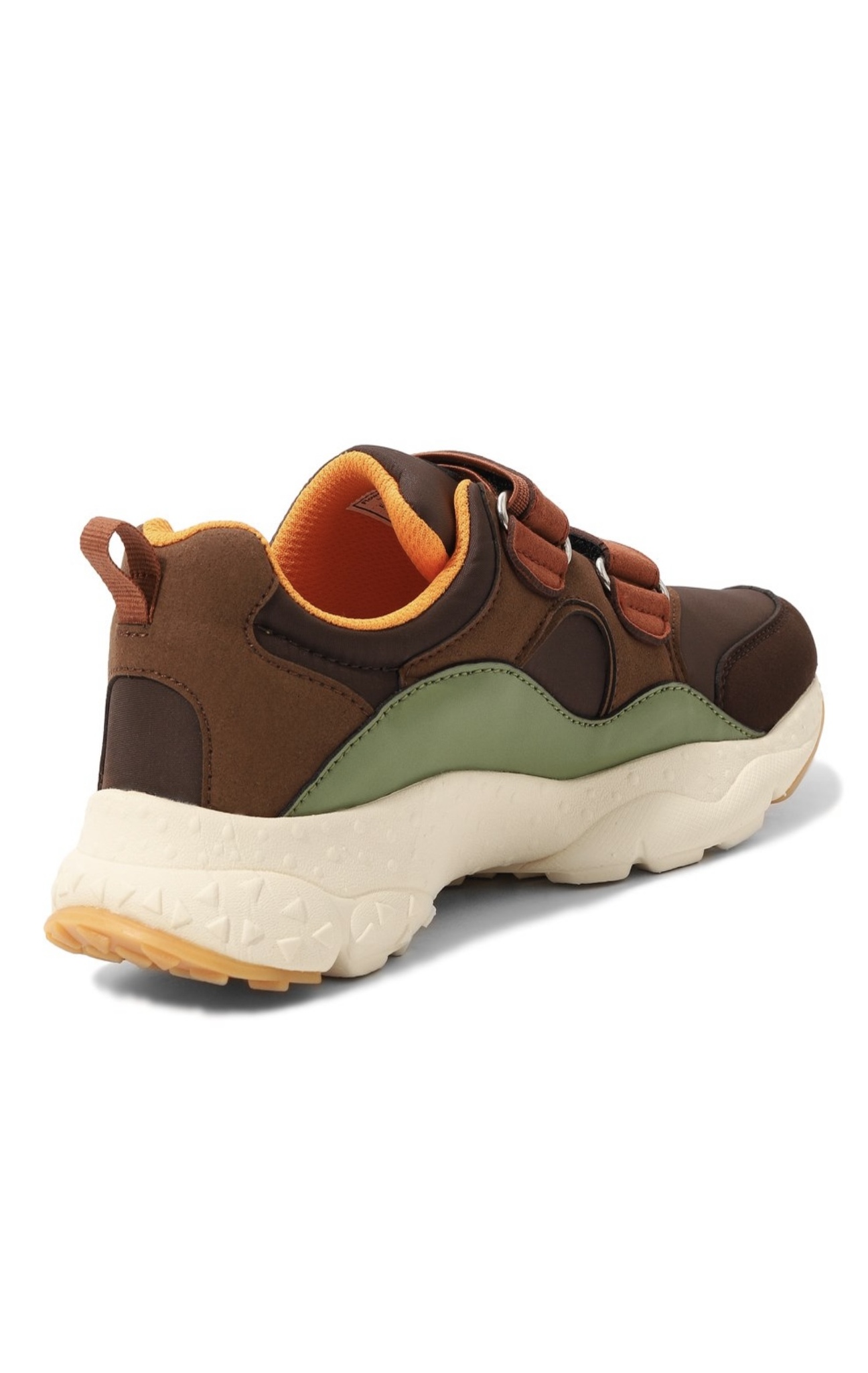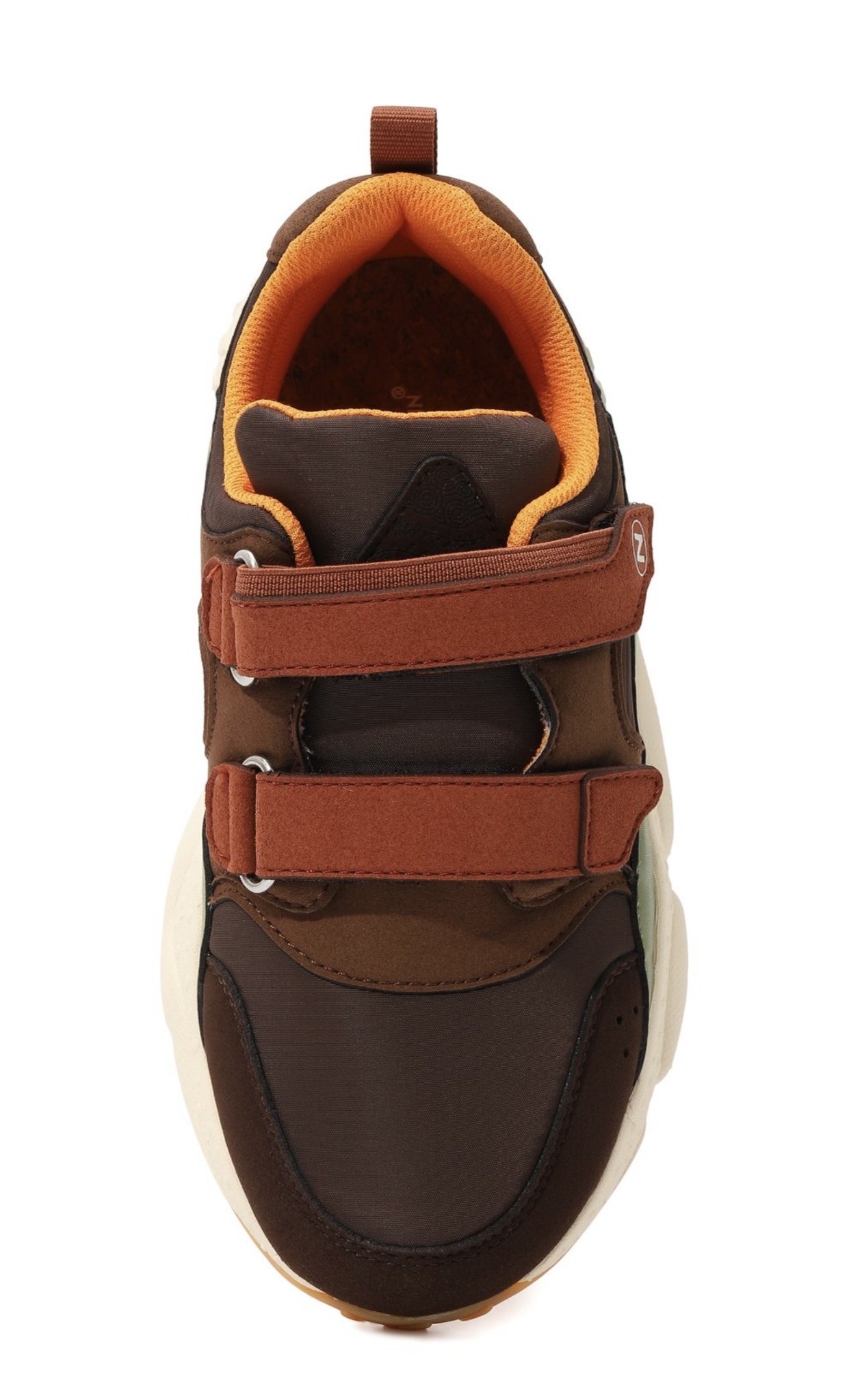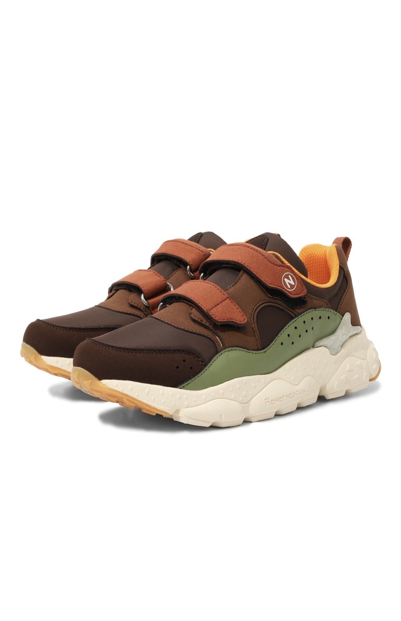 Кроссовки выполнили в технике color block из плотного текстиля, укрепив пару бархатистыми и гладкими деталями. Обувь на широкой подошве дополнили анатомической стелькой из дышащего пробкового дерева. Посадку удобно регулировать двумя ремешками велкро.