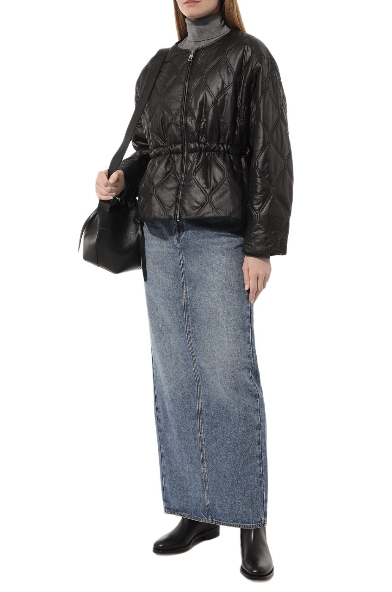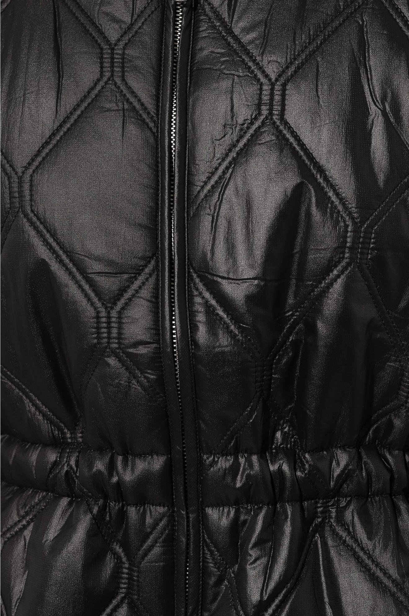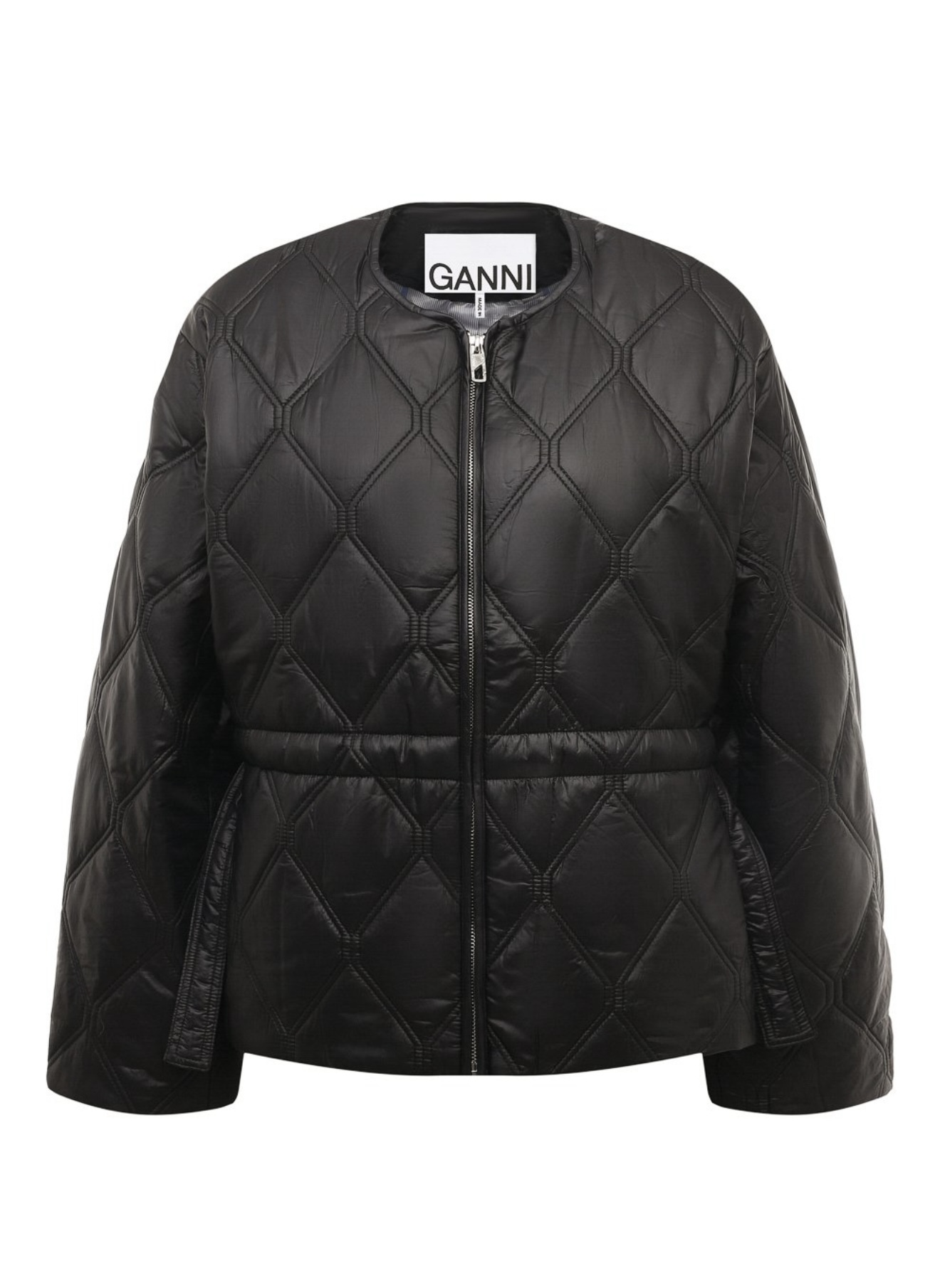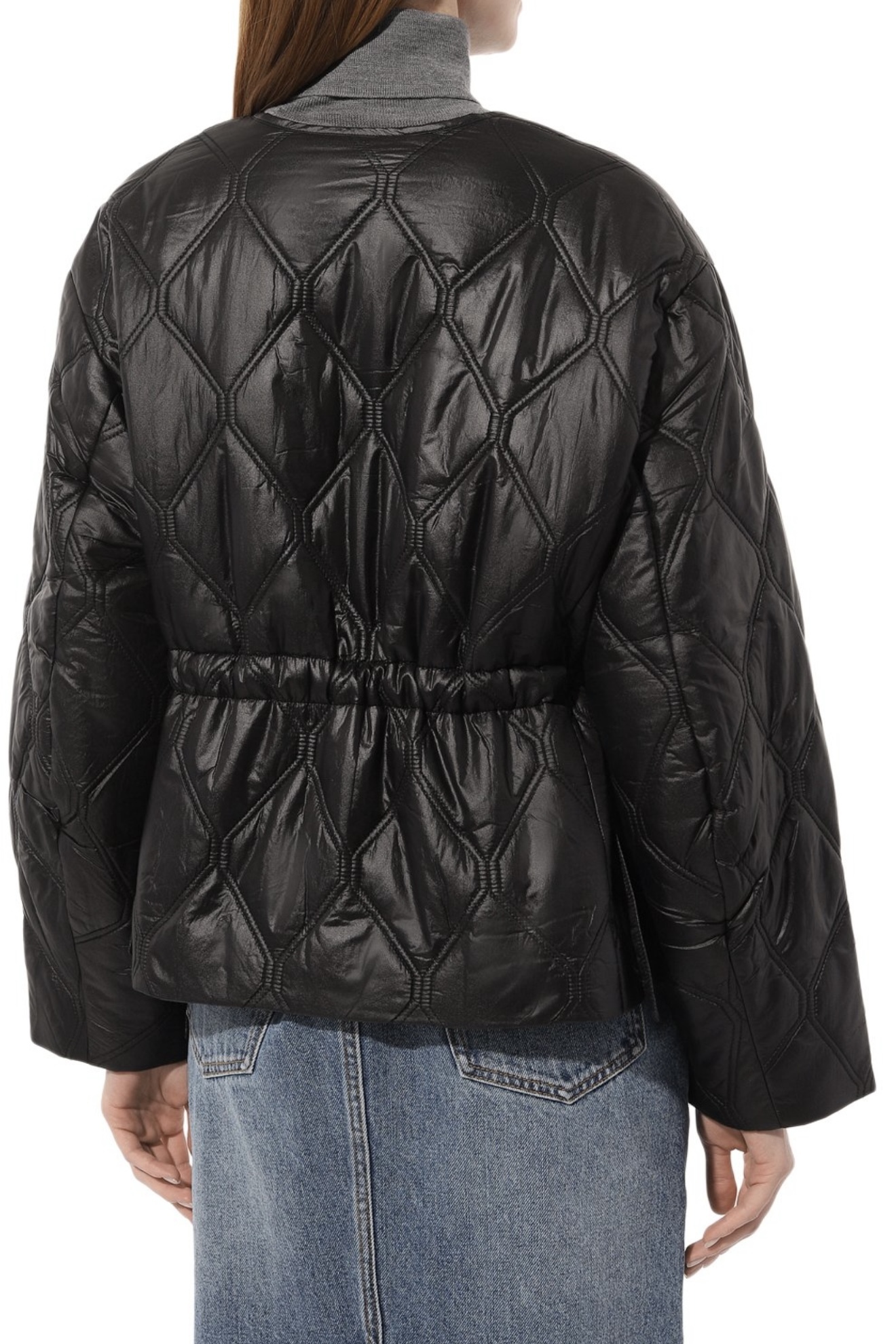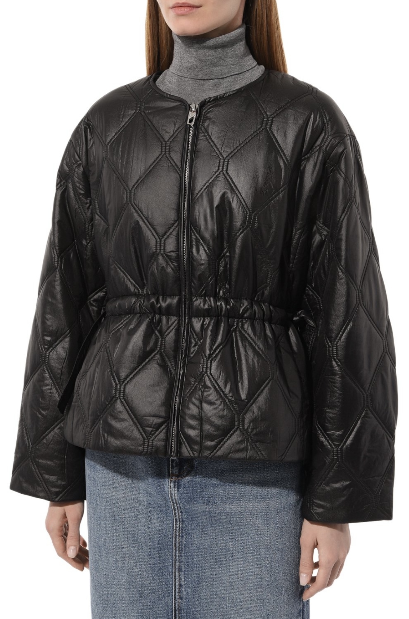 Черную куртку со стеганым геометрическим узором изготовили из шелковистого прочного нейлона с деликатным блеском. Материал произвели из переработанных пластиковых отходов, что помогло сэкономить первичные ресурсы и уменьшить нагрузку на планету. Модель с круглой горловиной дополнили регулируемой кулиской, акцентирующей внимание на линии талии.