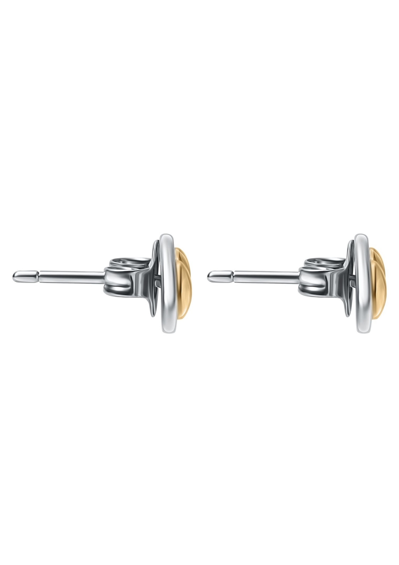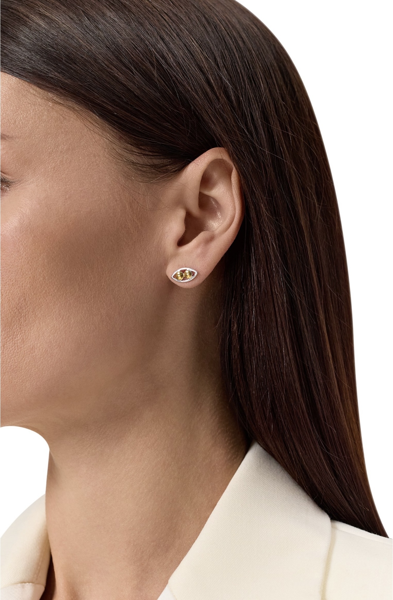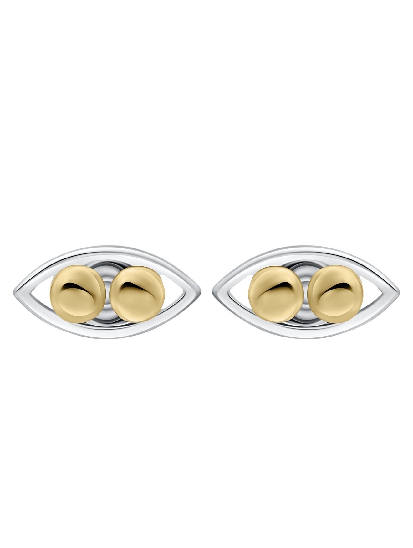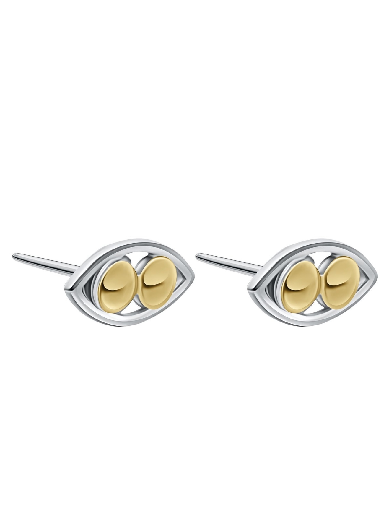 Небольшие серьги-пусеты Oracle выполнили из серебра 925-й пробы с покрытием родием. Модель в форме глаза украсили двумя круглыми вставками, имитирующими зрачки.