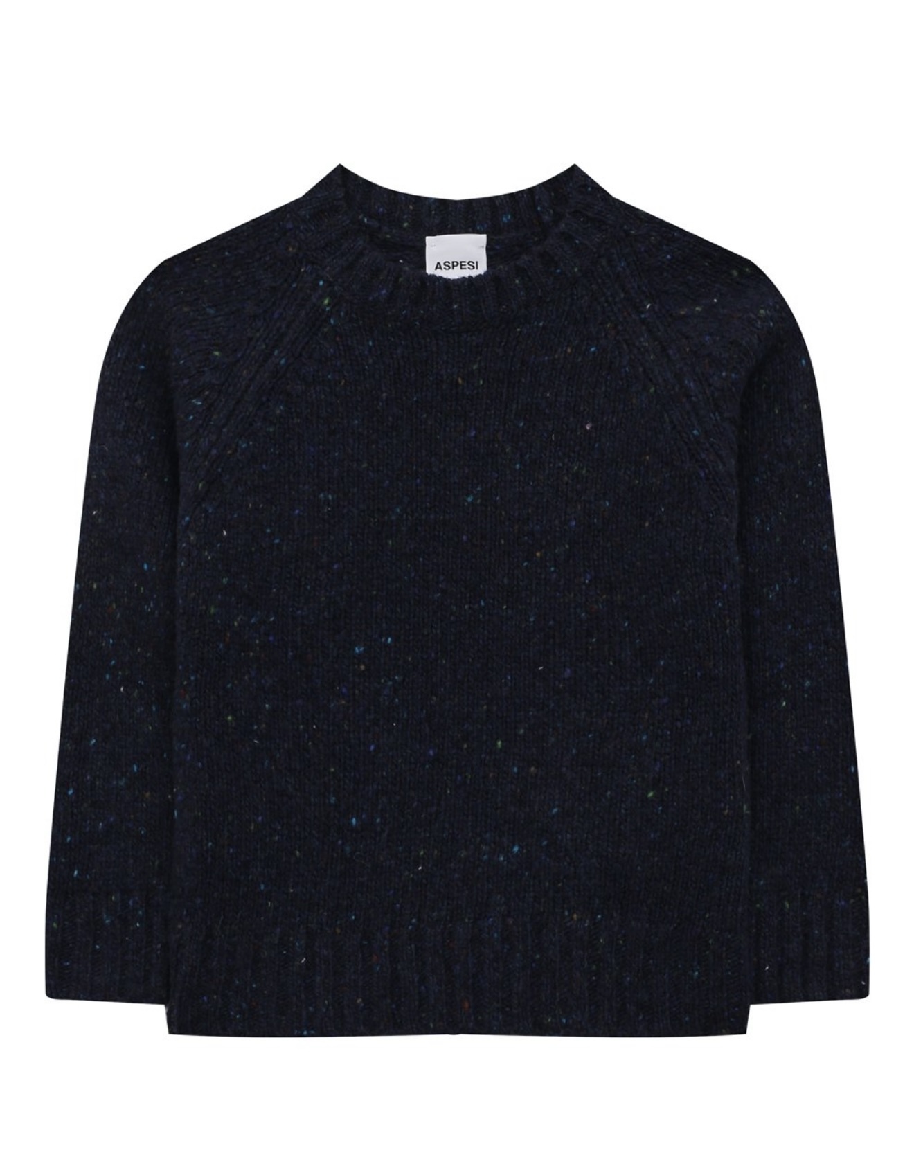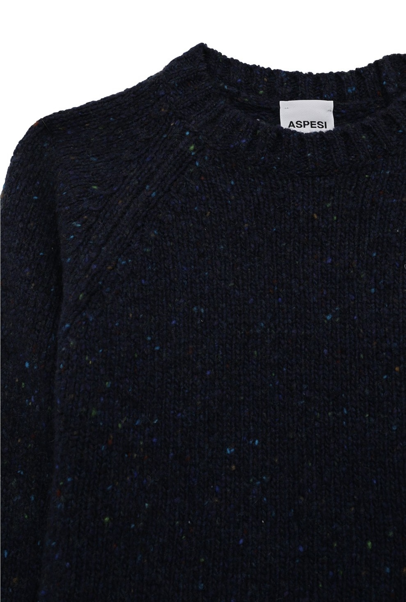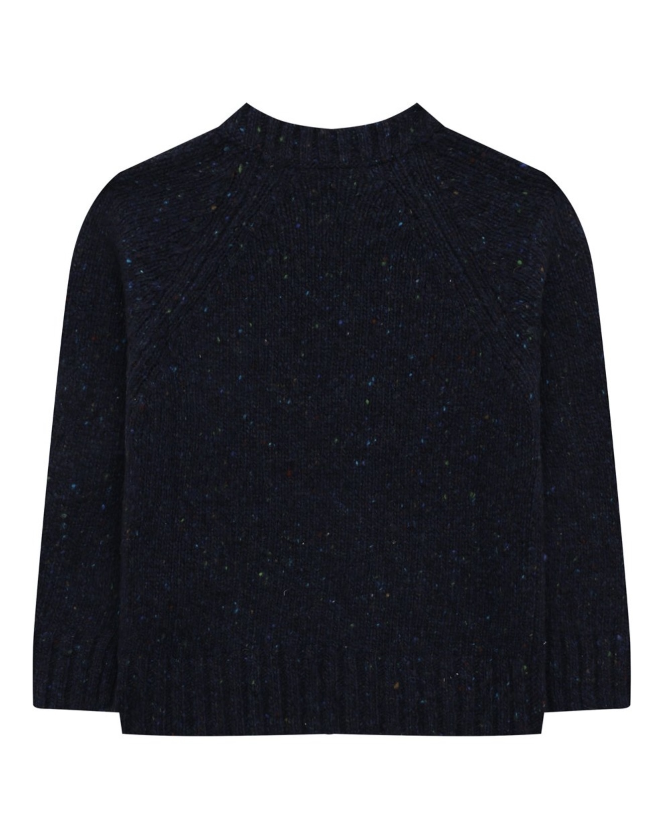 Синий пуловер с круглым вырезом и рукавами реглан, повторяющими контуры тела, связали из мягкой твидовой пряжи, в которой тонкую шерсть соединили с нежной вискозой и прочным нейлоном. Модель из такого материала хорошо удерживает тепло и при этом пропускает воздух, поэтому в ней будет комфортно и на улице, и в помещении.
