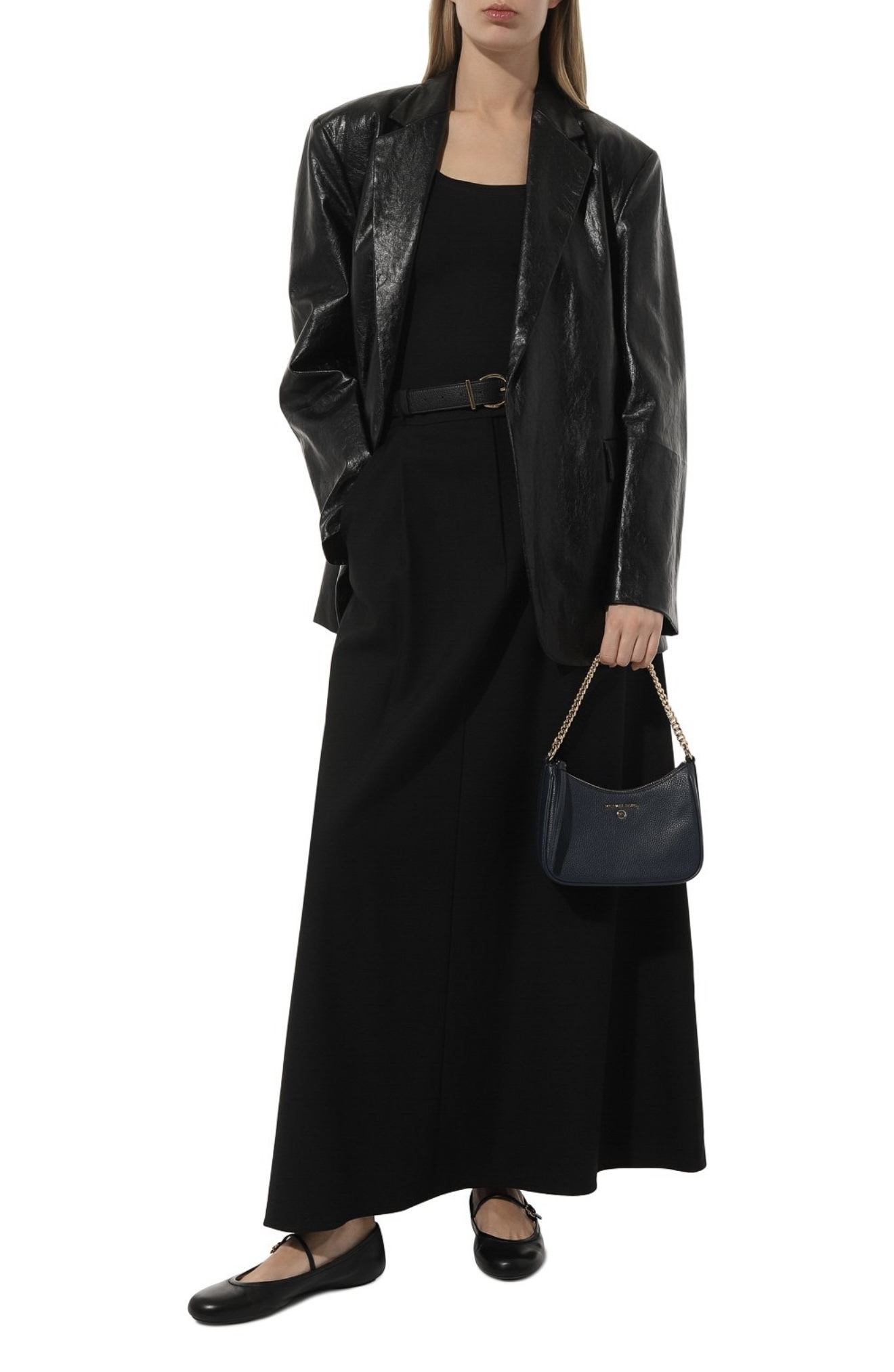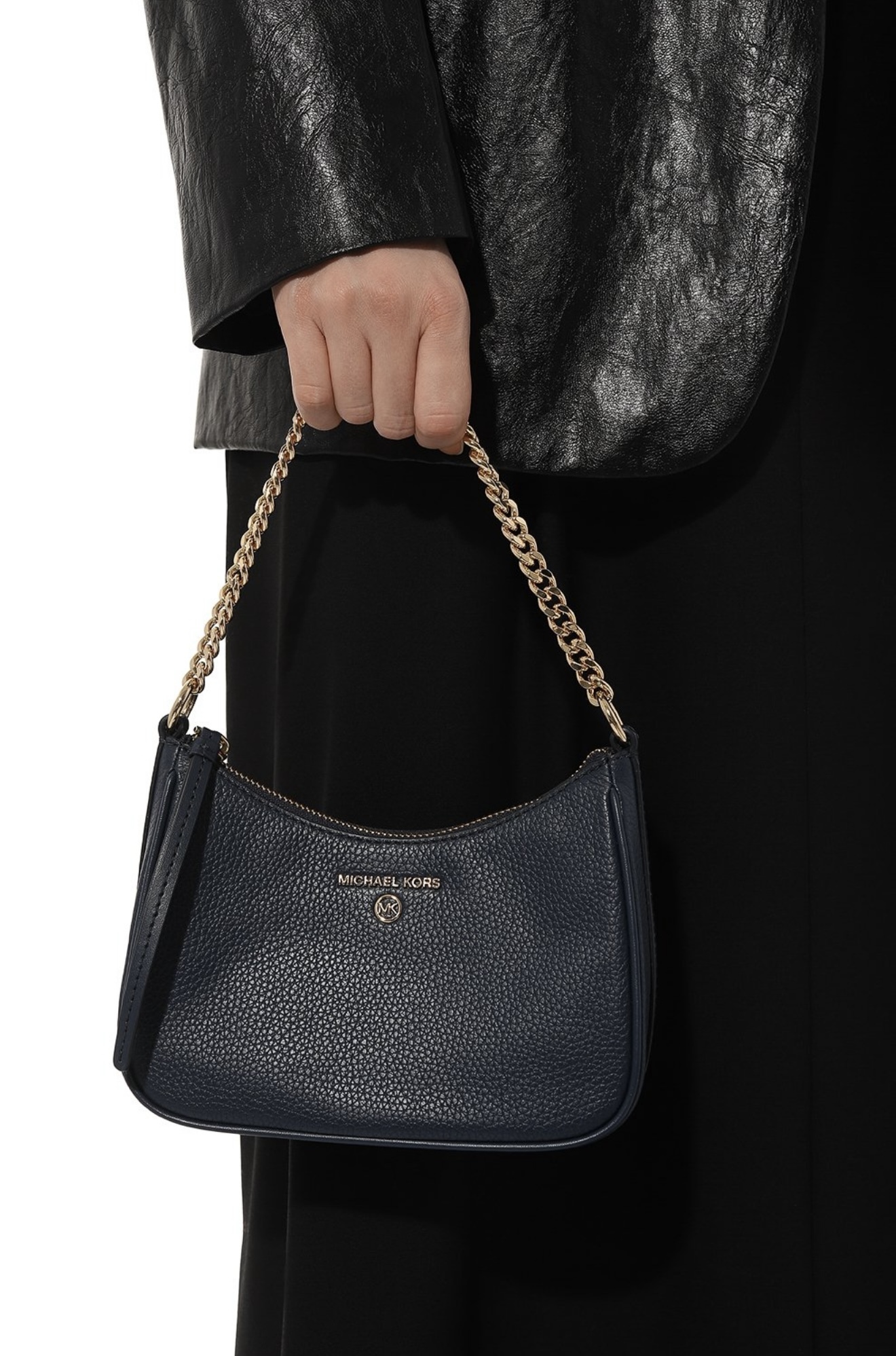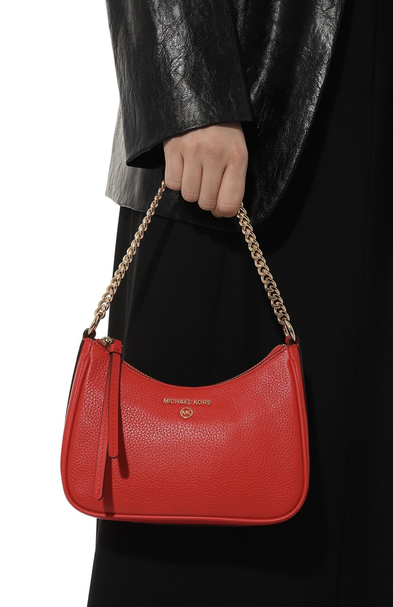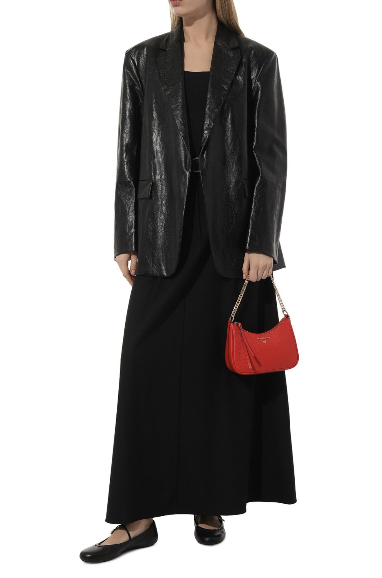 Ярко-красный цвет автоматически выводит небольшую сумку Jet Set Charm в центр внимания, делая ее главной деталью образа. Для изготовления аксессуара использовали мягкую крупнозерненую кожу. С ручкой-цепочкой из золотистого металла зарифмовали накладку в виде логотипа марки, основанной Майклом Корсом. Внутрь поместятся смартфон, картхолдер, очки.