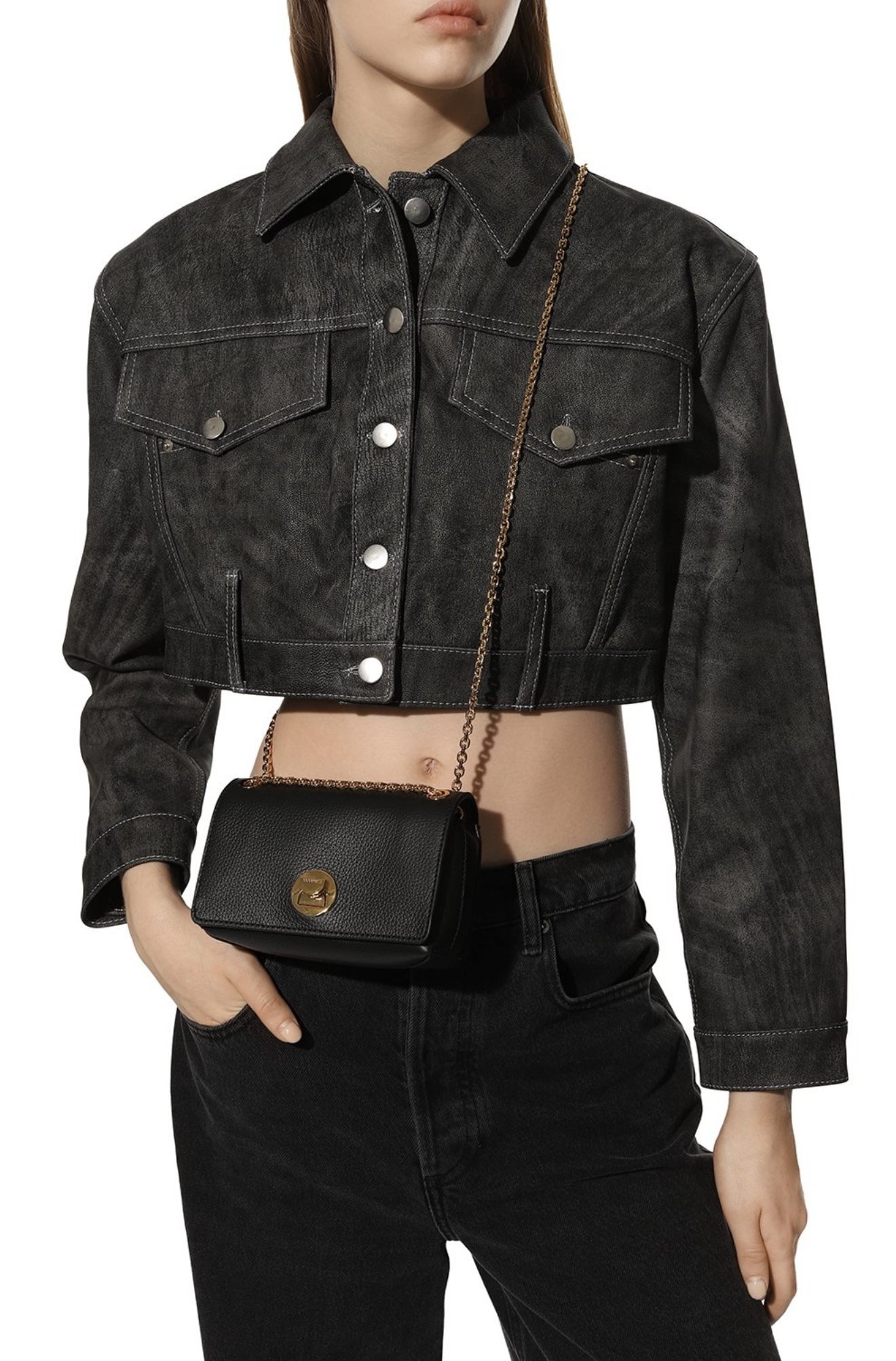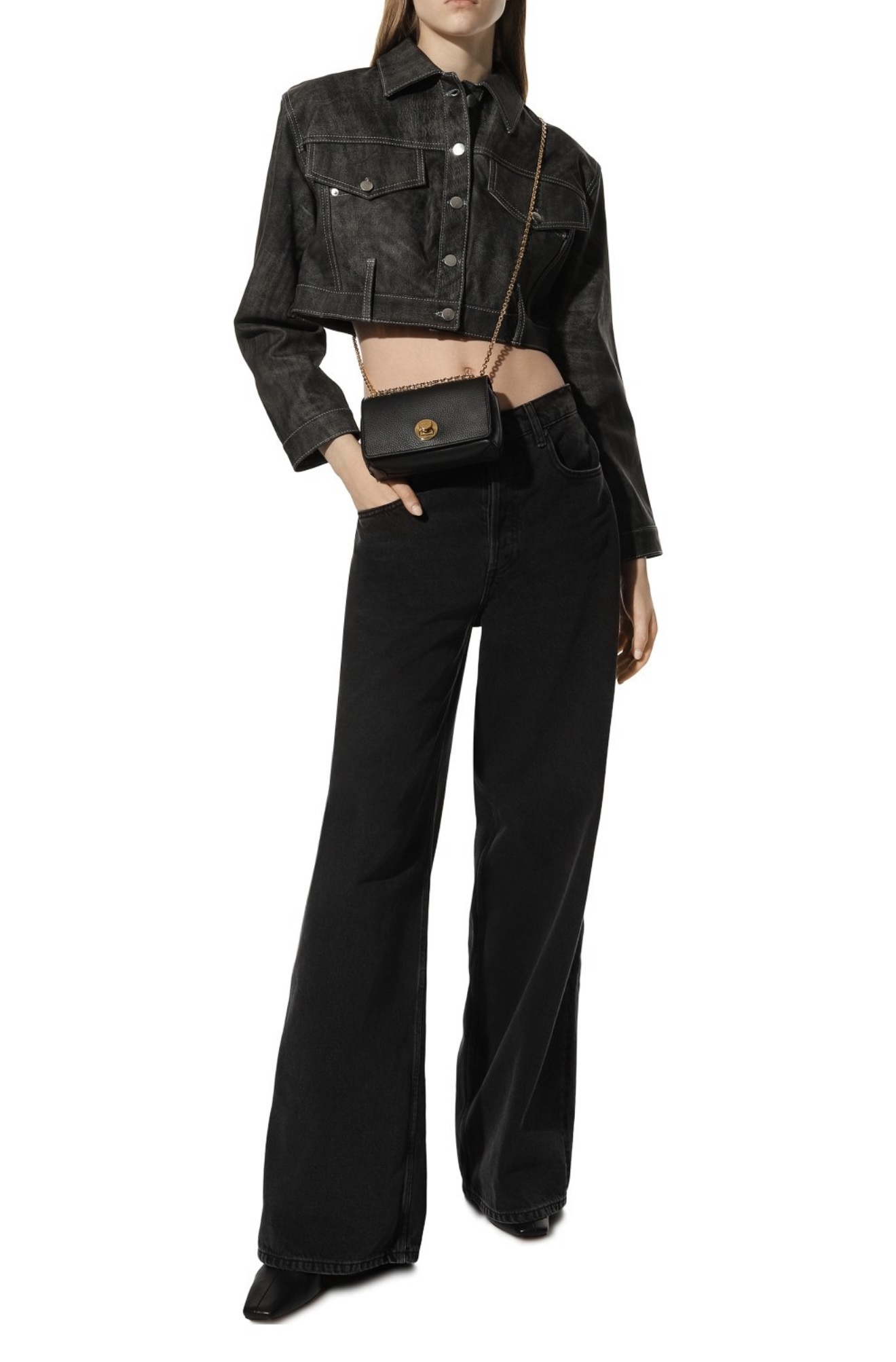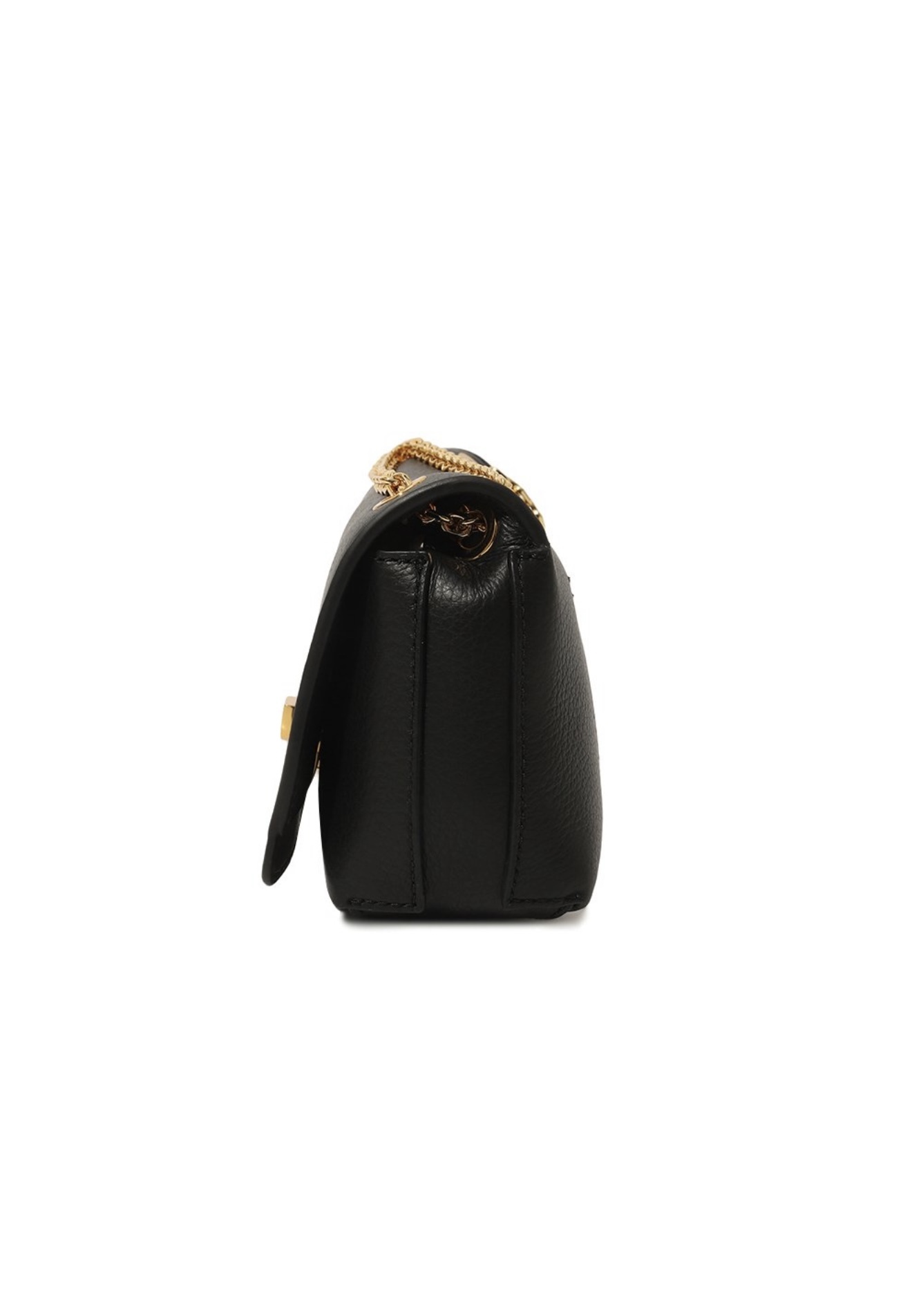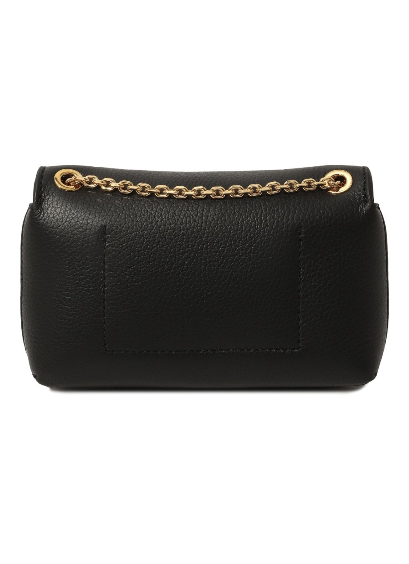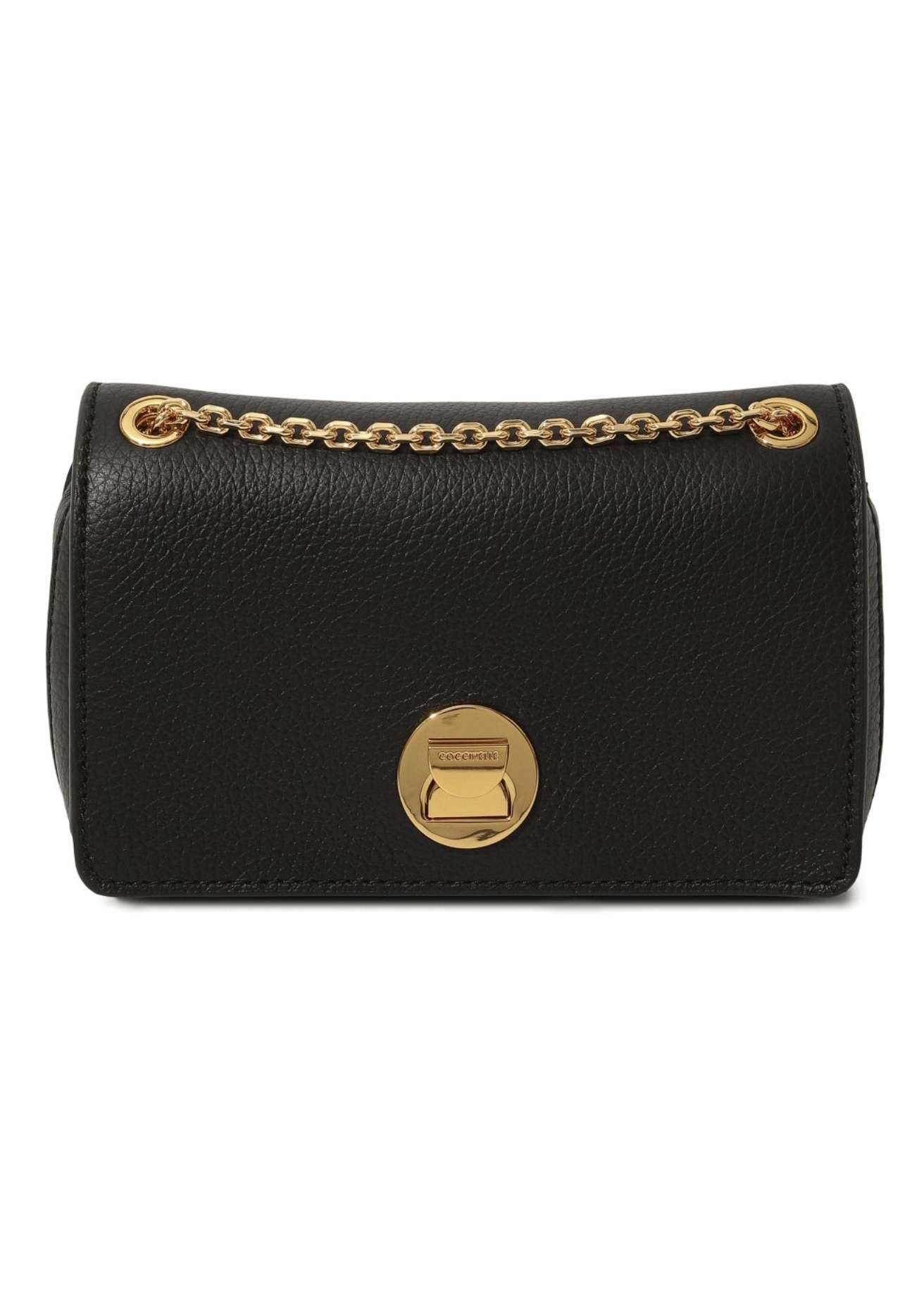 Небольшую черную сумку Liya прямоугольной формы сшили из крупнозернистой мягкой кожи, отполированной до матового блеска. Роль цветовых акцентов доверили золотистому плечевому ремню-цепочке и поворотному замку ему в тон. В аксессуар поместятся картхолдер, ключи и паспорт.