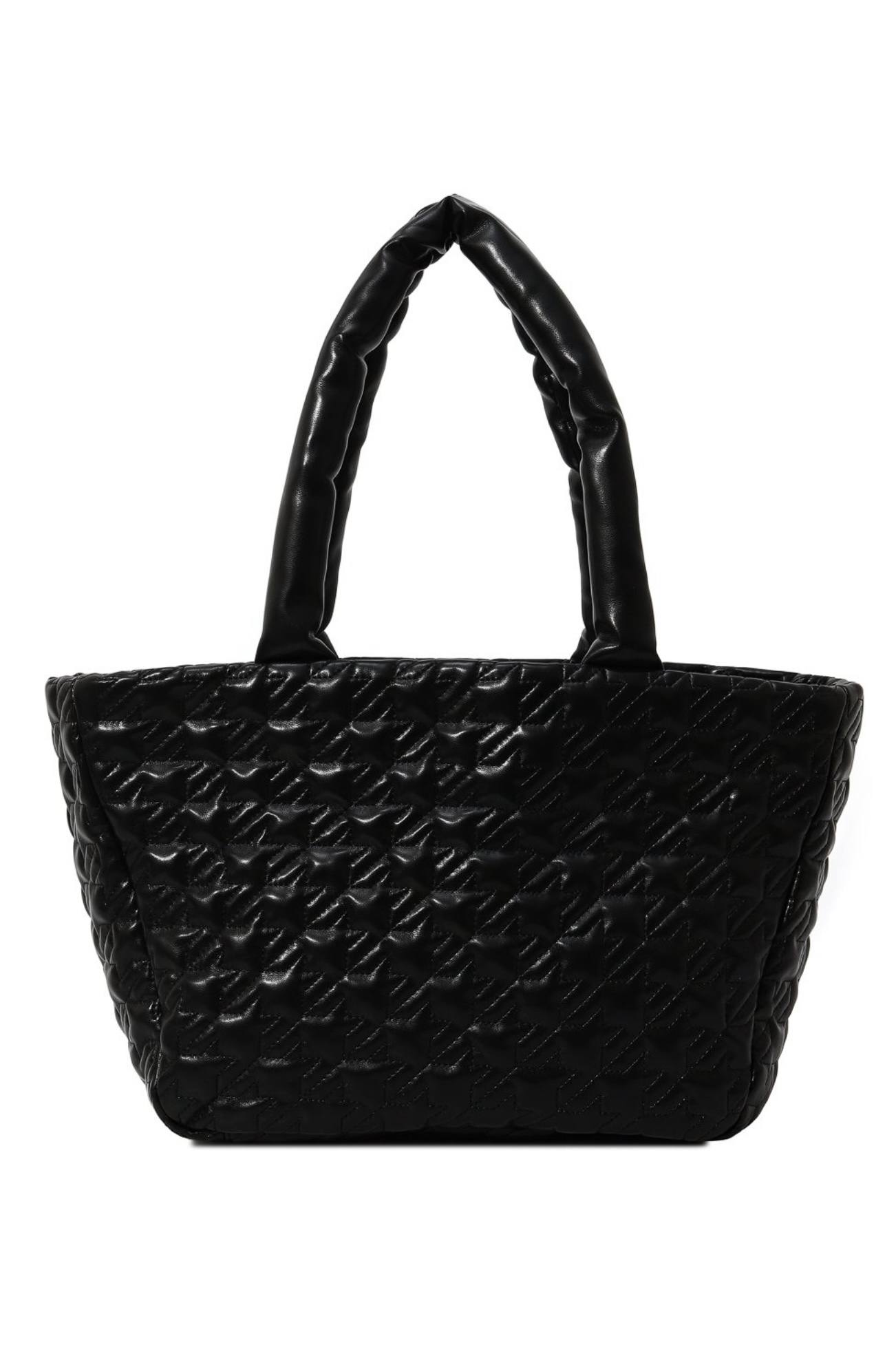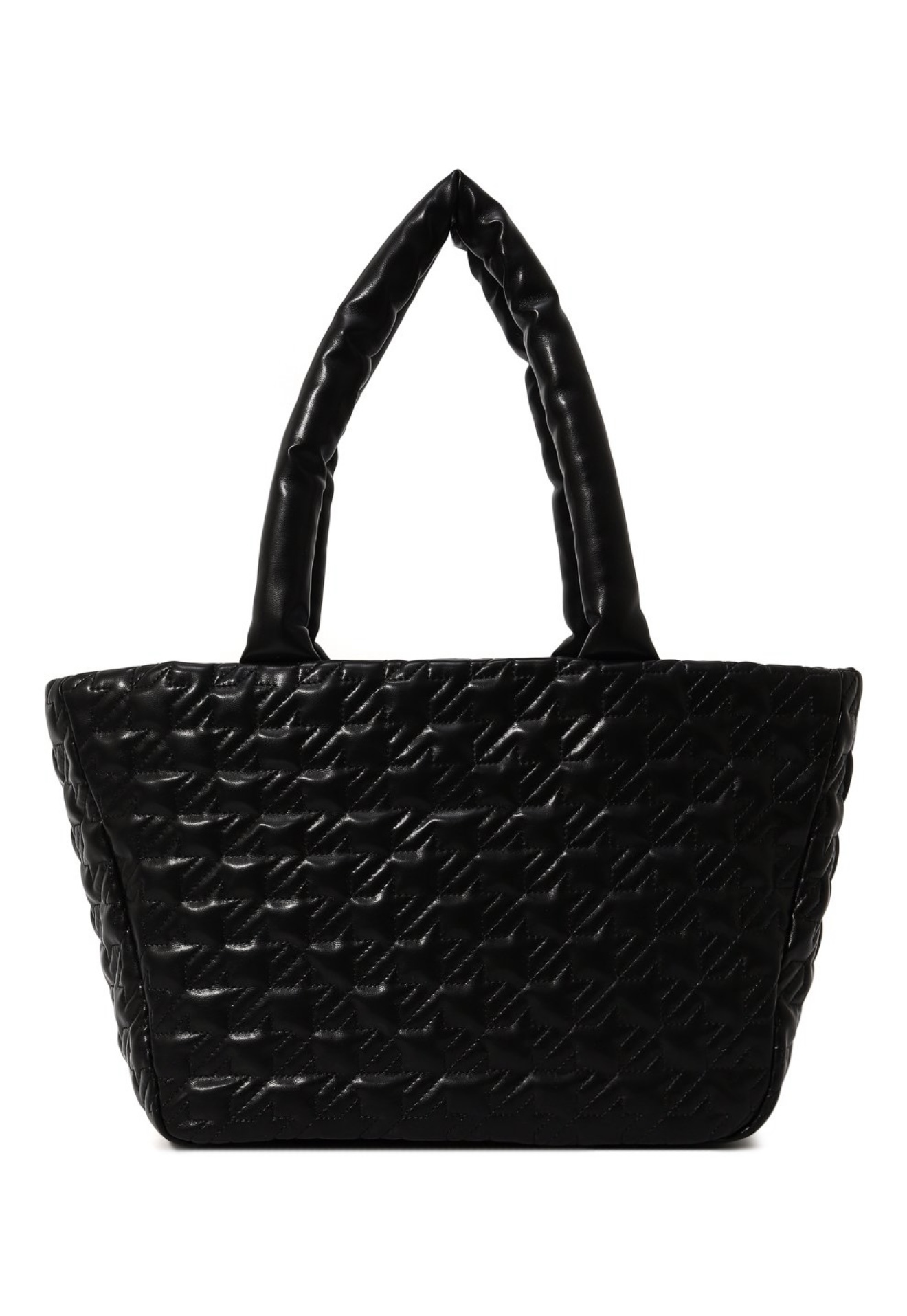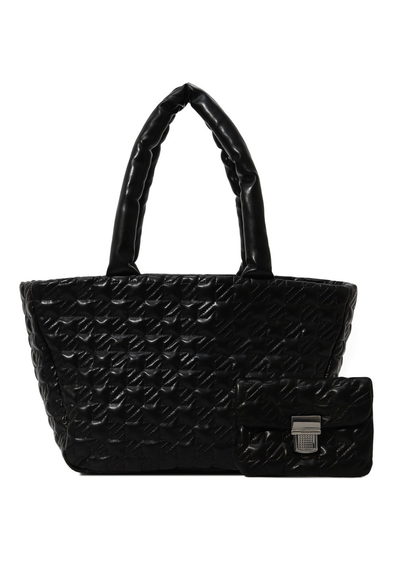 Черную сумку Clik со стеганым фактурным узором «гусиная лапка» выполнили из мягкого прочного полиуретана с деликатным блеском, напоминающего зернистую кожу. Модель с длинными ручками дополнили отстегивающейся косметичкой из такого же материала. В аксессуар поместятся бумаги формата А4, кошелек и смартфон.