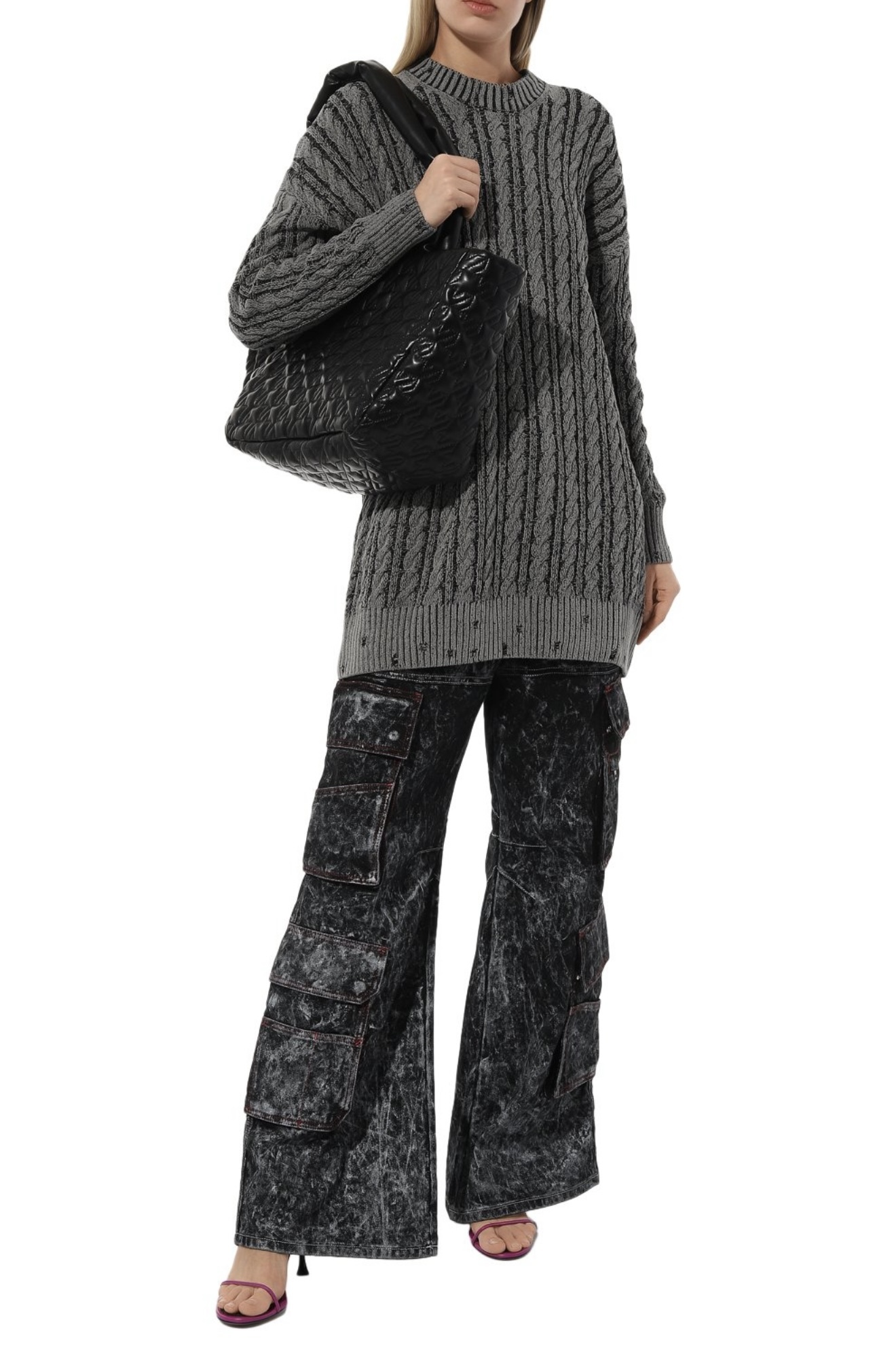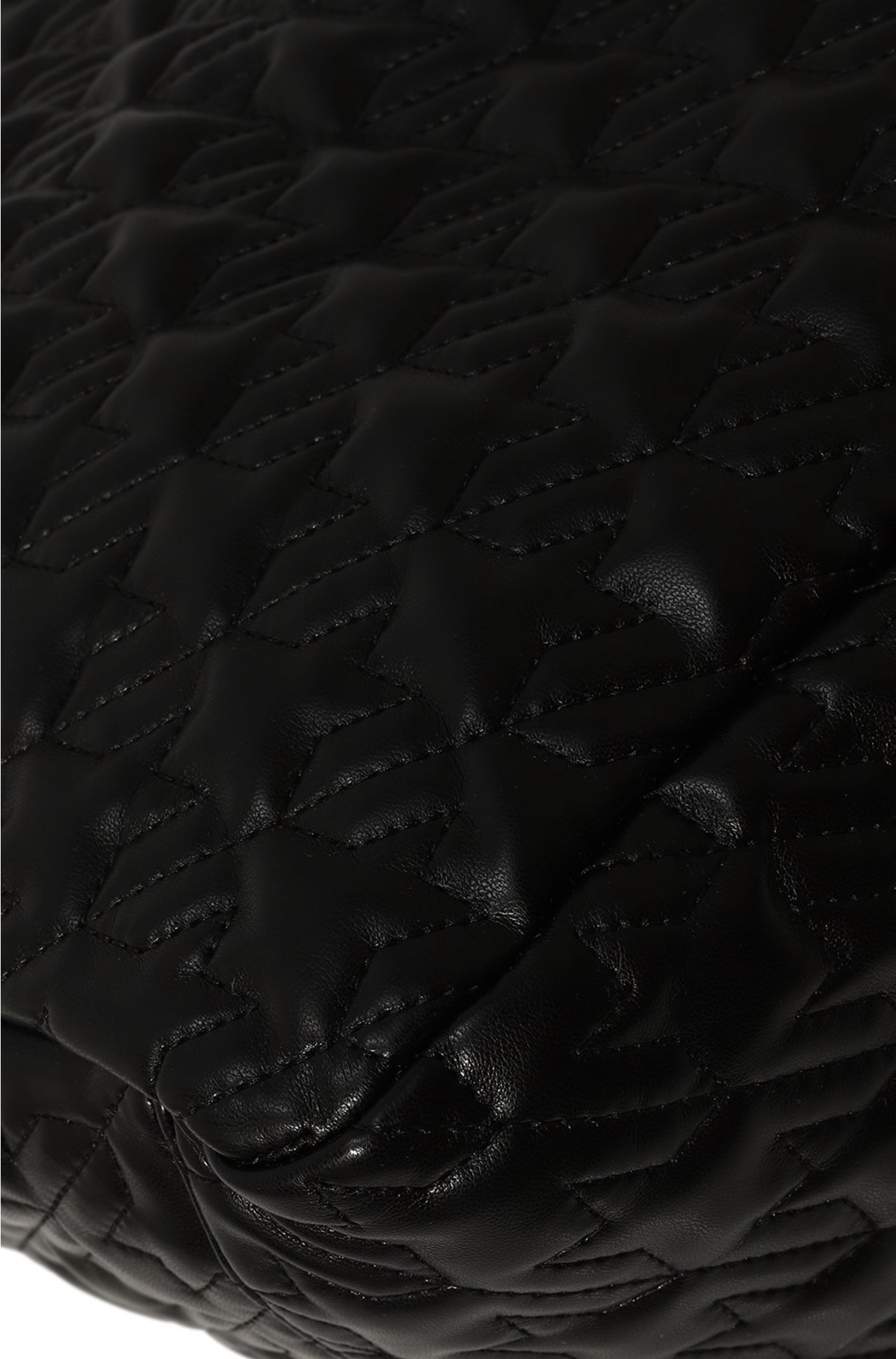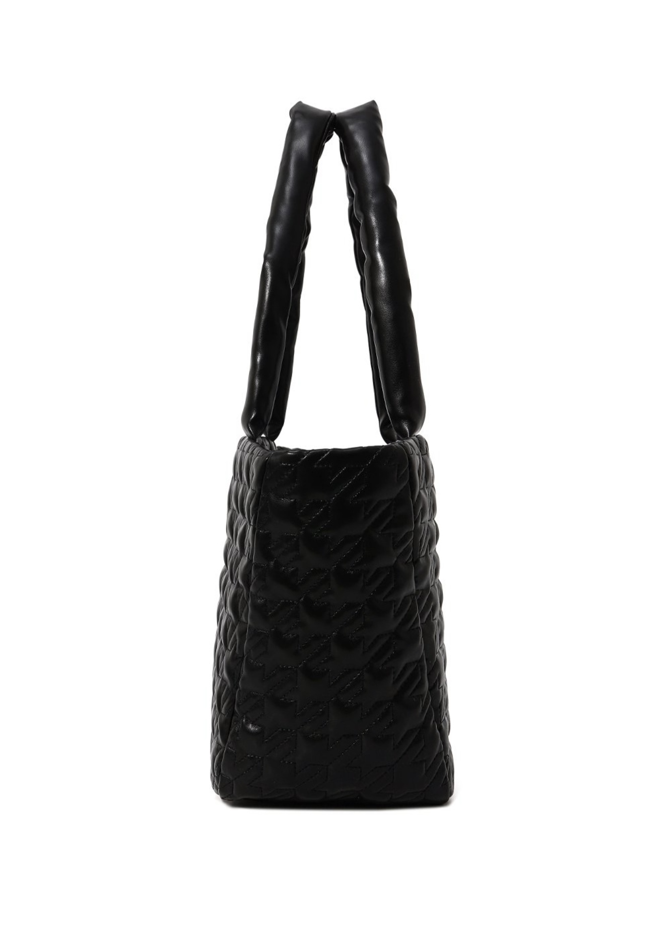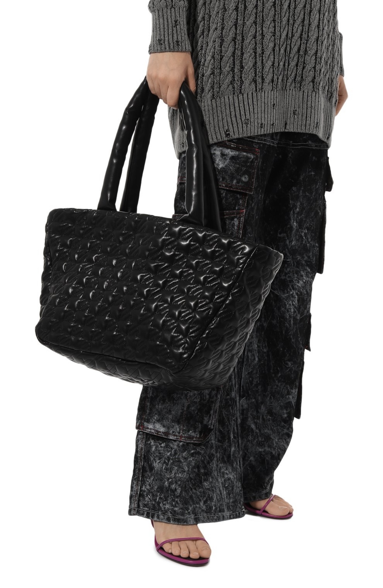 Черную сумку Clik со стеганым фактурным узором «гусиная лапка» выполнили из мягкого прочного полиуретана с деликатным блеском, напоминающего зернистую кожу. Модель с длинными ручками дополнили отстегивающейся косметичкой из такого же материала. В аксессуар поместятся бумаги формата А4, кошелек и смартфон.