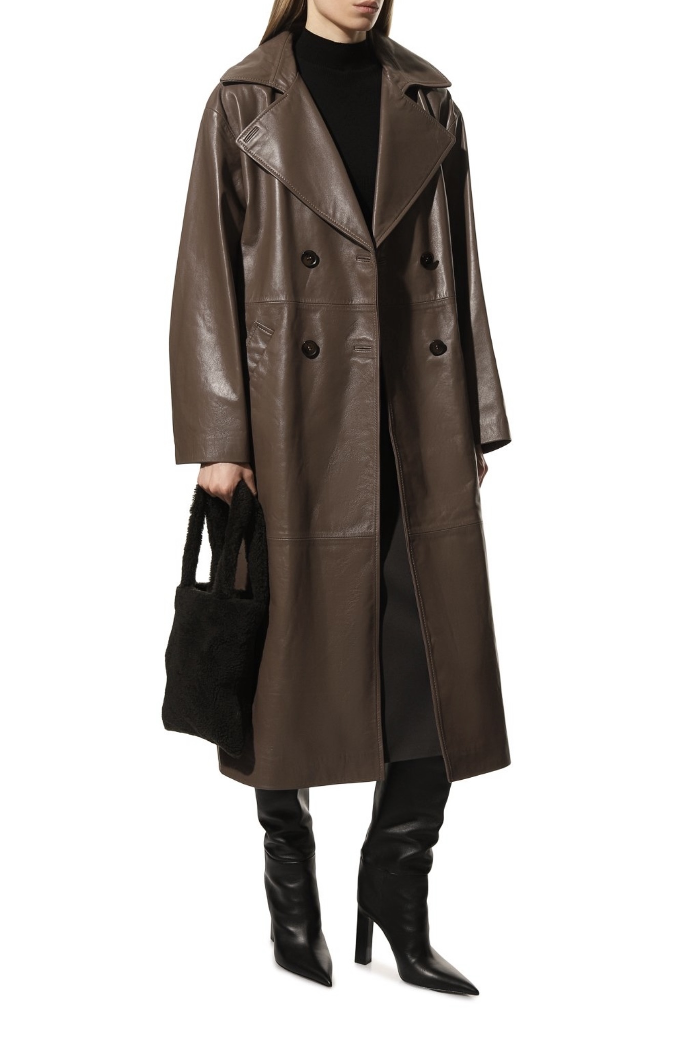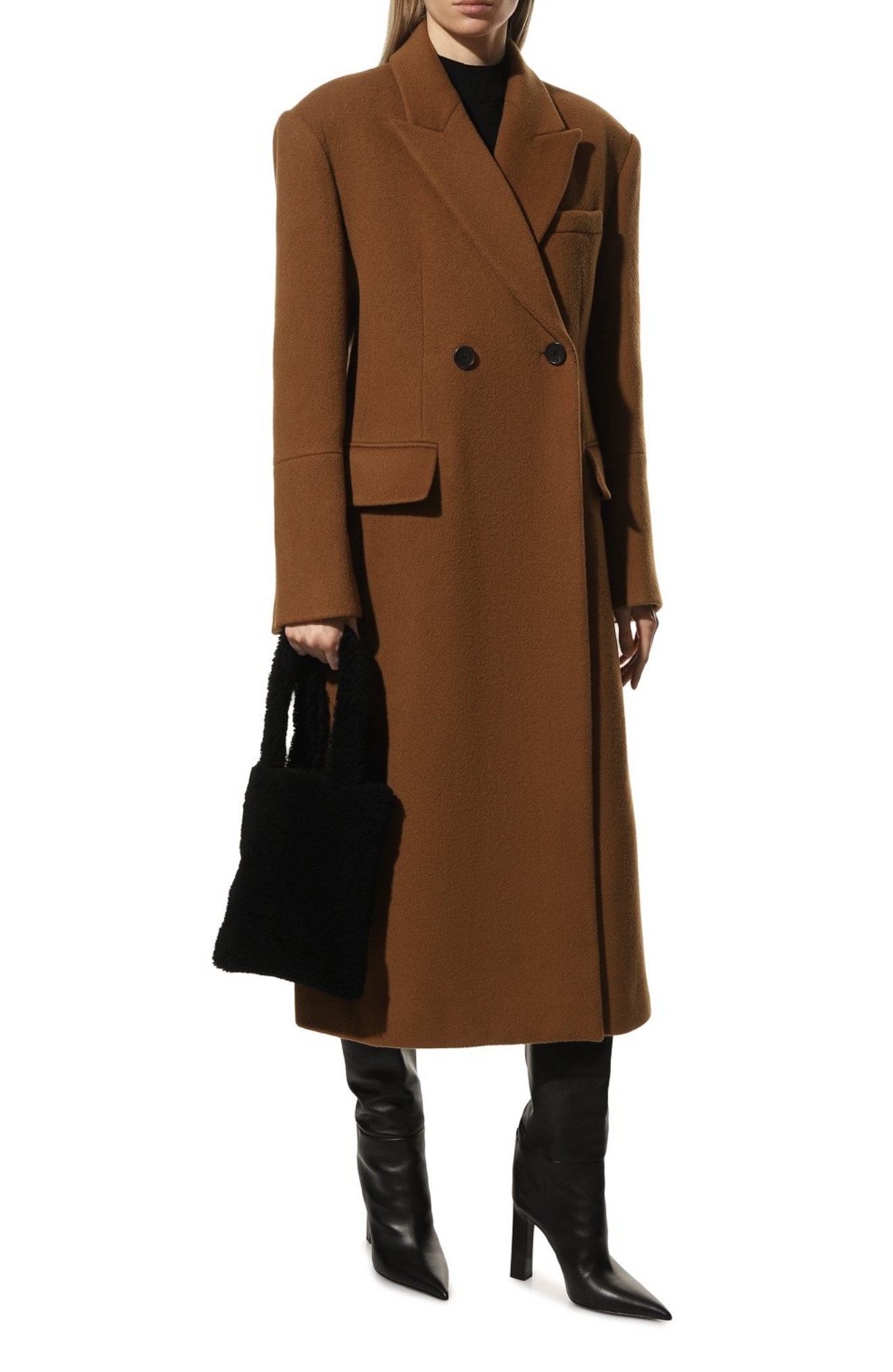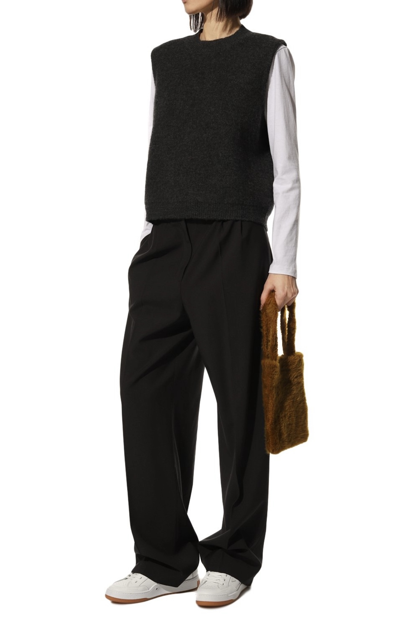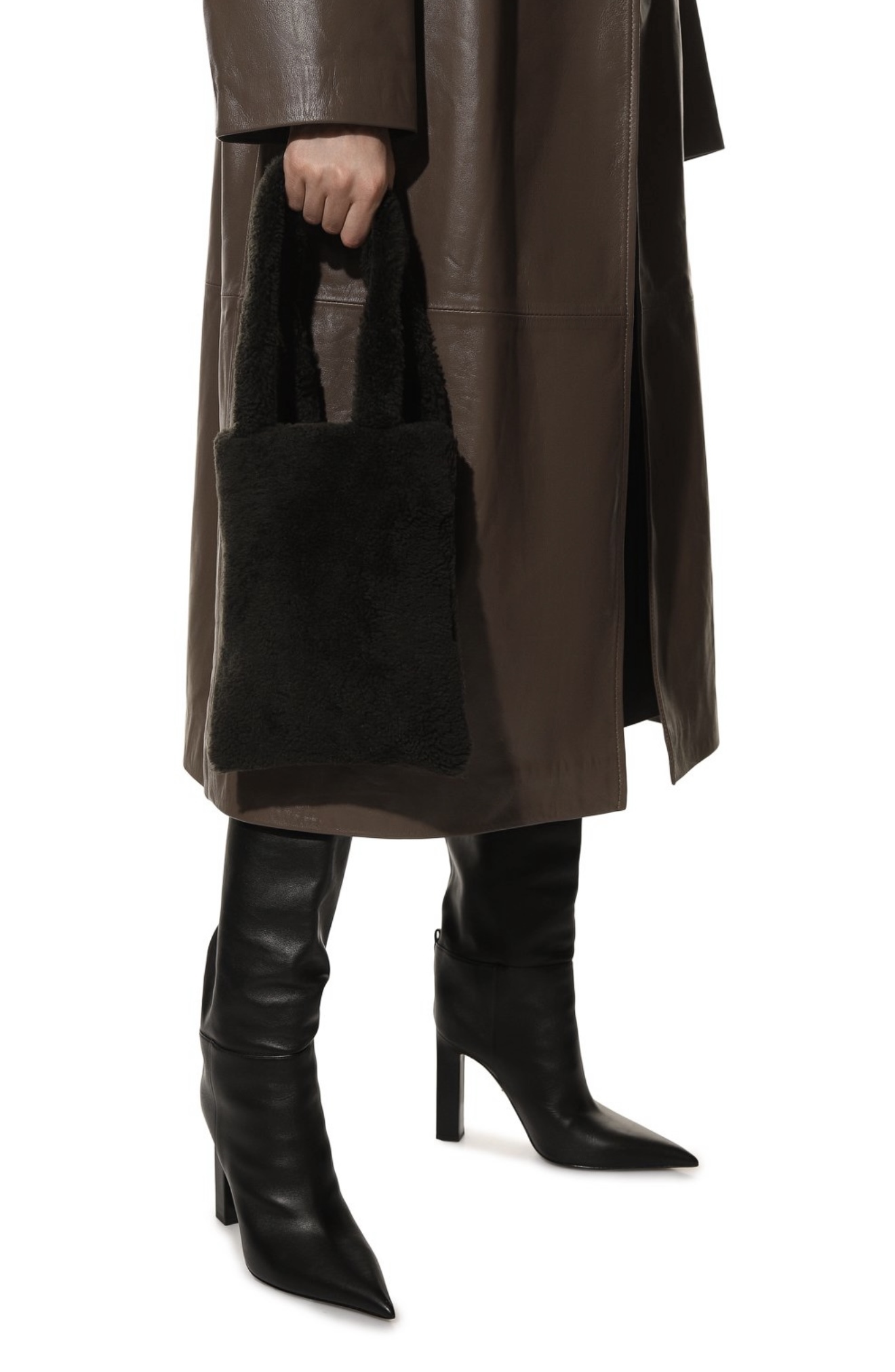 При создании небольшой черной сумки дизайнеры марки отказались от любых цветовых акцентов и сфокусировали внимание на материале. Для изготовления модели с короткими ручками они выбрали густую овчину с длинным ворсом. Внутрь поместятся ежедневник формата А4 и смартфон.