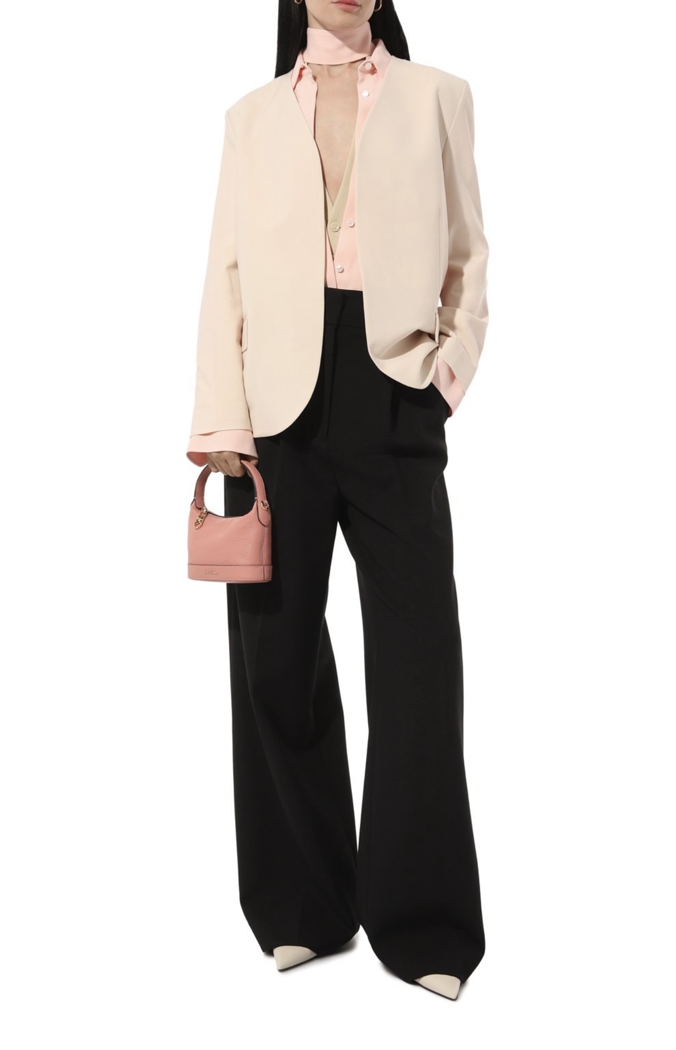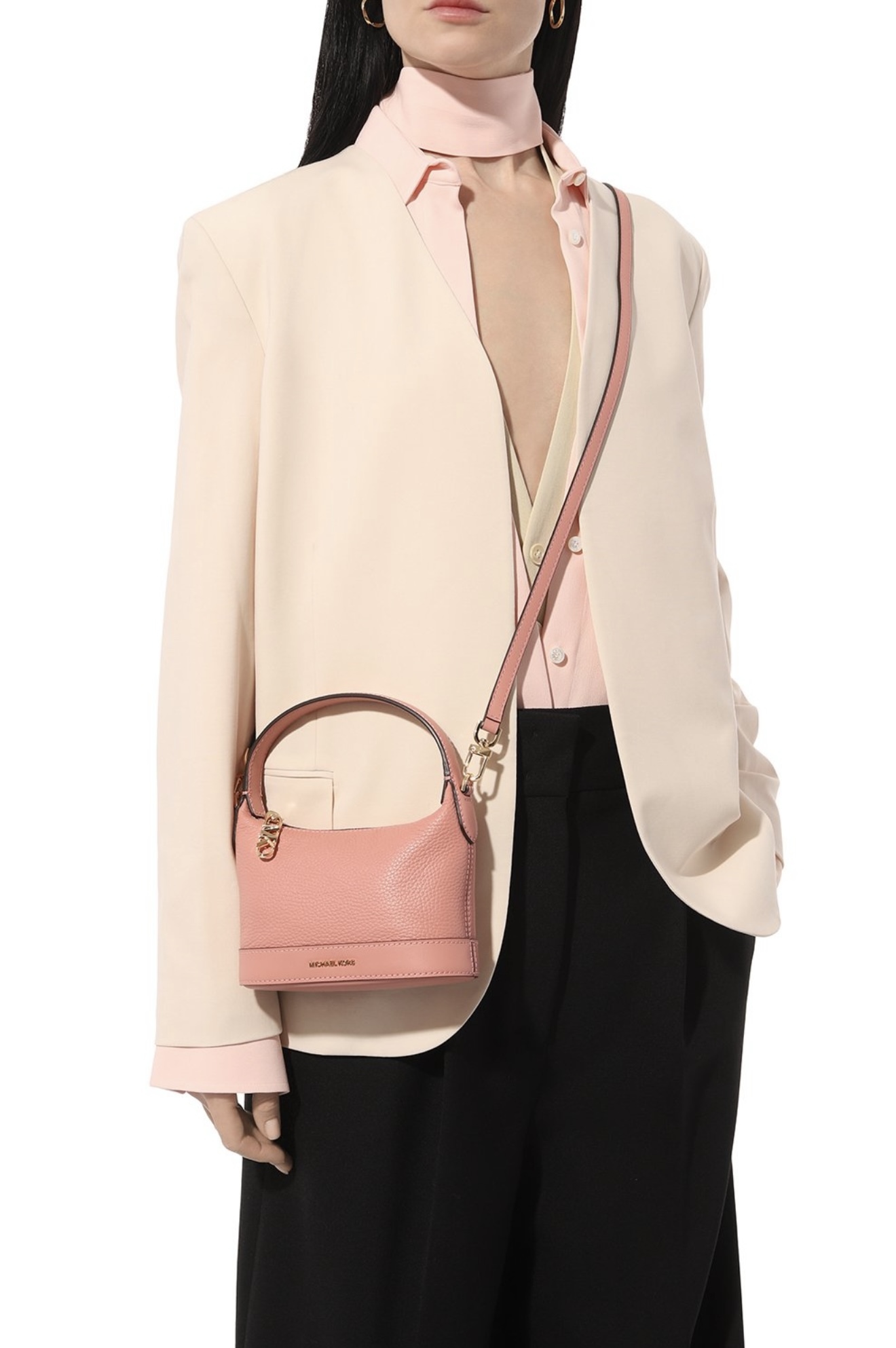 Для создания миниатюрной розовой сумки Wythe мастера марки, основанной Майклом Корсом, использовали мягкую, но при этом прочную зернистую кожу с легким блеском. Во внутреннее отделение с открытым карманом можно положить картхолдер, телефон и ключи. Узкий регулируемый ремень, вошедший в комплект, позволяет носить аксессуар на плече или кросс-боди.