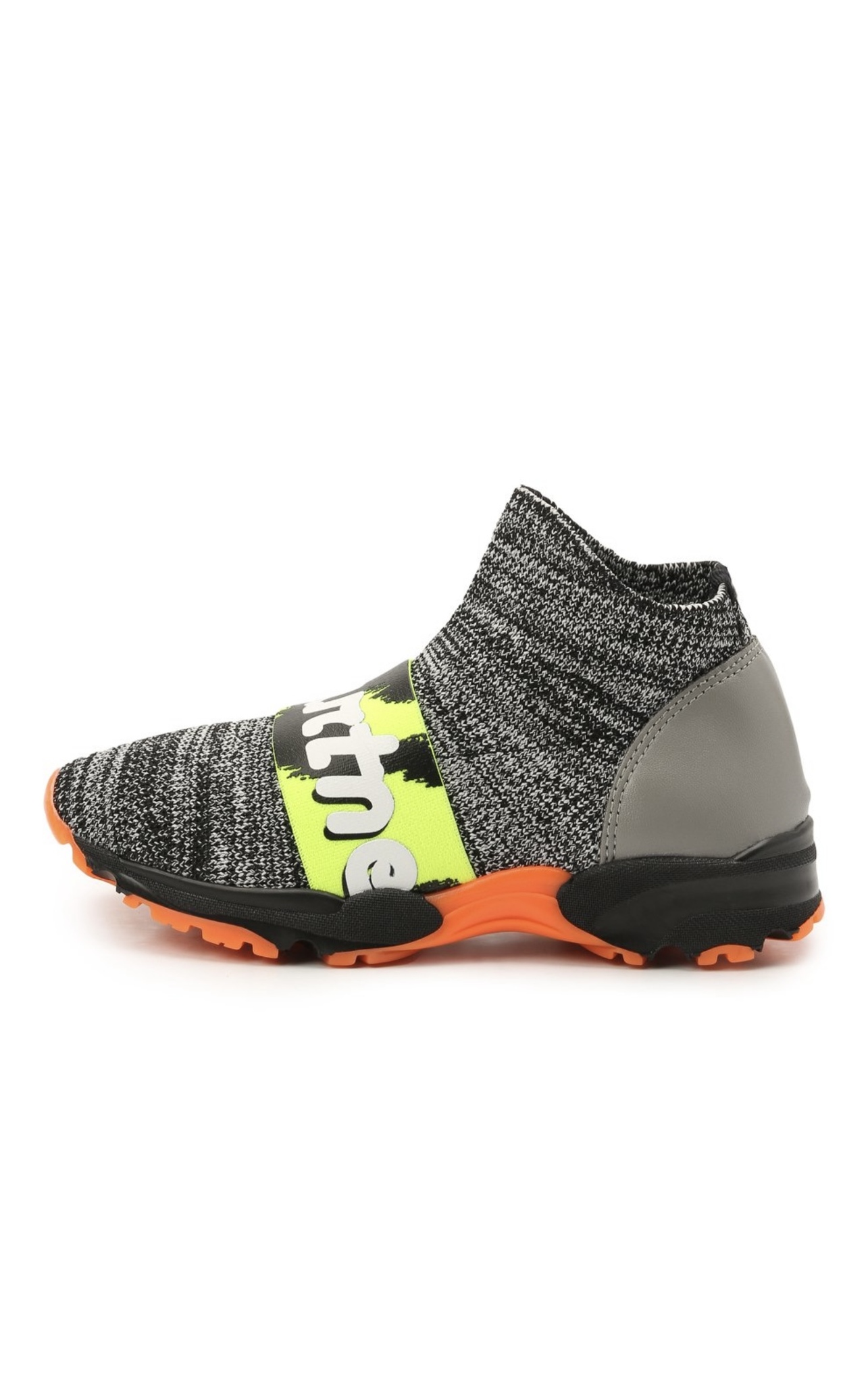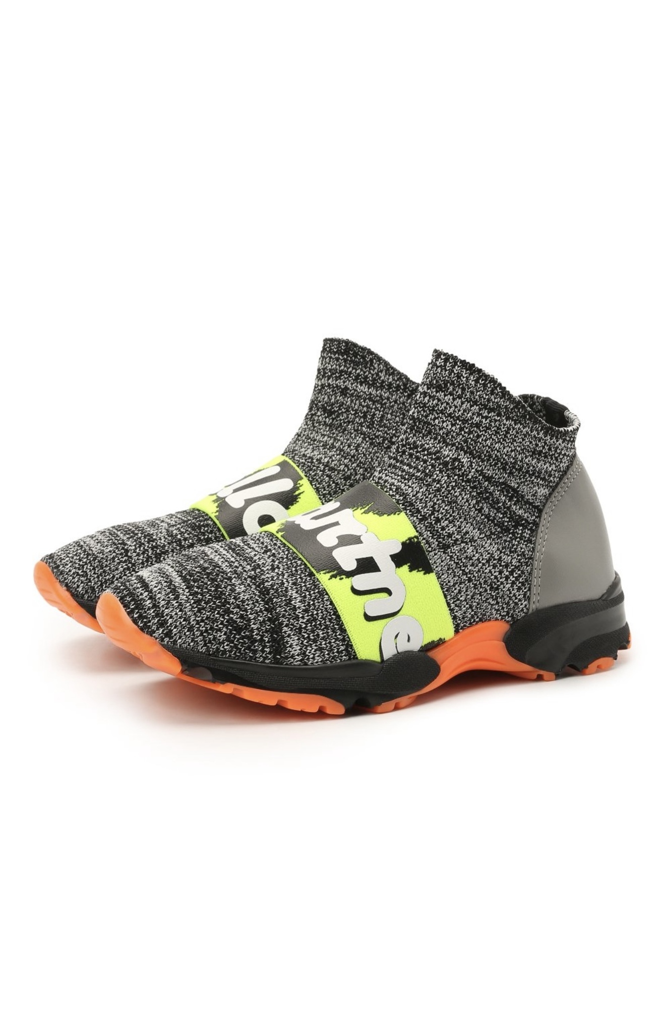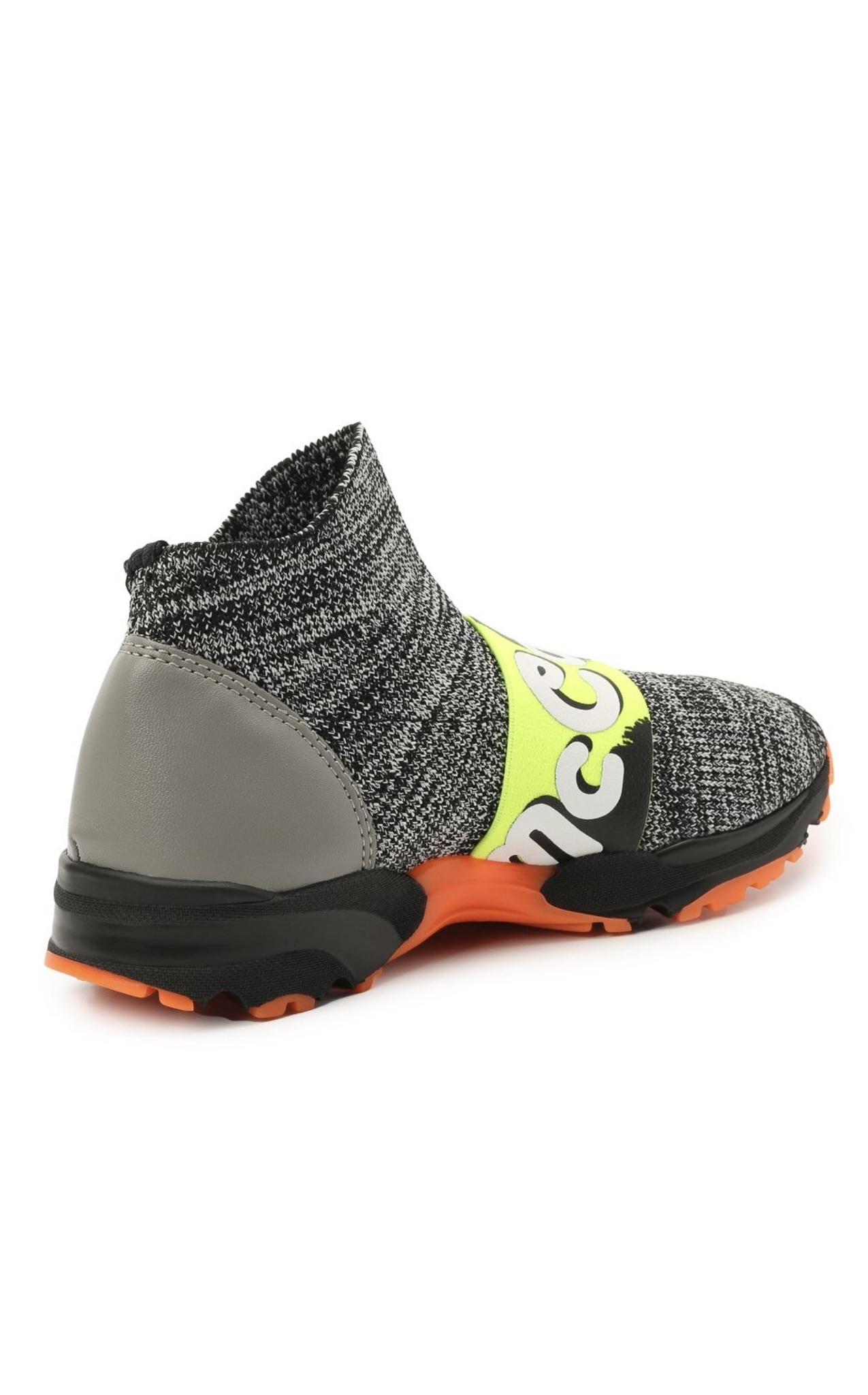 Для изготовления серых кроссовок мастера марки использовали прочный мягкий текстиль, который хорошо тянется, облегая ногу как носок. Задник укрепили вставкой из материала, напоминающего по фактуре матовую кожу. Каждую полупару на подъеме дополнили широкой перемычкой с принтом, складывающимся в логотип бренда.