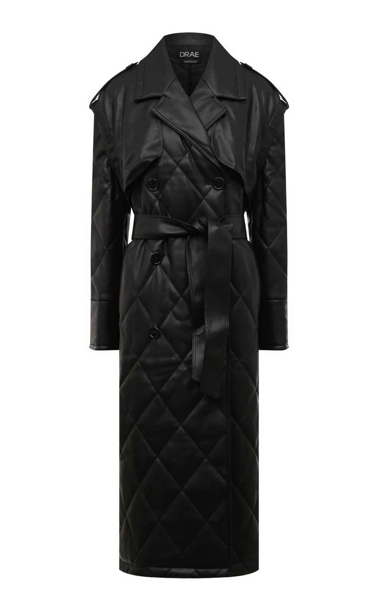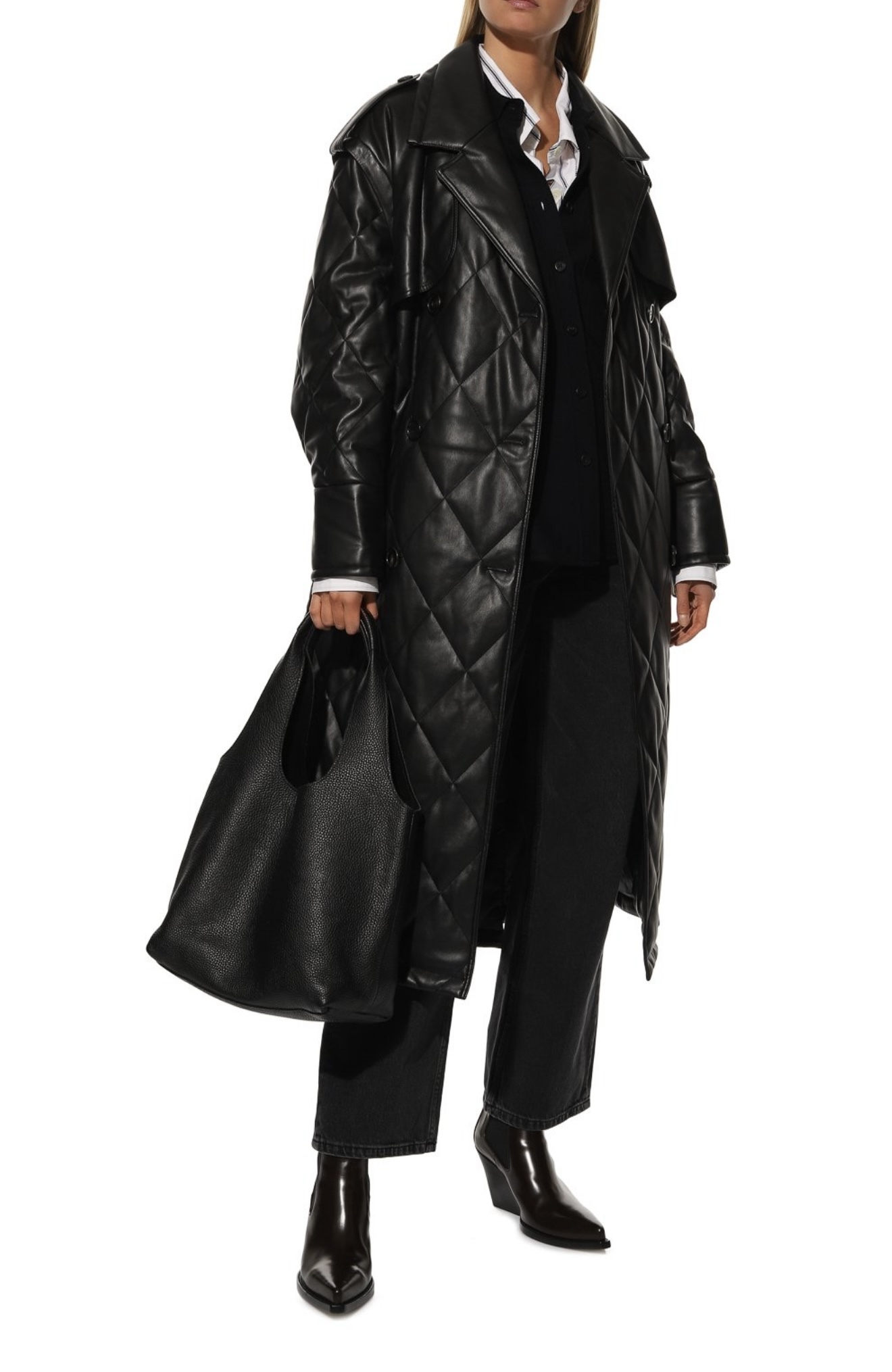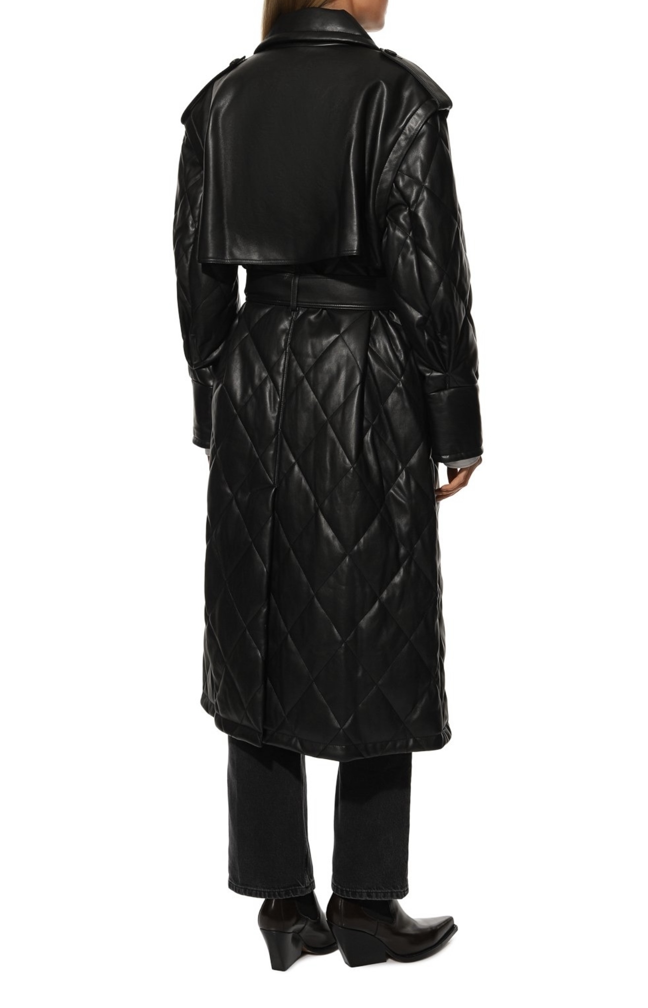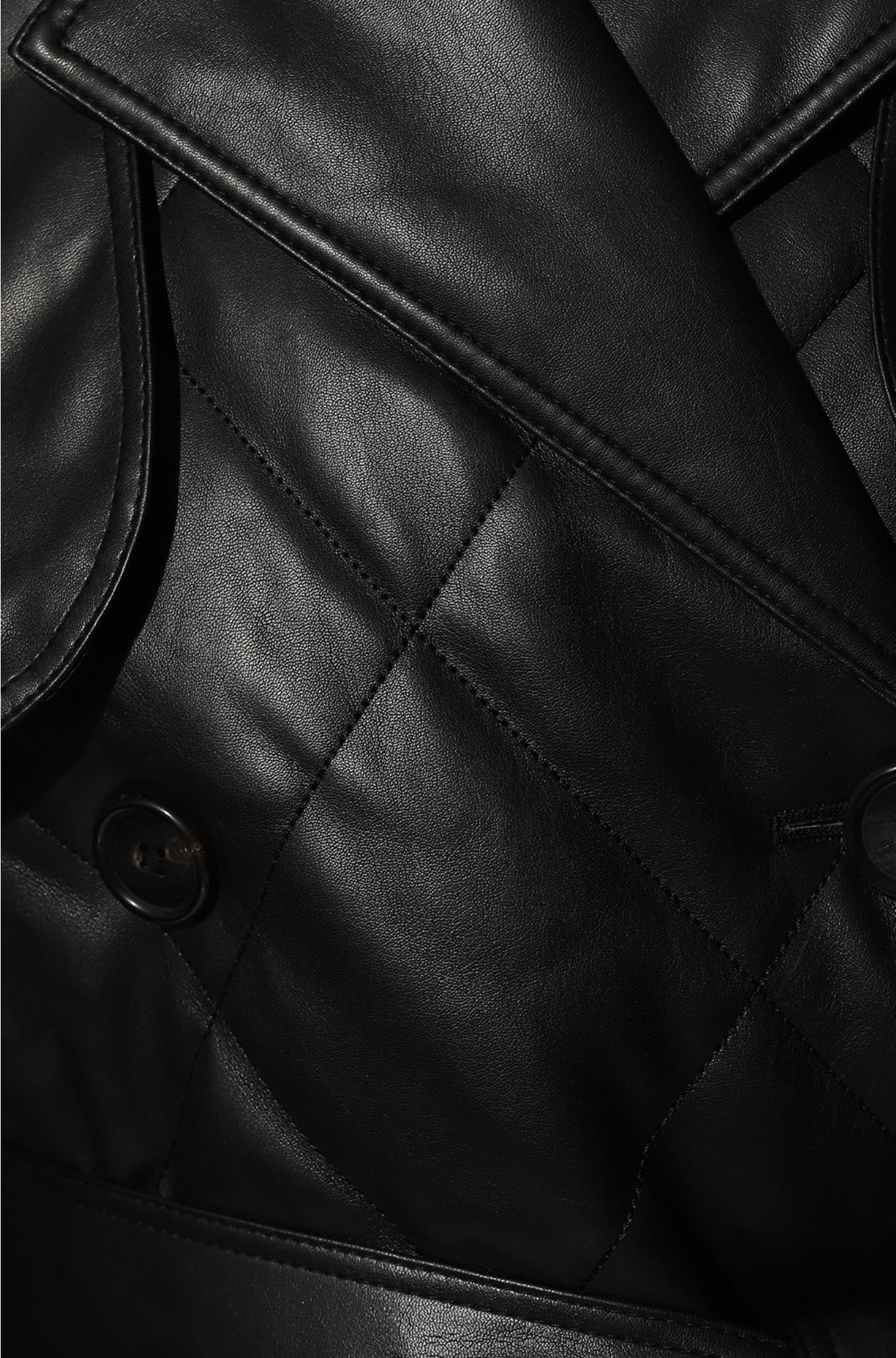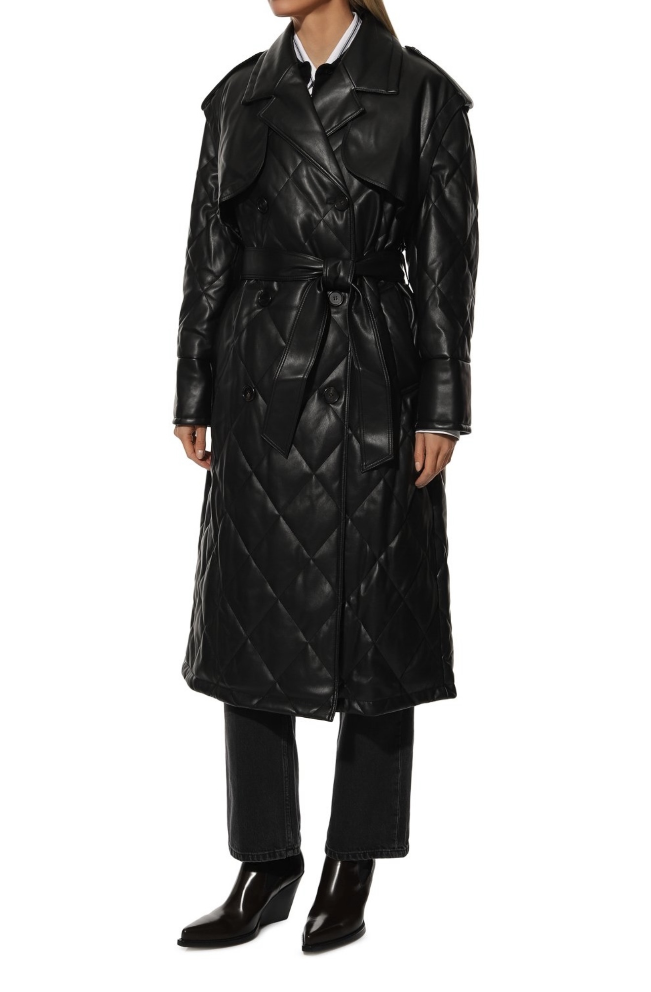 Дизайнеры бренда представили премиальную версию тренча универсального черного цвета. Модель с кокеткой, длинным поясом и широкими лацканами сшили из тонкого прочного полиуретана, который напоминает мягкую кожу. Такой полимер легче натурального материала, но не уступает ему в прочности. Легкий блеск напыления подчеркивает геометричный стеганый узор.