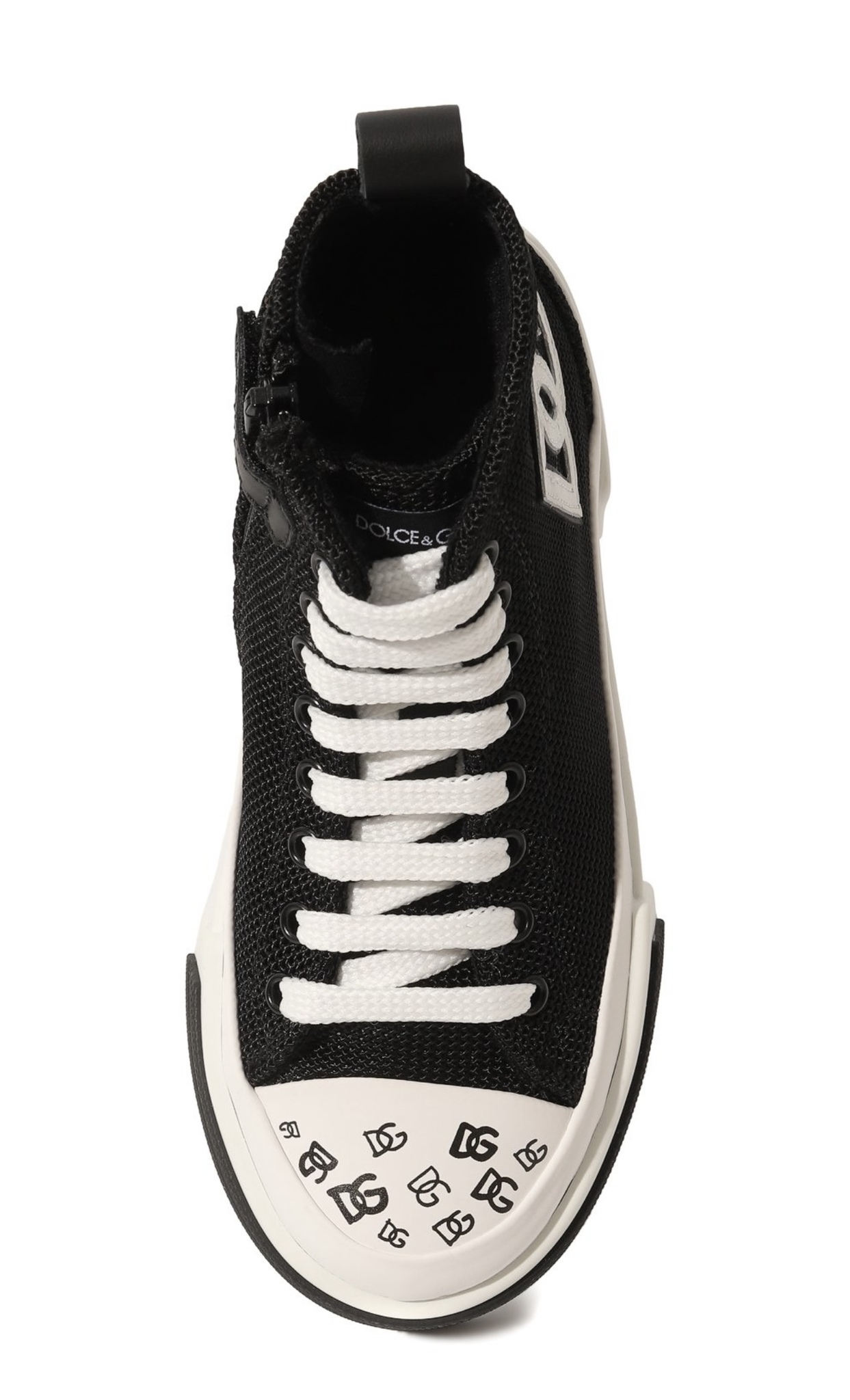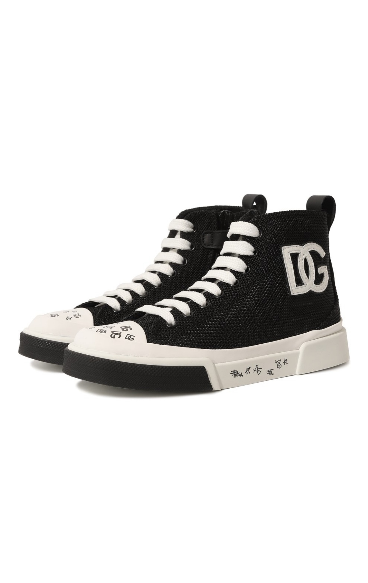 Высокие черные кеды сшиты из прочного сетчатого текстиля, который отлично держит форму и пропускает воздух. Посадка по ноге регулируется шнуровкой, а сама обувь застегивается сбоку молнией. Модель с рисунками на гибкой подошве украшена крупной белой монограммой DG.