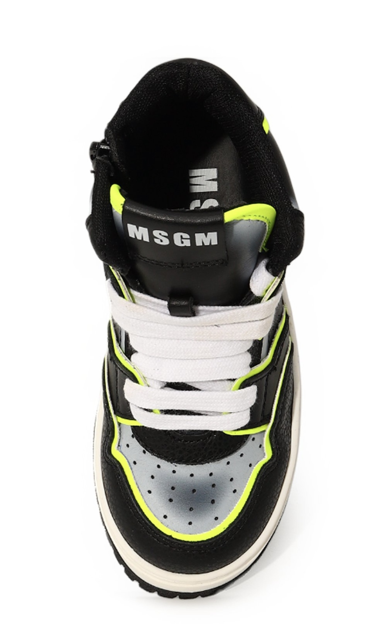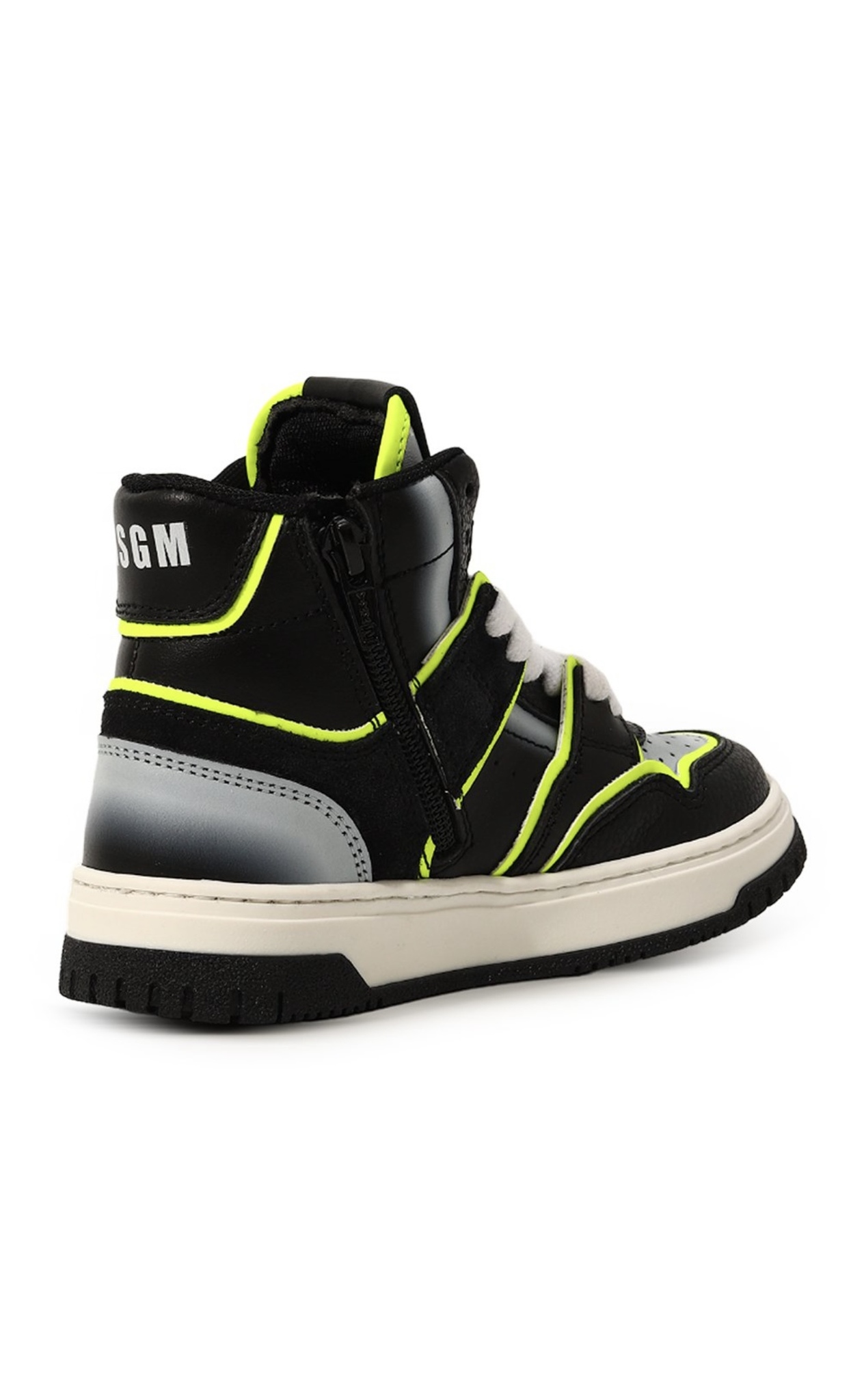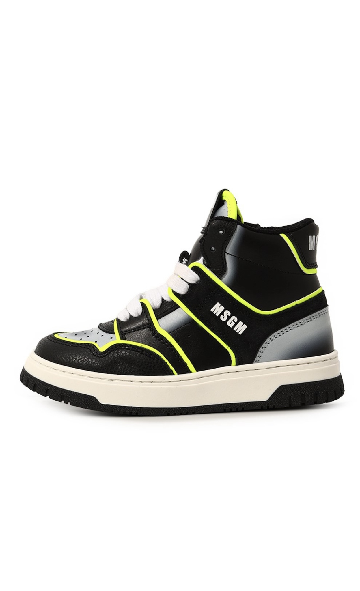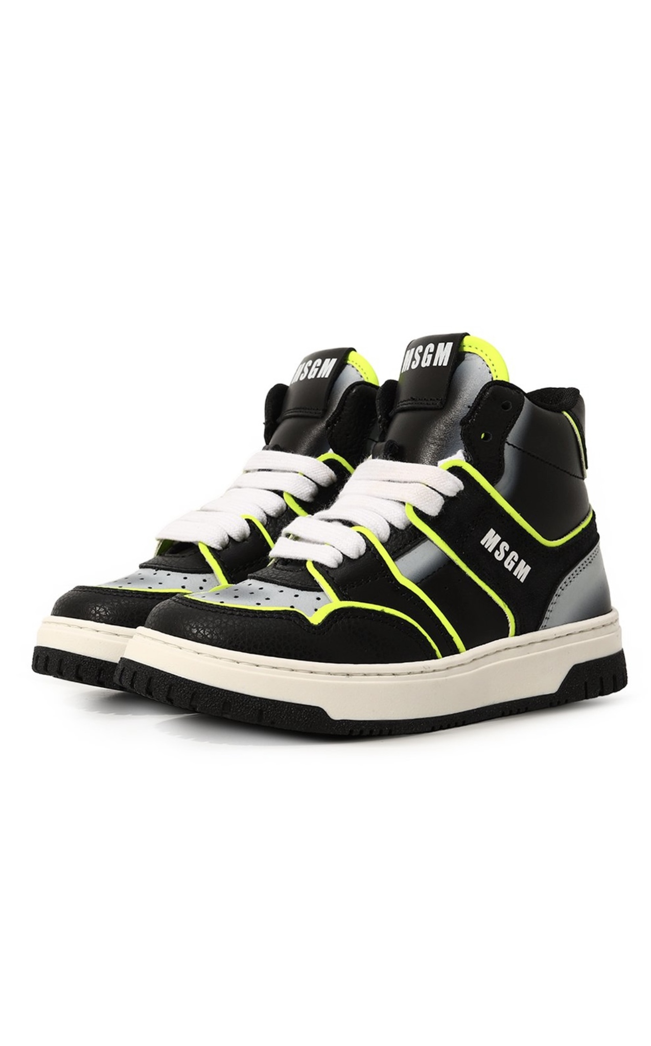 Высокие кеды с крупными контрастными логотипами марки на боковых панелях, язычках и задниках сшили из комбинации зернистой и гладкой кожи. Детали выделили ярким кантом неоново-желтого цвета, а на серебристо-серых вставках из прочного полиуретана создали подобие патины. Перфорация на союзке обеспечивает циркуляцию воздуха, а усиленное голенище надежно поддерживает голеностоп. Чтобы обувь было удобнее надевать и снимать, модель на шнуровке дополнили боковой молнией.