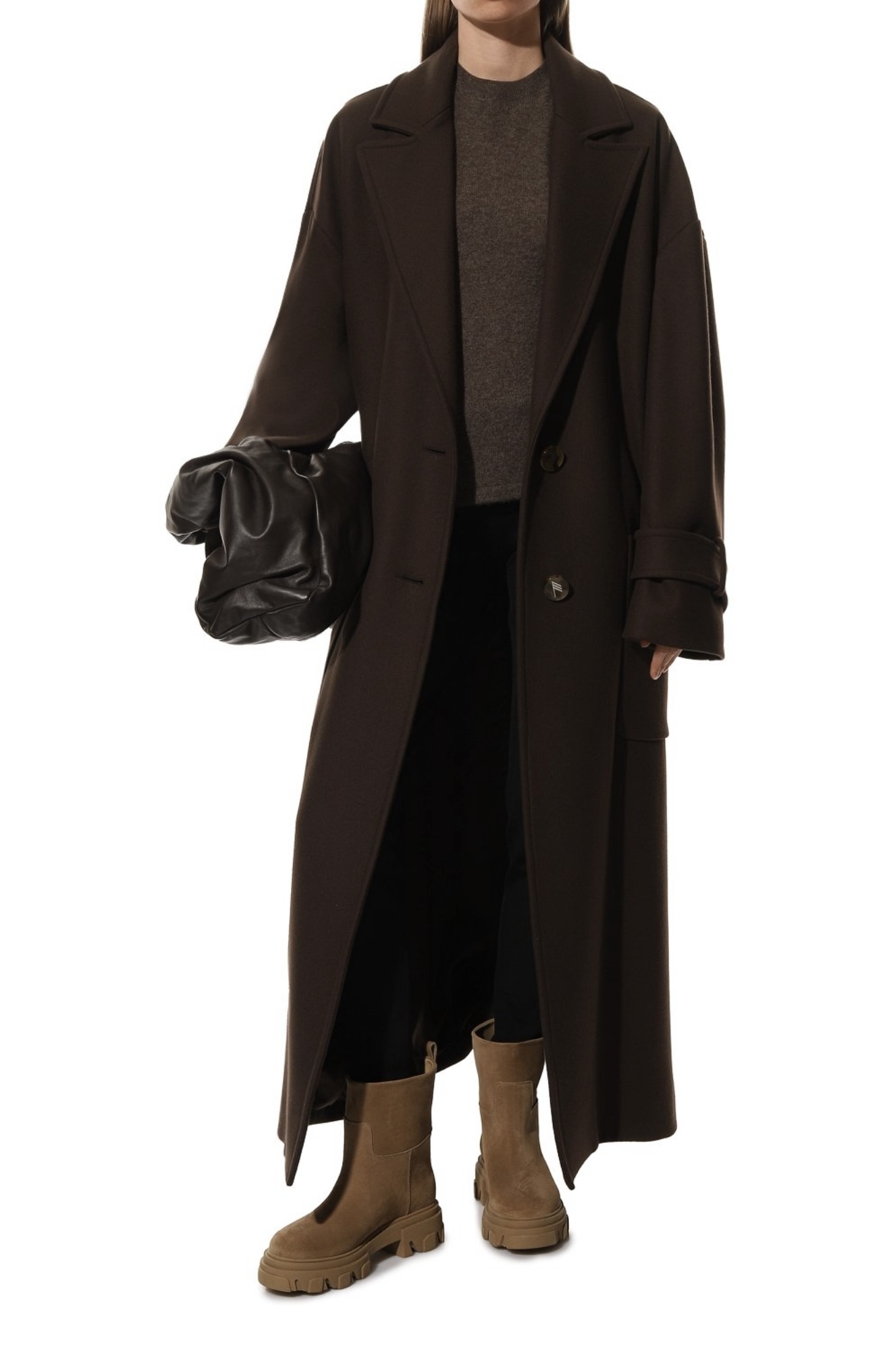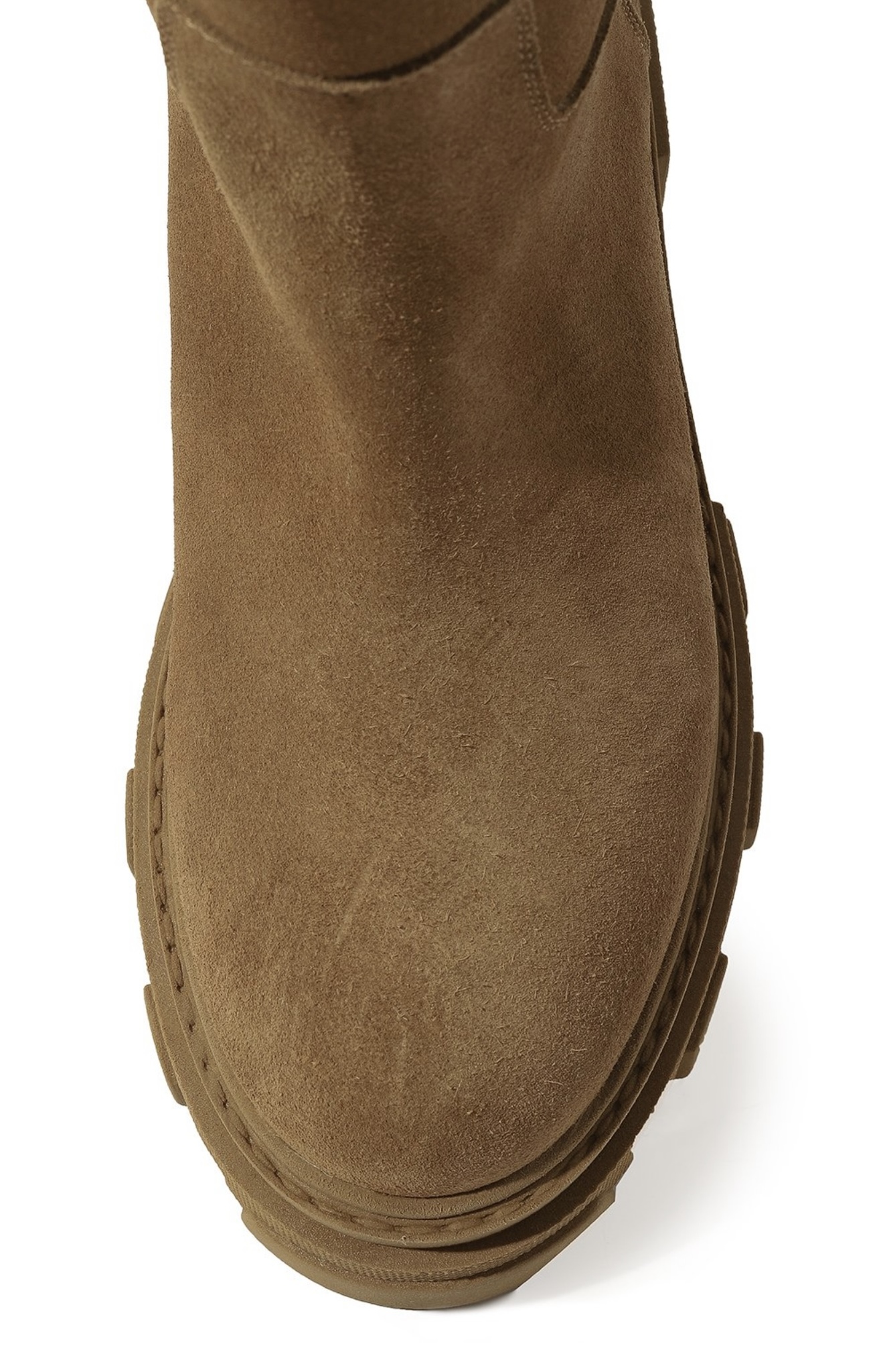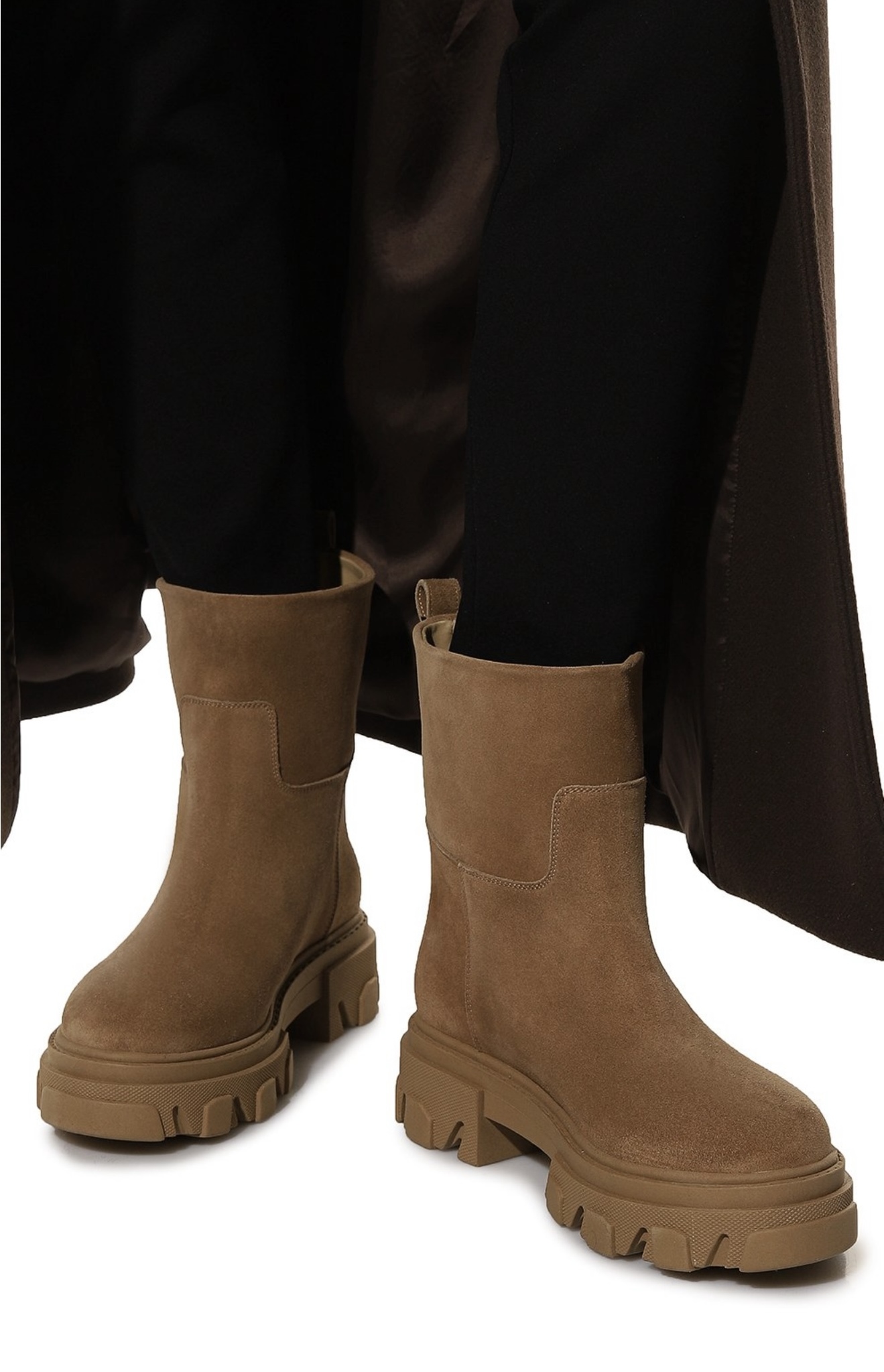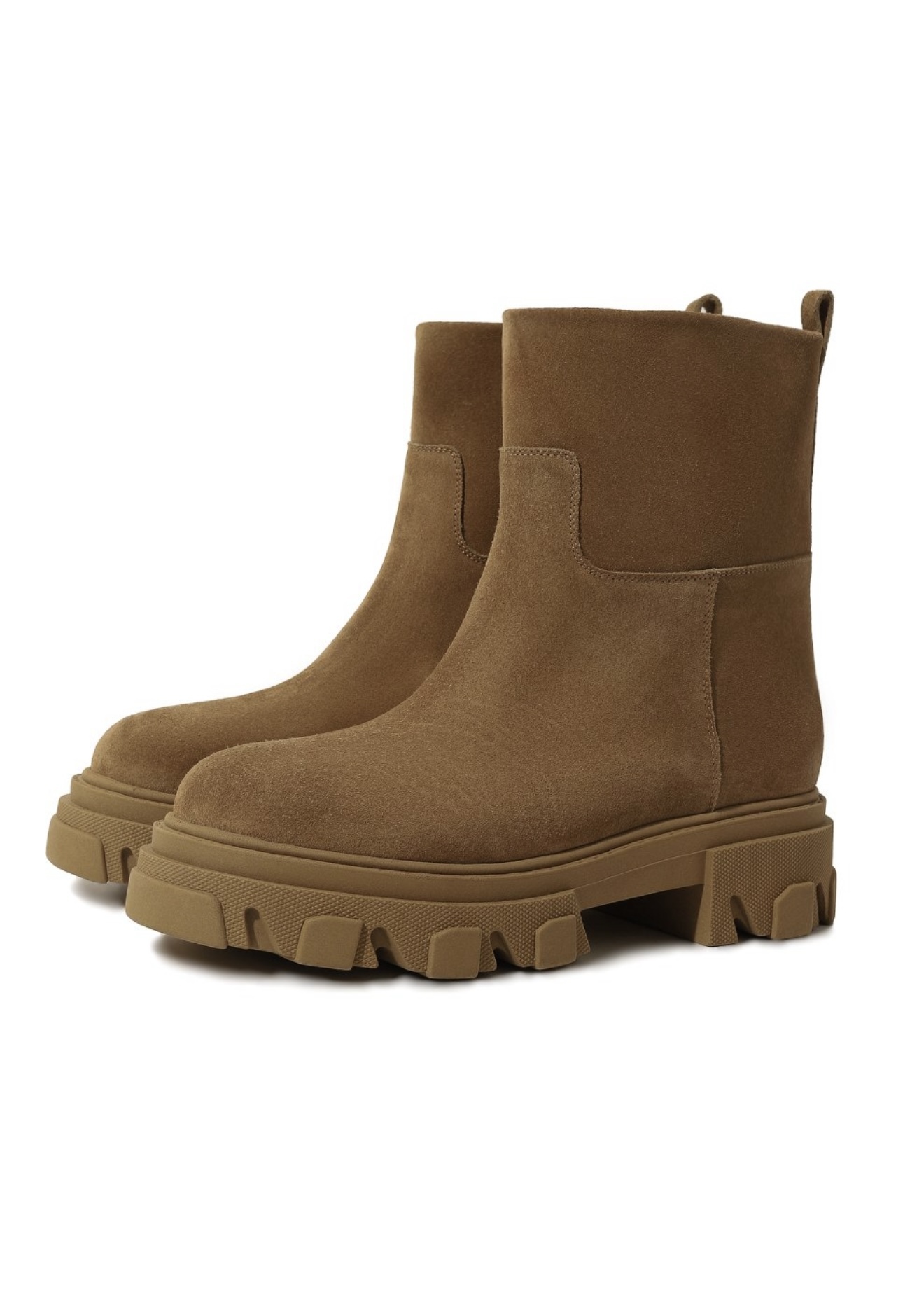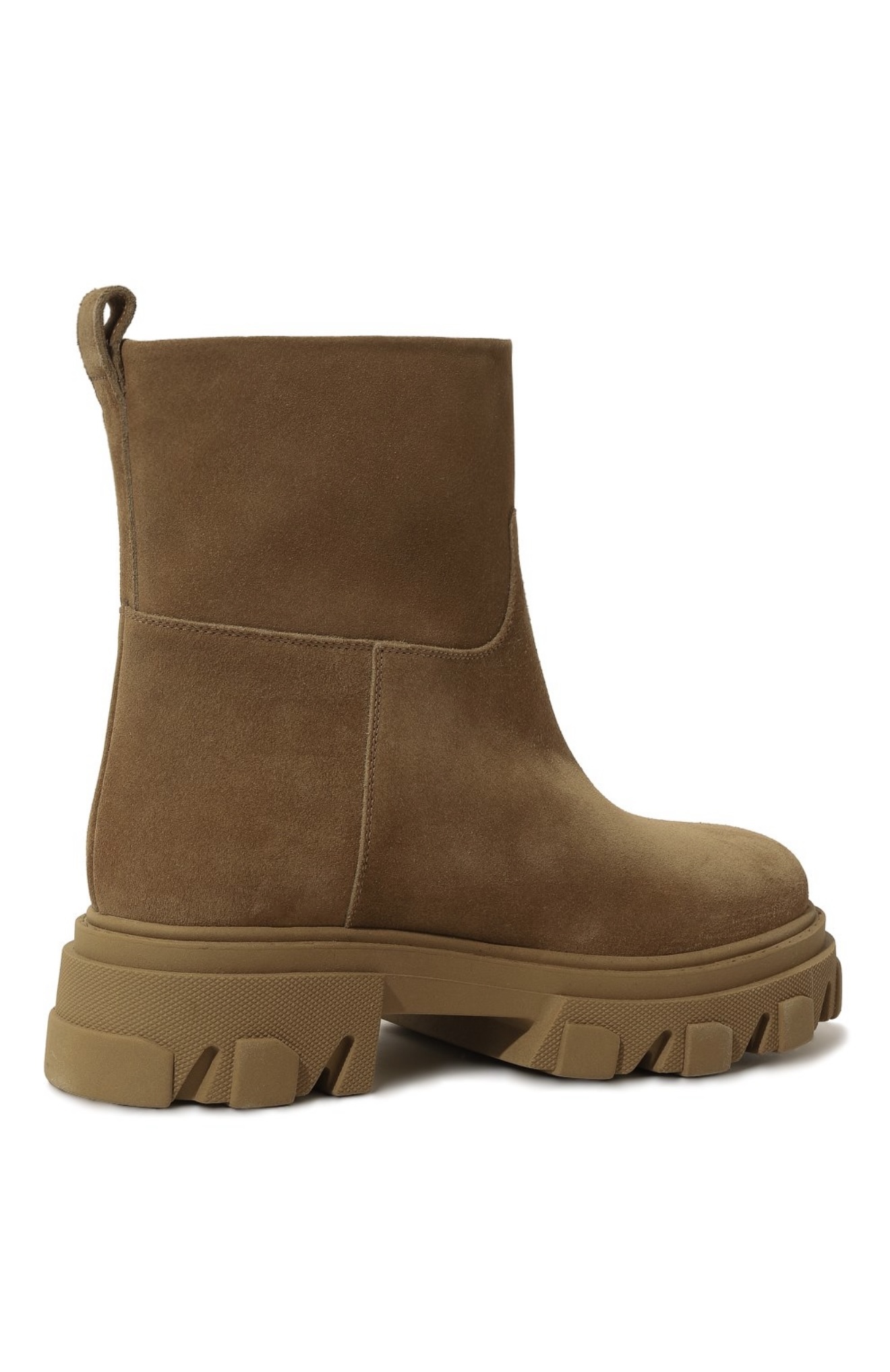 Песочно-бежевые ботинки сшили из мягкой, но при этом прочной замши, на которой будут незаметны царапины. Пару поставили на широкую протекторную подошву, словно позаимствованную у трекинговой обуви. Чтобы модель без молнии было удобнее надевать, на голенище сверху предусмотрели петлю.